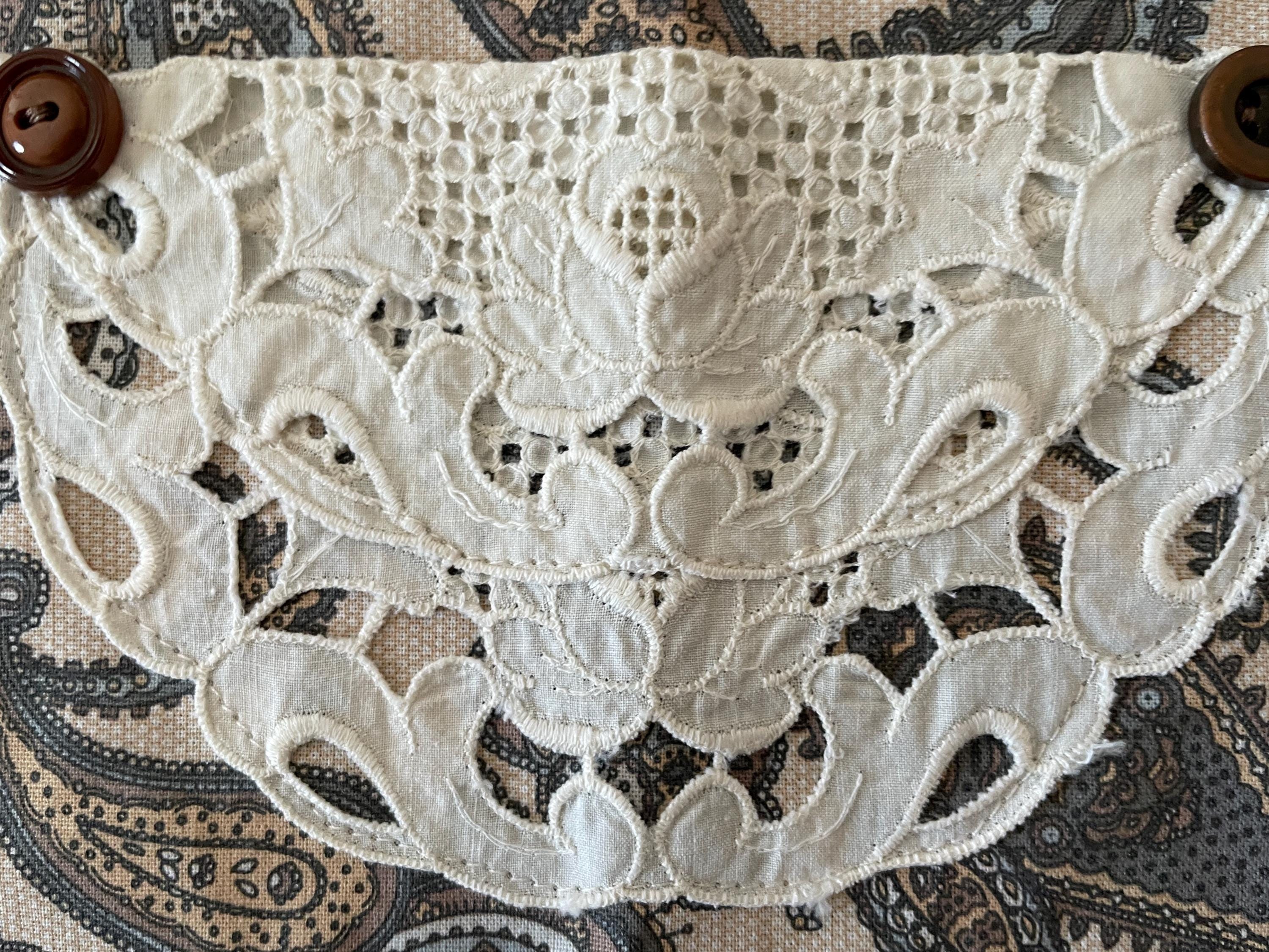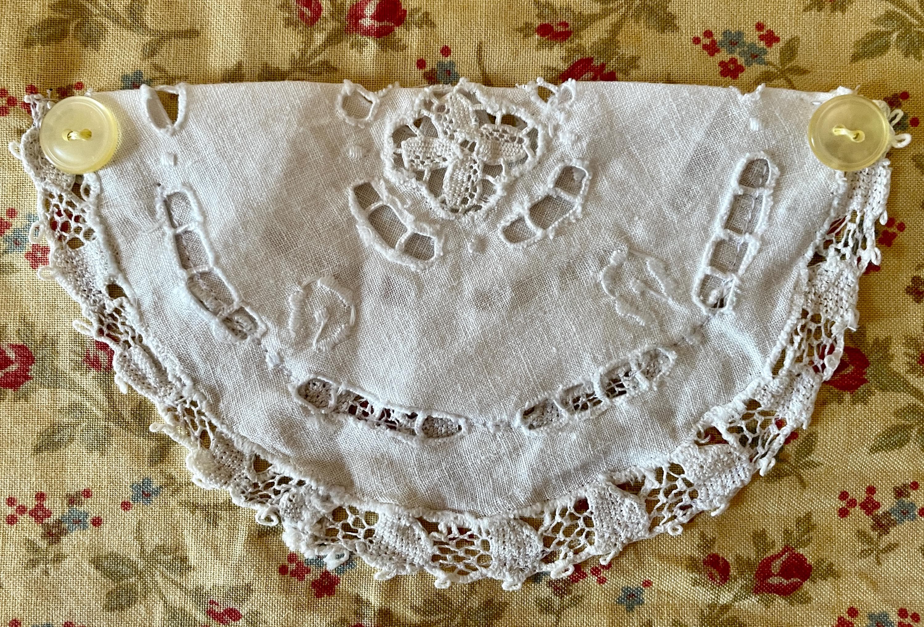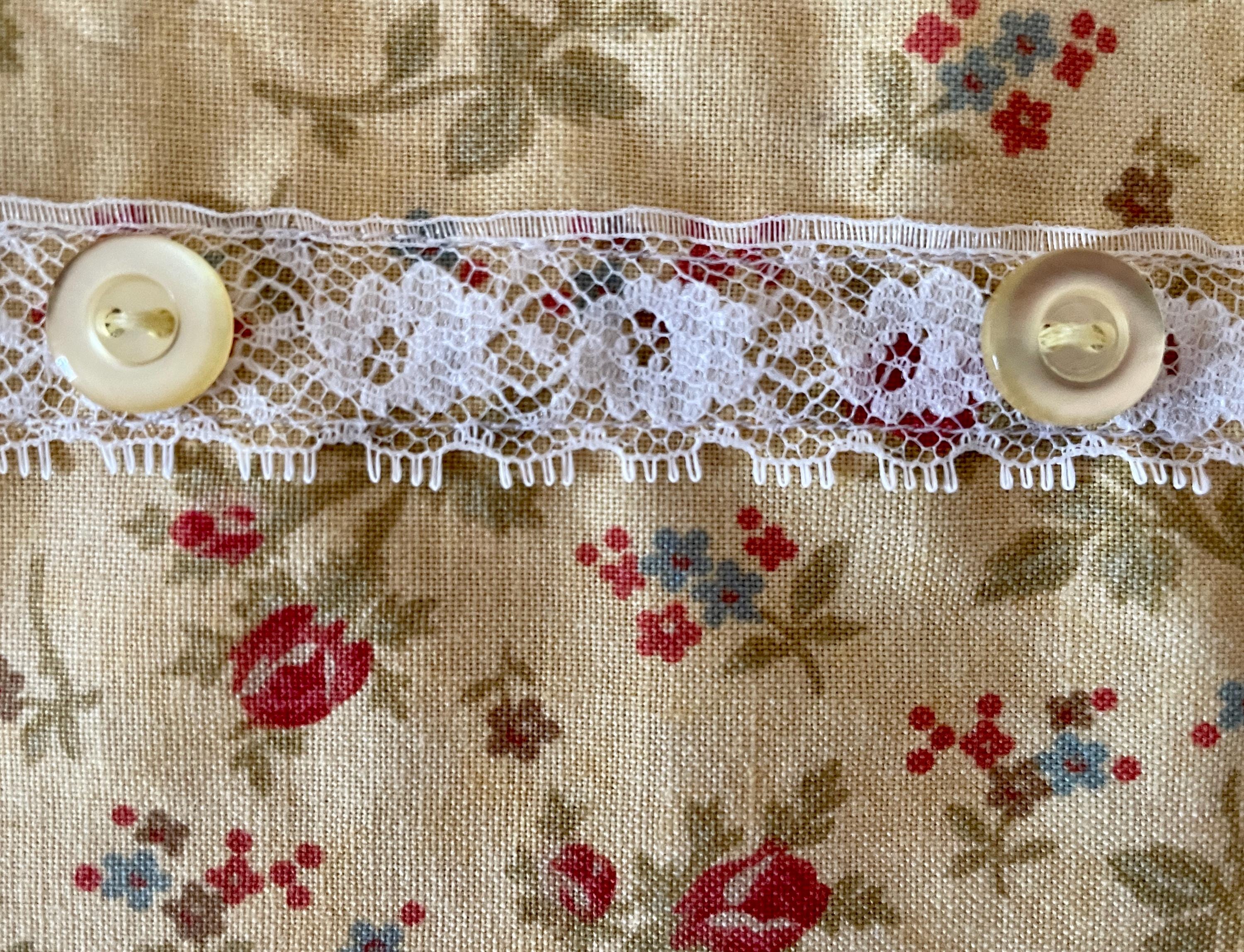 The aprons feature pockets made from vintage white cotton doilies. White lace goes across both the apron skirts and the bodices. Buttons are on the bodice laces and at the pocket corners. The aprons are trimmed in colors similar to the vintage fabric and tie at both the waist and neckline.