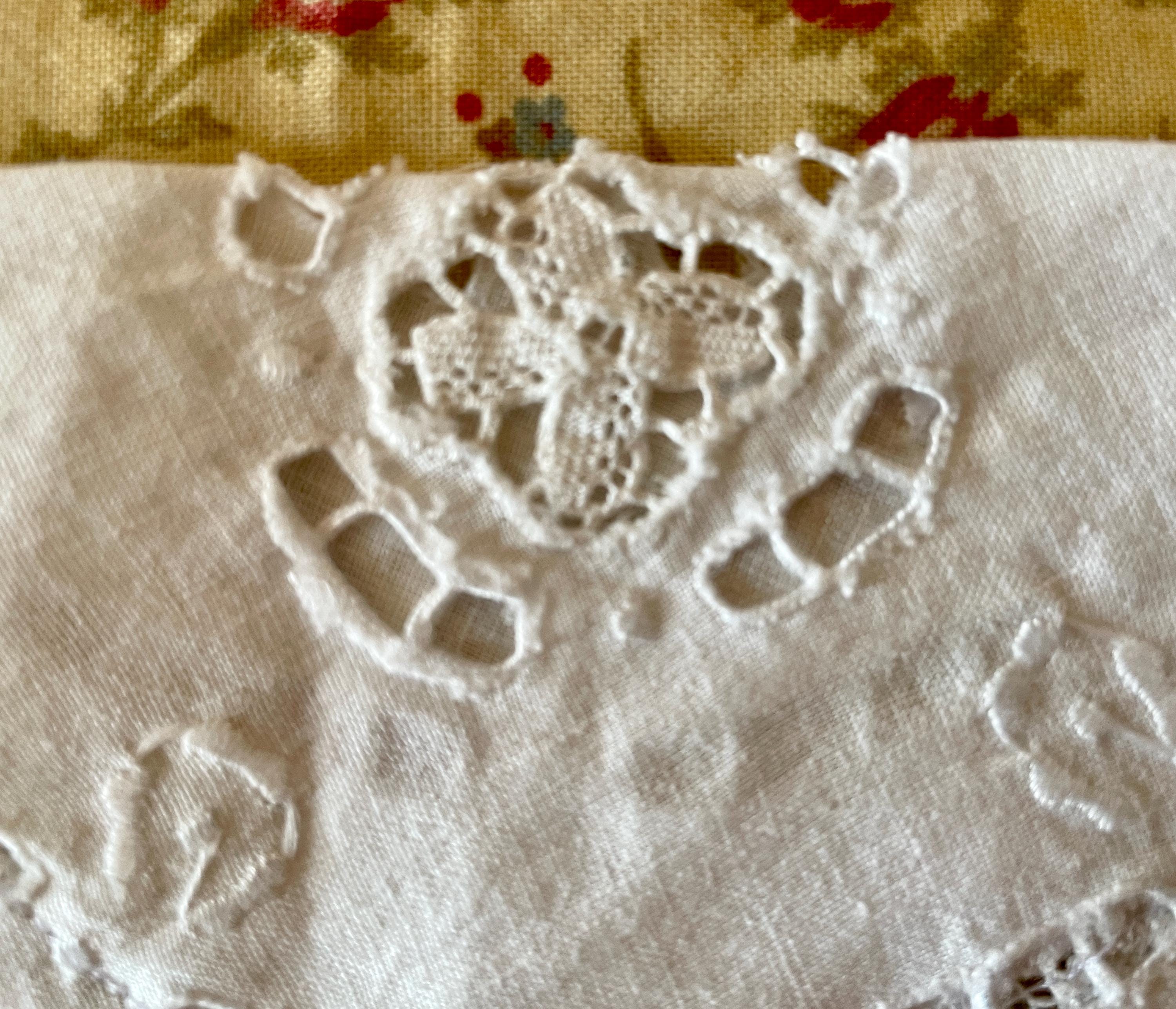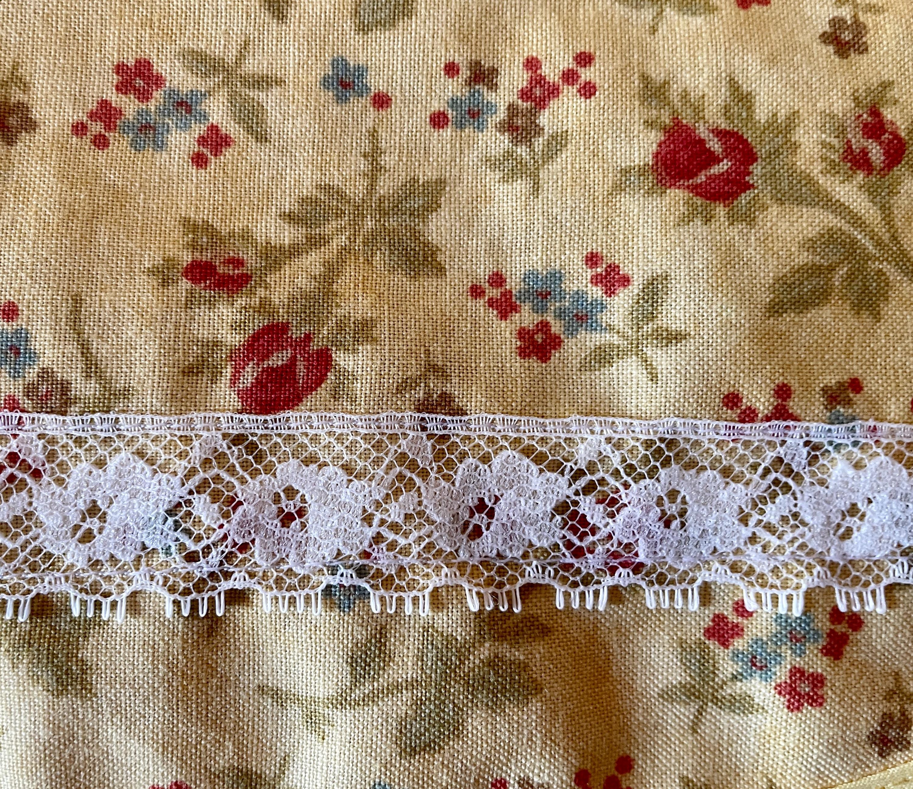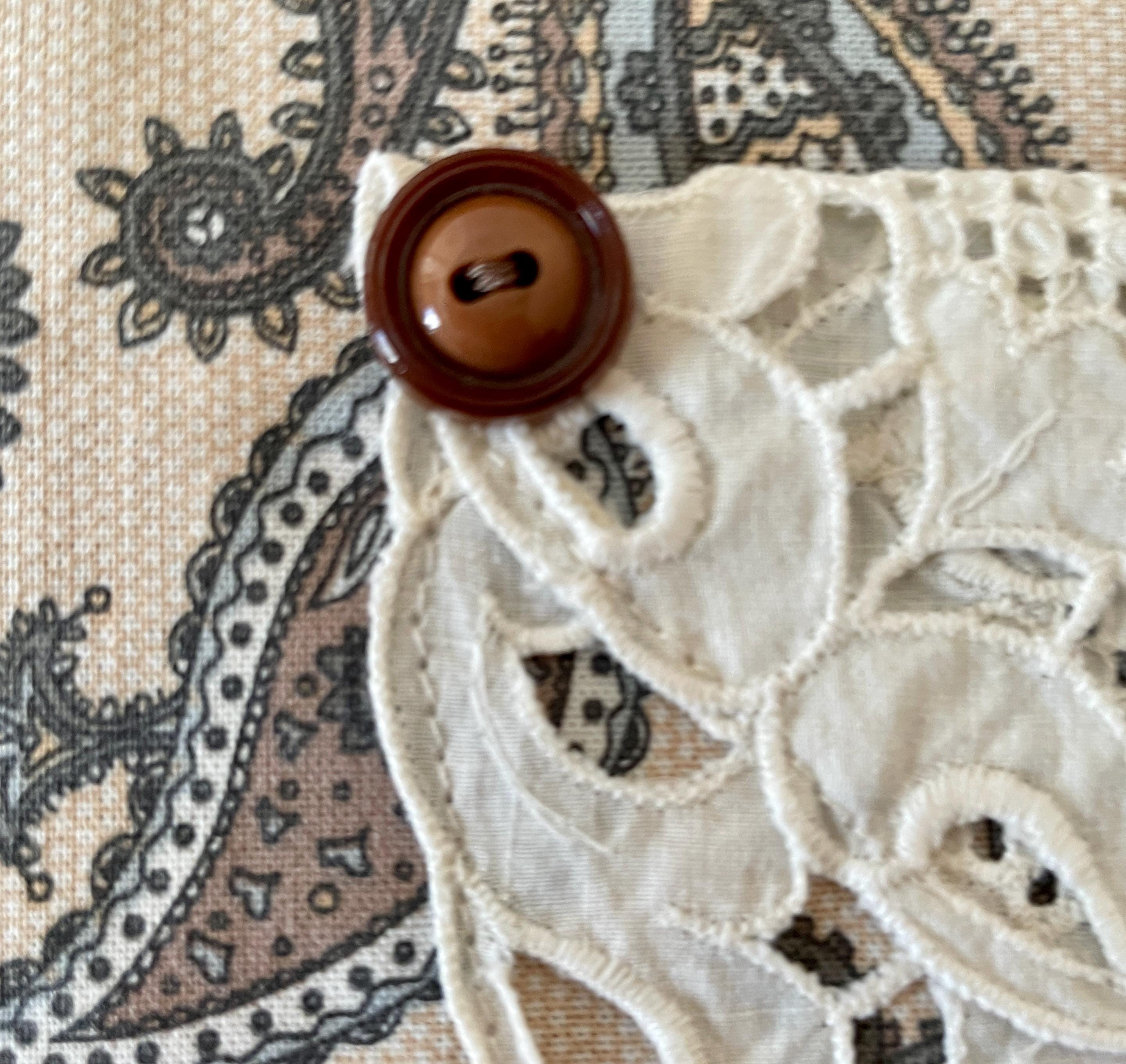 The aprons feature pockets made from vintage white cotton doilies. White lace goes across both the apron skirts and the bodices. Buttons are on the bodice laces and at the pocket corners. The aprons are trimmed in colors similar to the vintage fabric and tie at both the waist and neckline.
