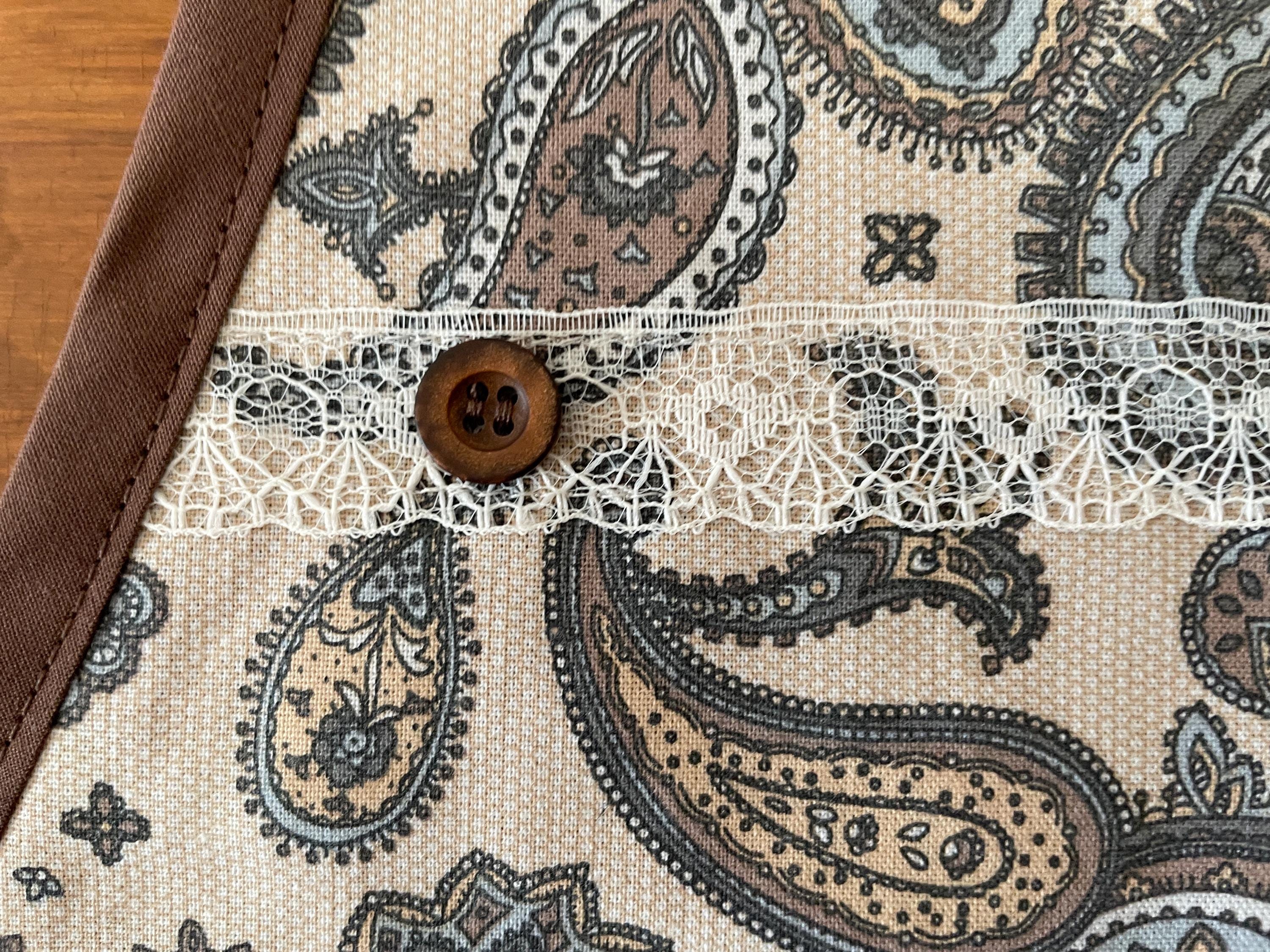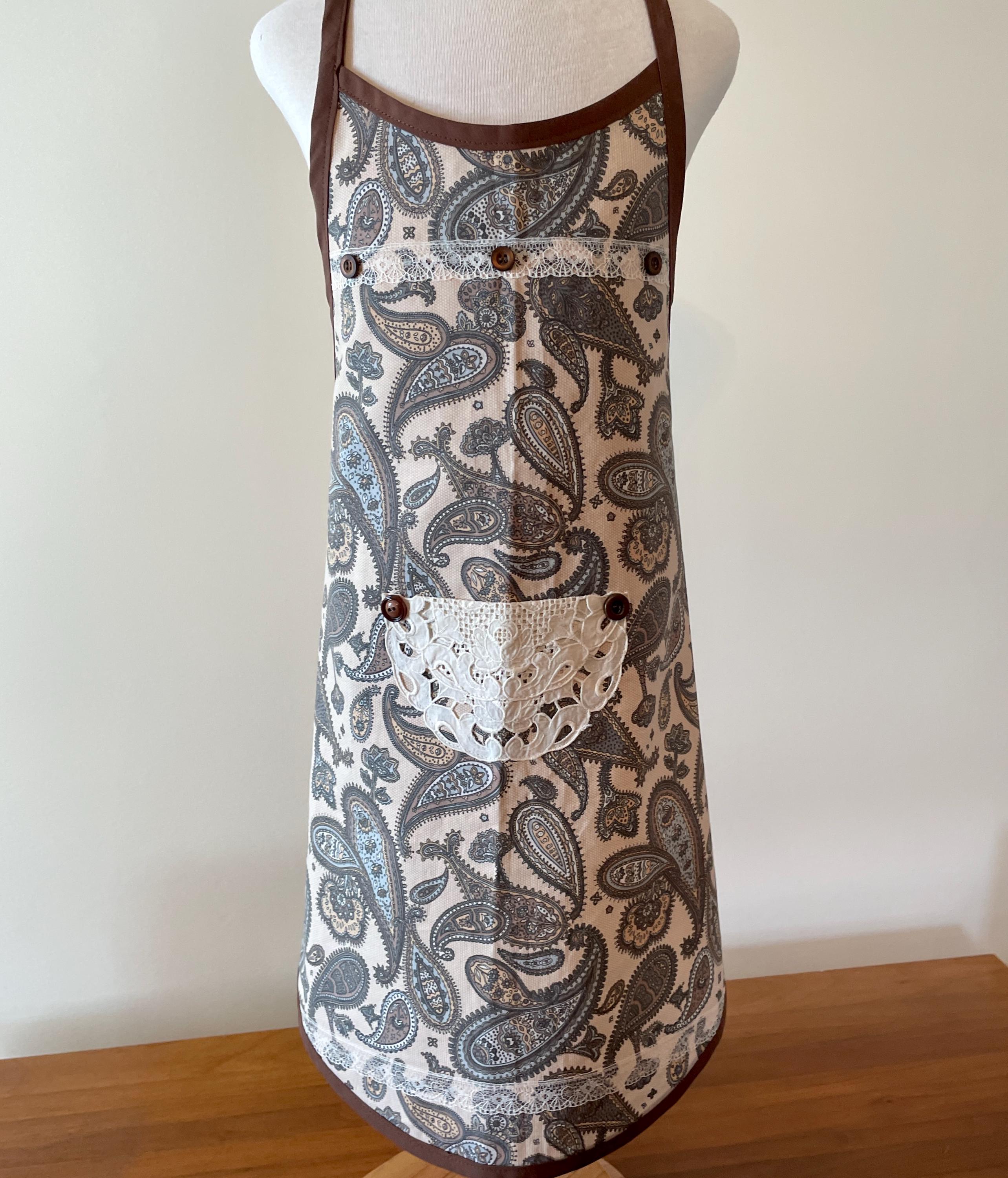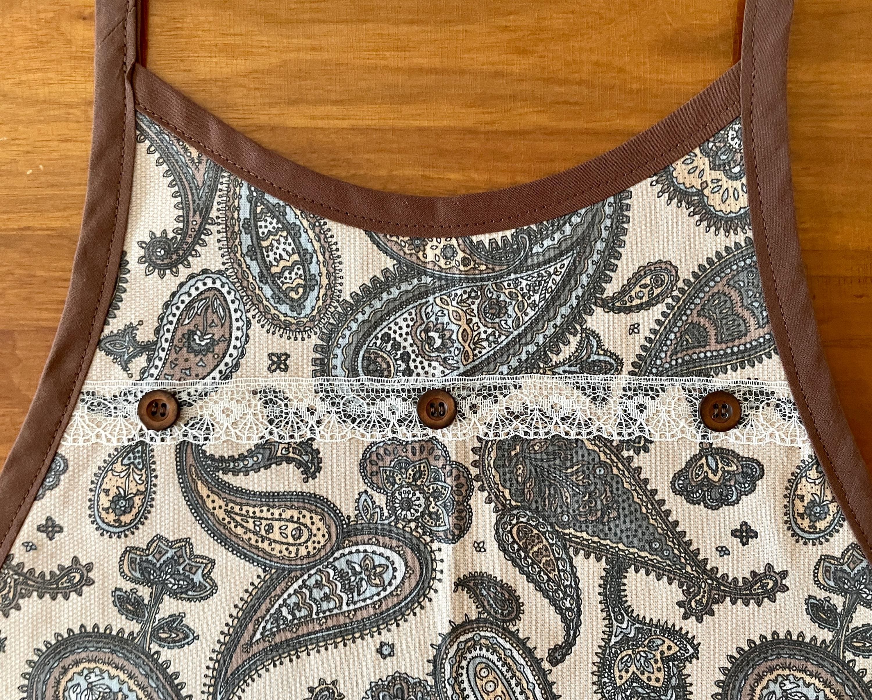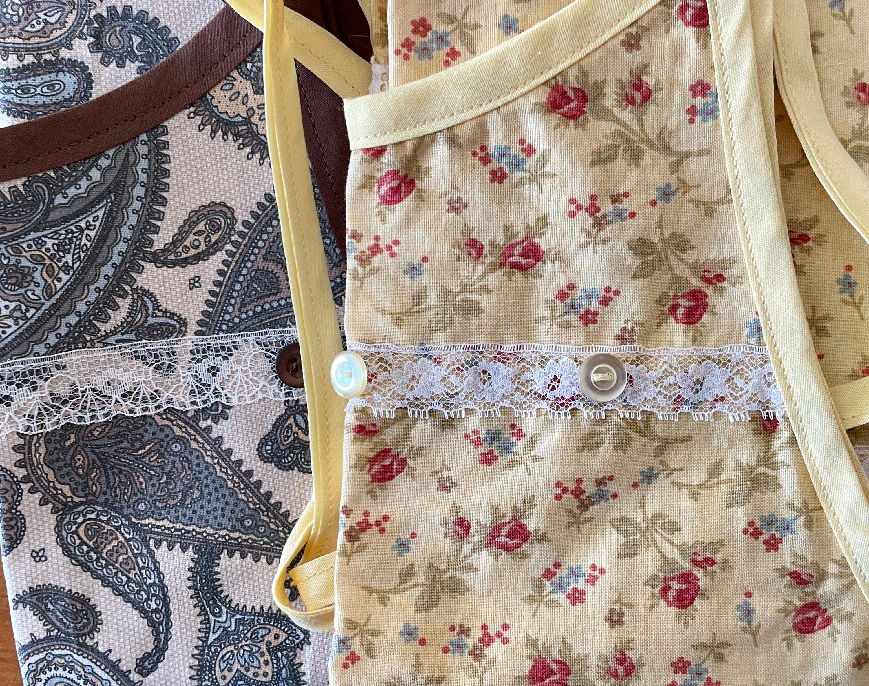 Both aprons are made from vintage fabrics. The first print has a beige background hosting paisley patterns in browns, blues and soft golds. The other apron has pink flowers scattered on a light yellow background.