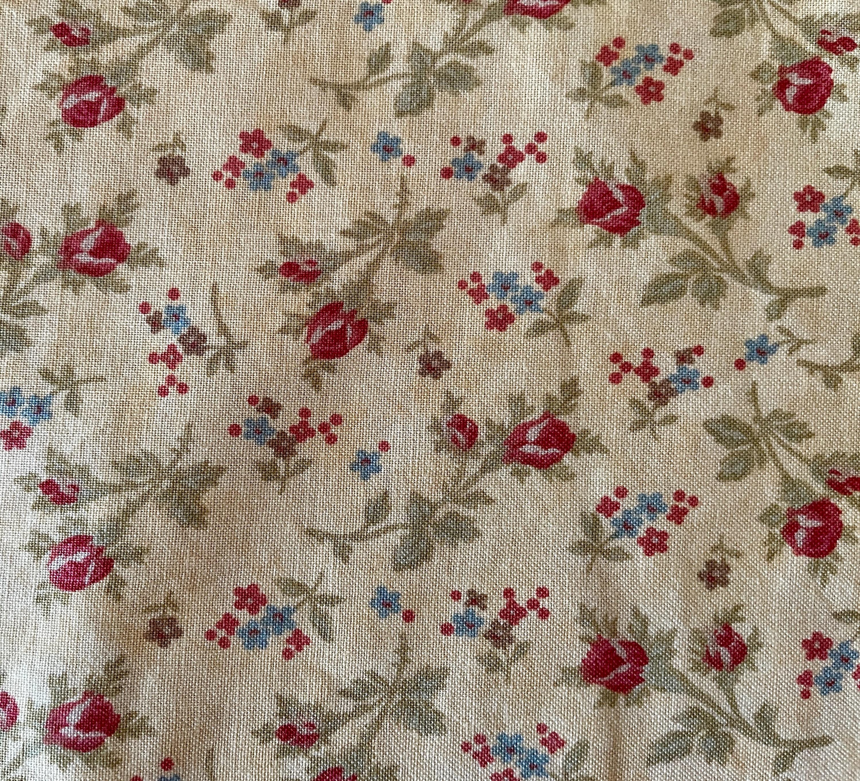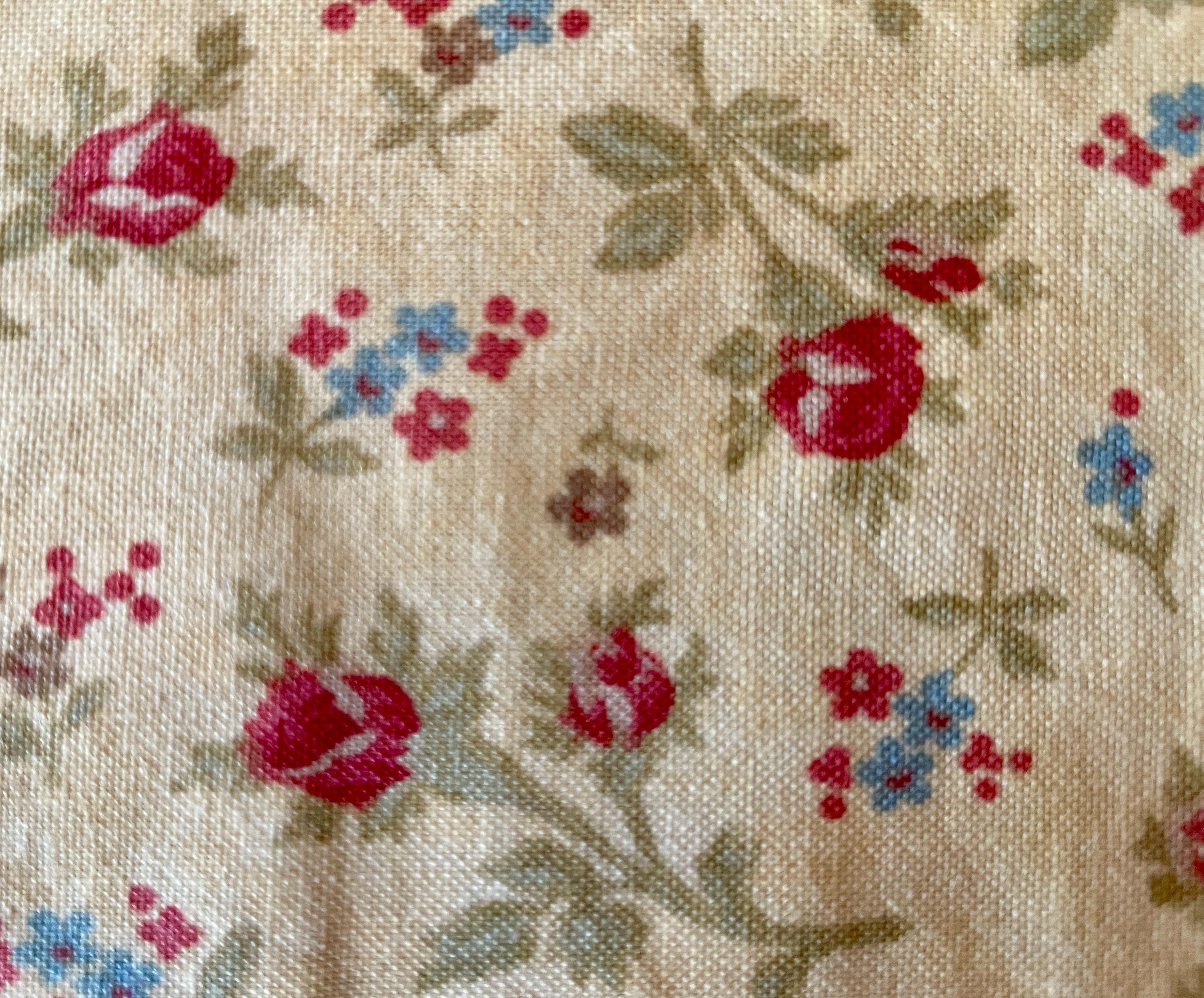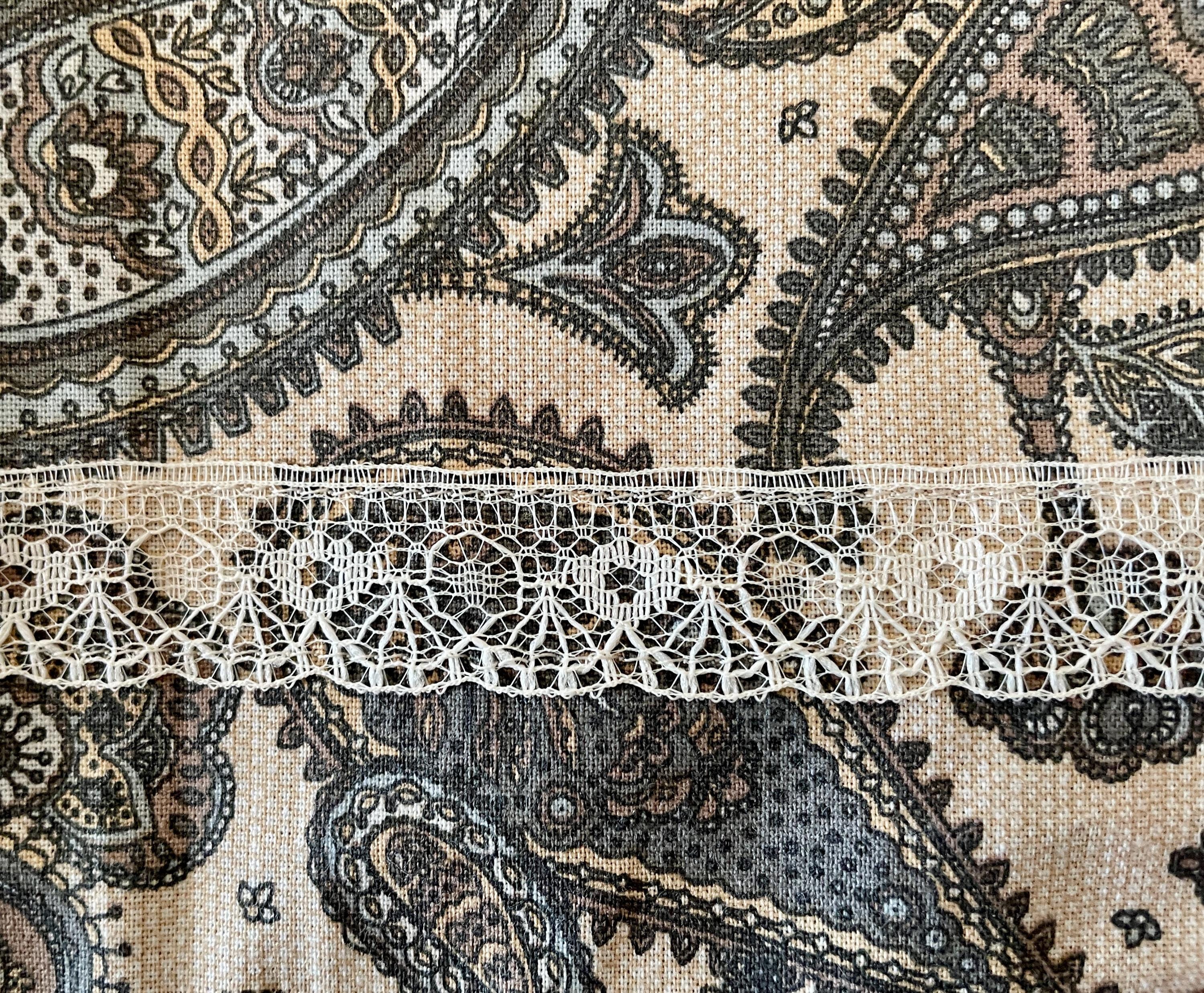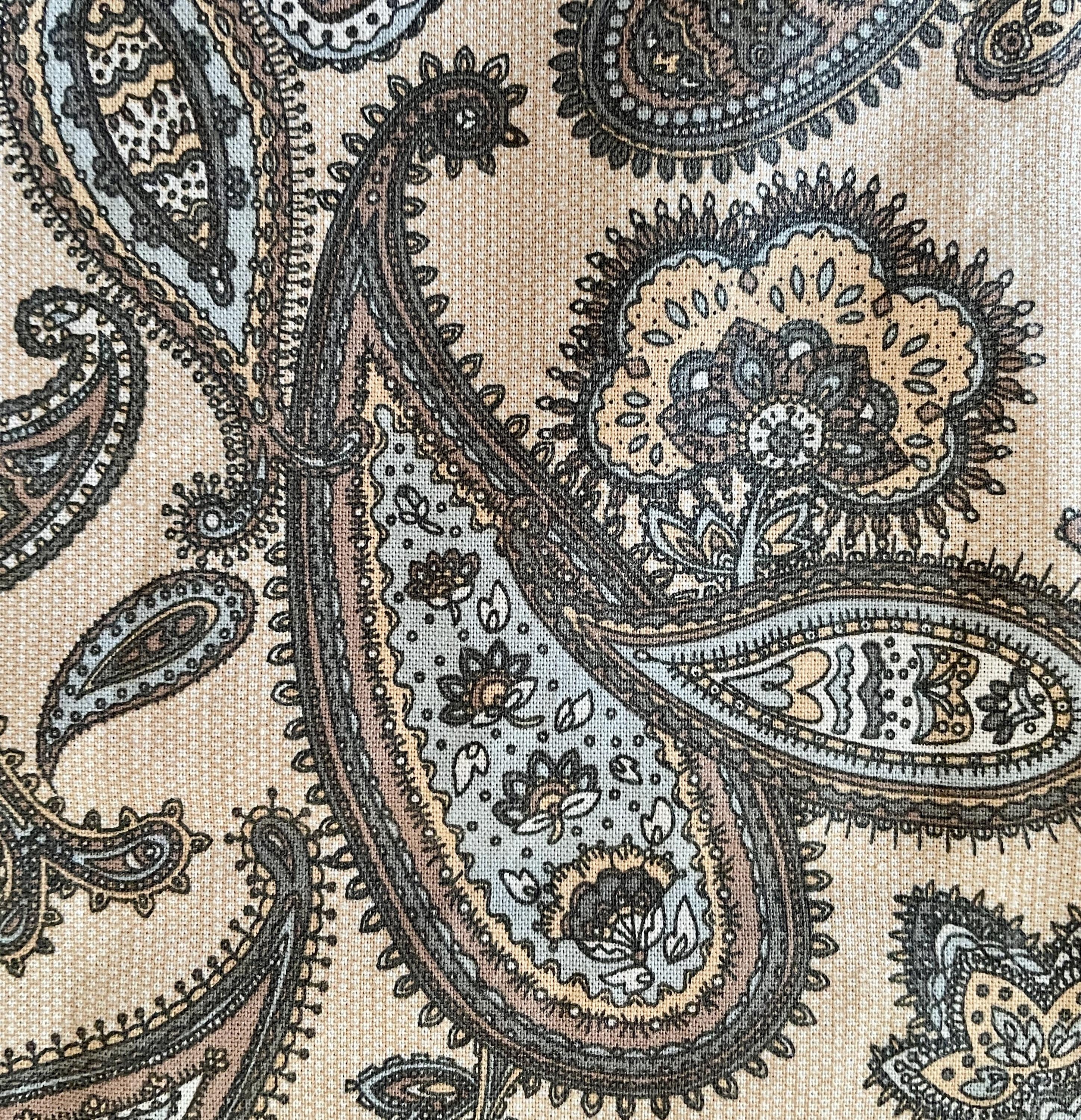 Both aprons are made from vintage fabrics. The first print has a beige background hosting paisley patterns in browns, blues and soft golds. The other apron has pink flowers scattered on a light yellow background.