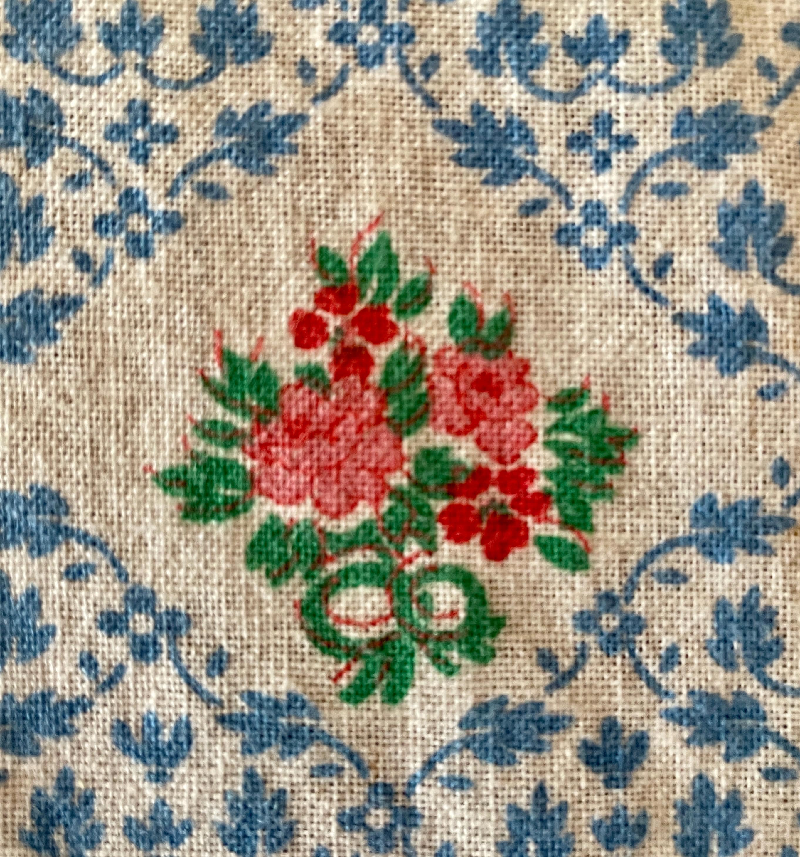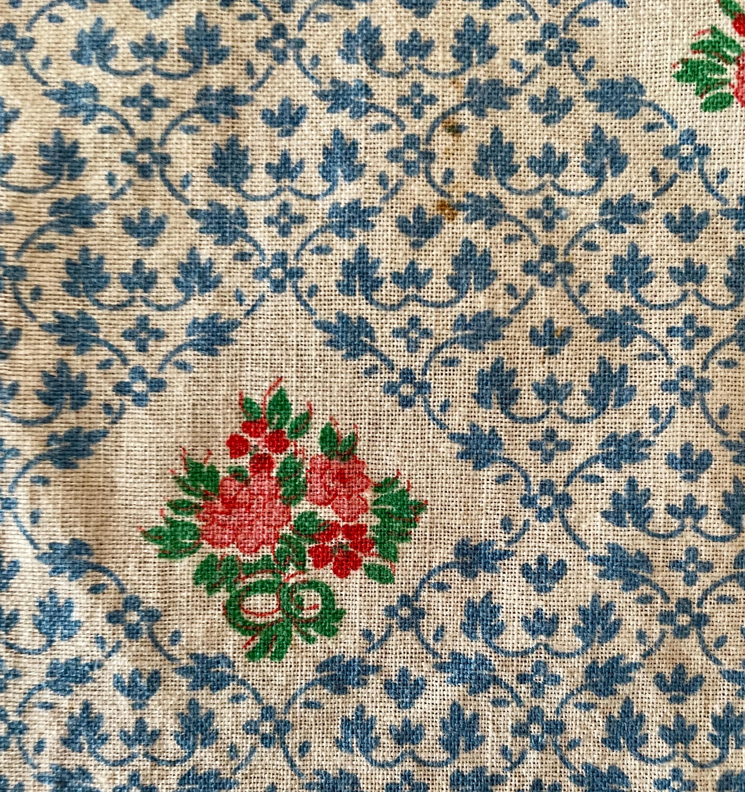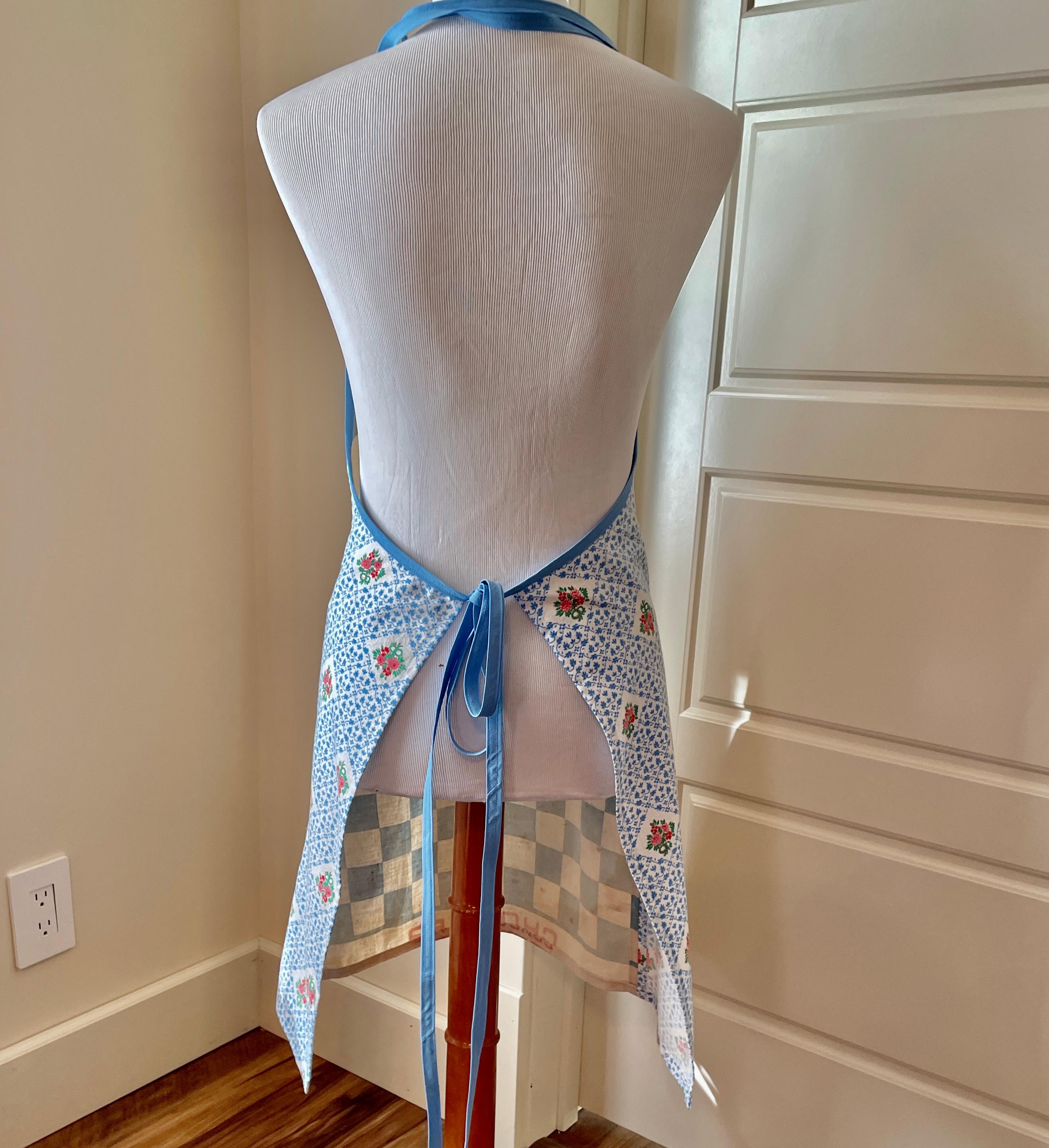 The print is in both red and beige. The sides of the apron are created from authentic vintage flour sack. The design has a white background with a leaf and floral print. Pink and green flowers stand out among the leaves. The apron is trimmed in blue. To adjust the length, simply place a knot in the neck tie where desired.