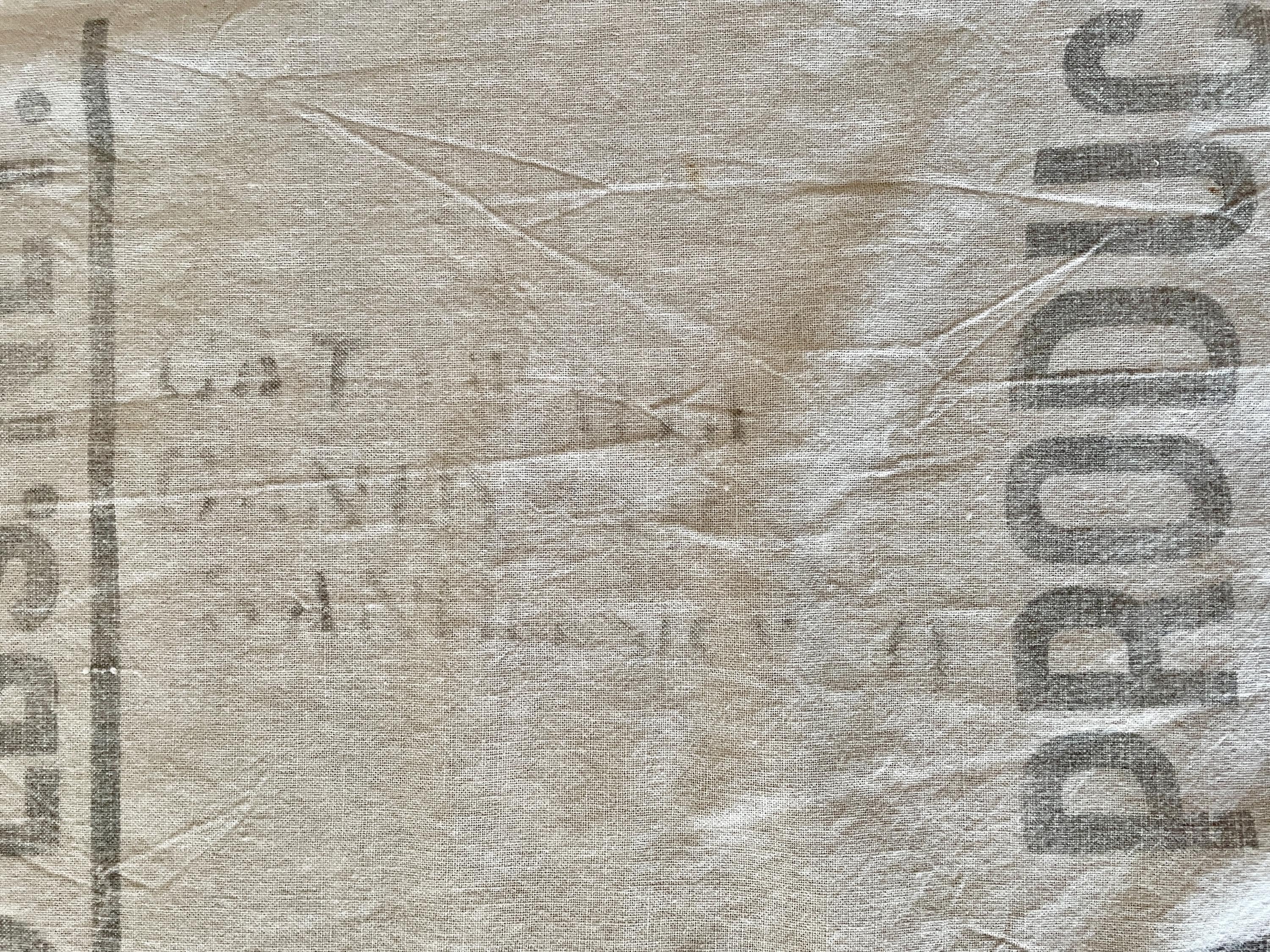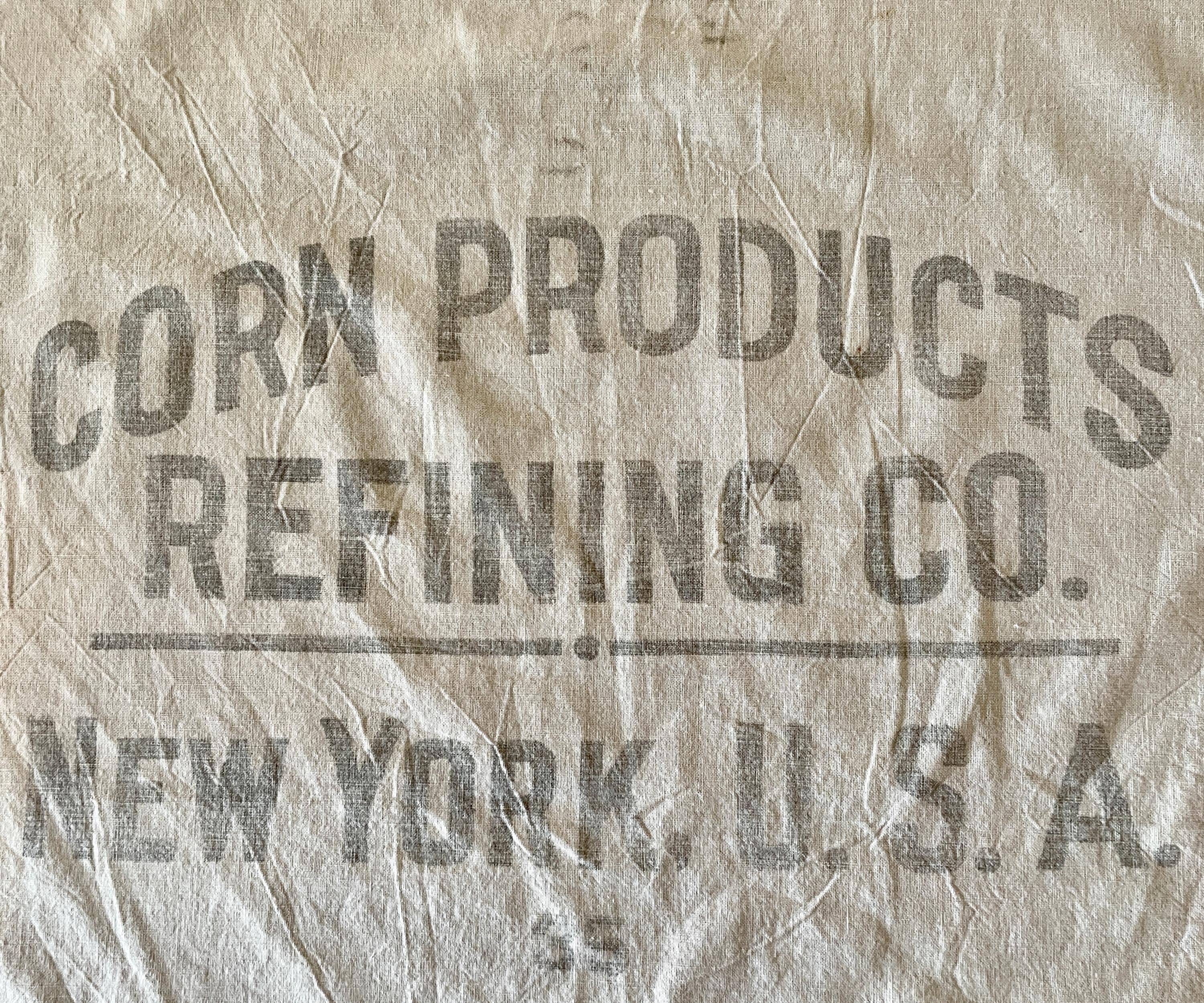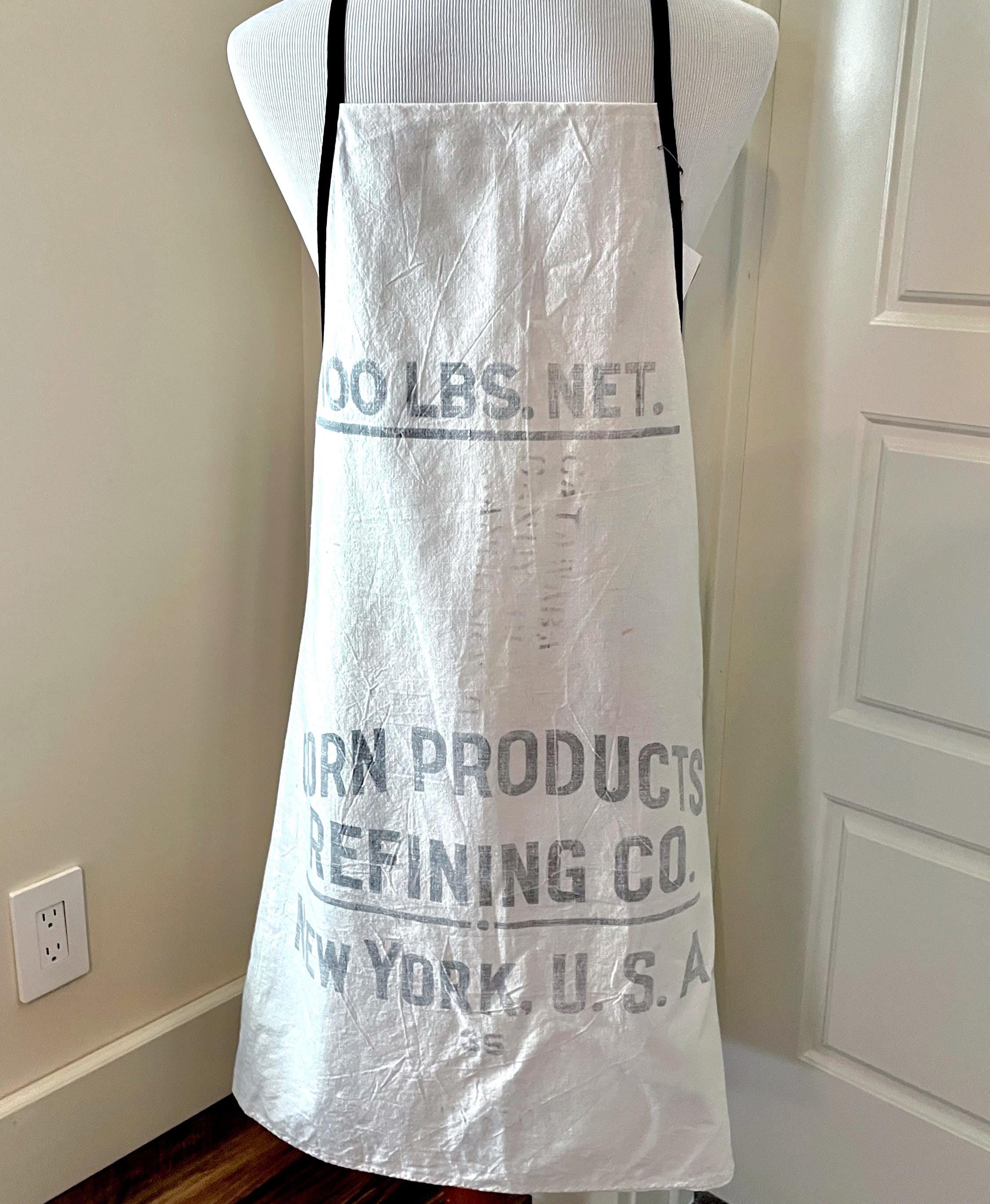 Possibly either corn meal or grits were once contained in the vintage cloth sack used to create this apron.