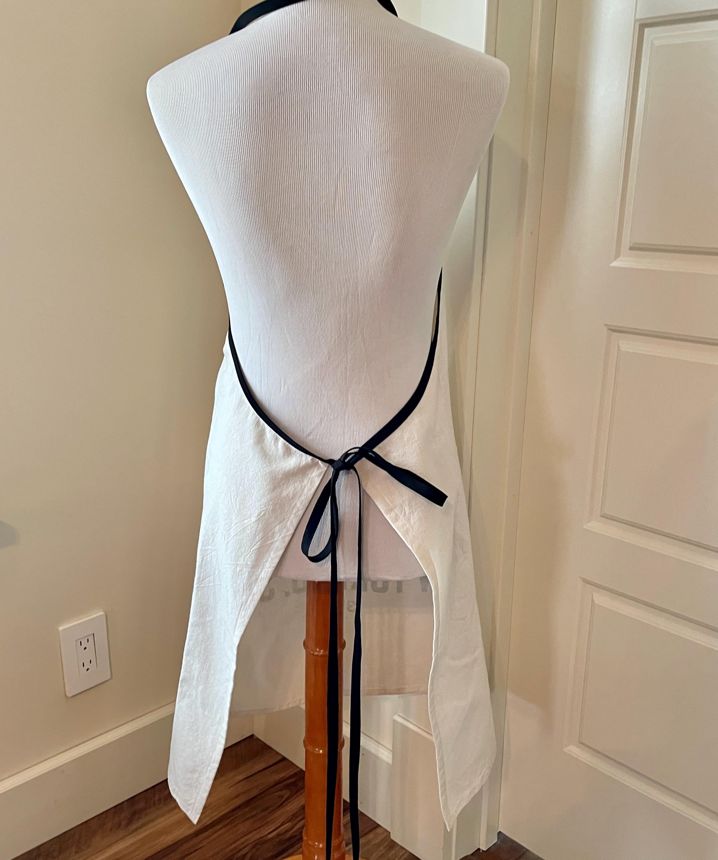 The apron is trimmed in black. To adjust the length, simply place a knot in the neck tie where desired.