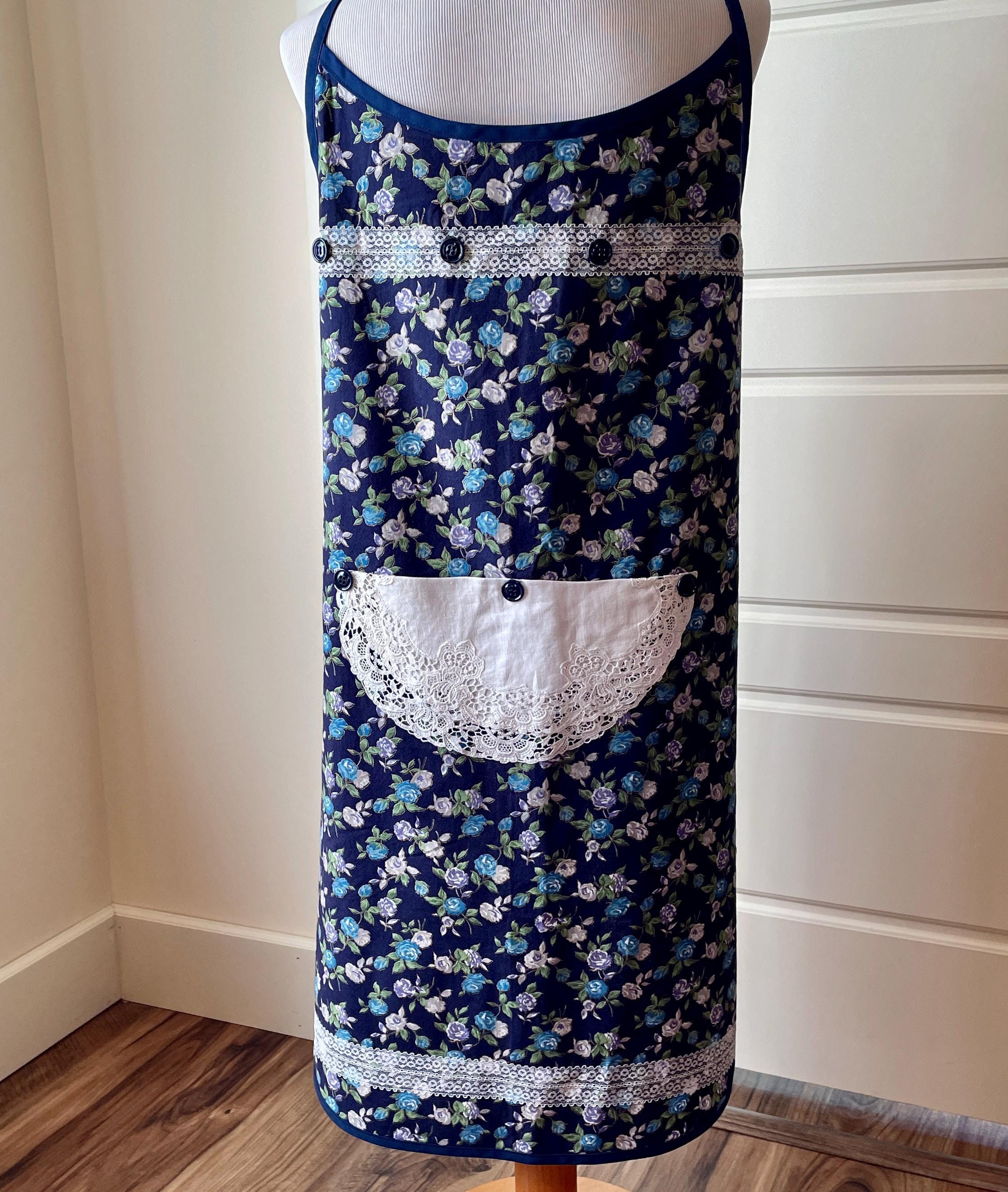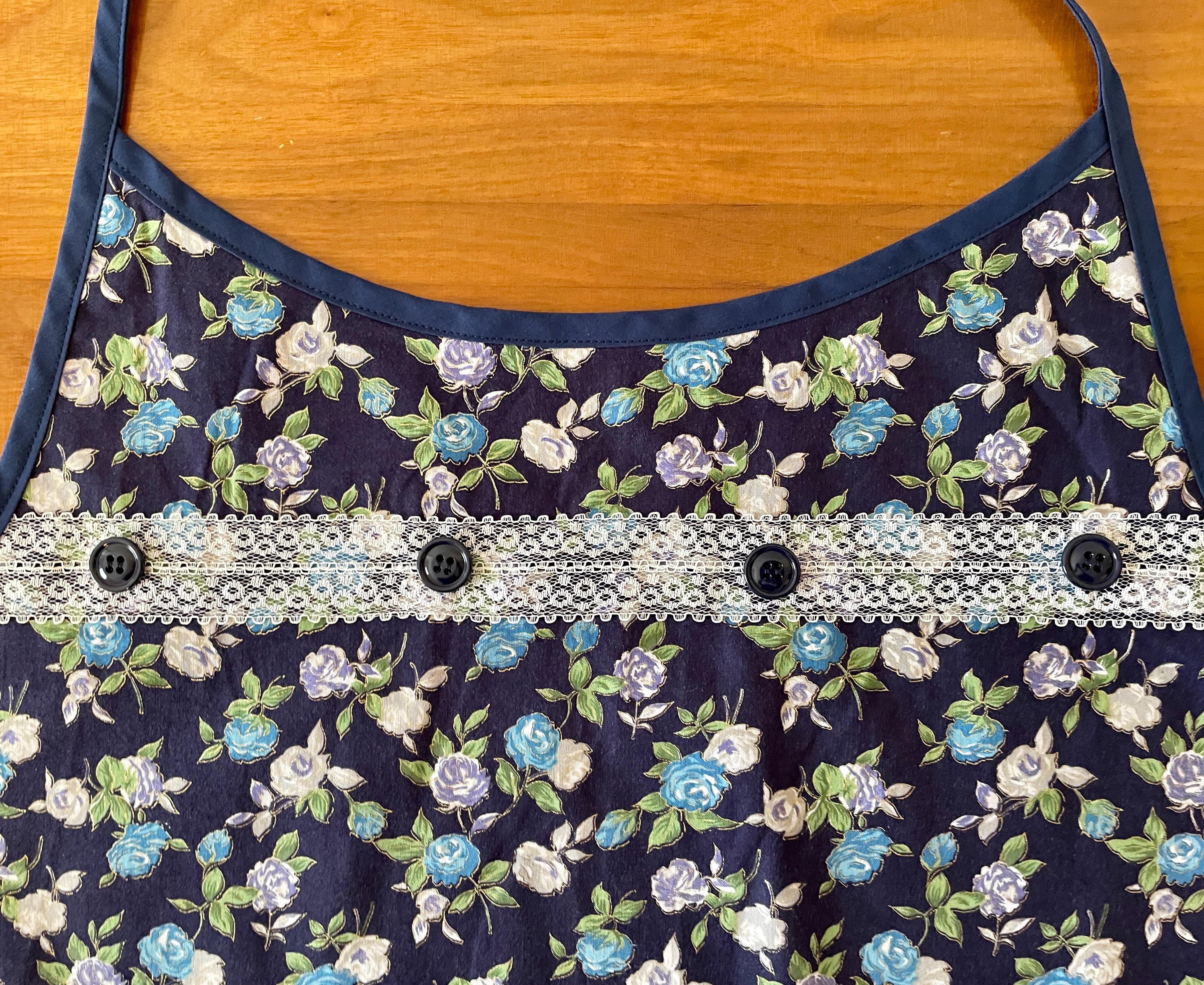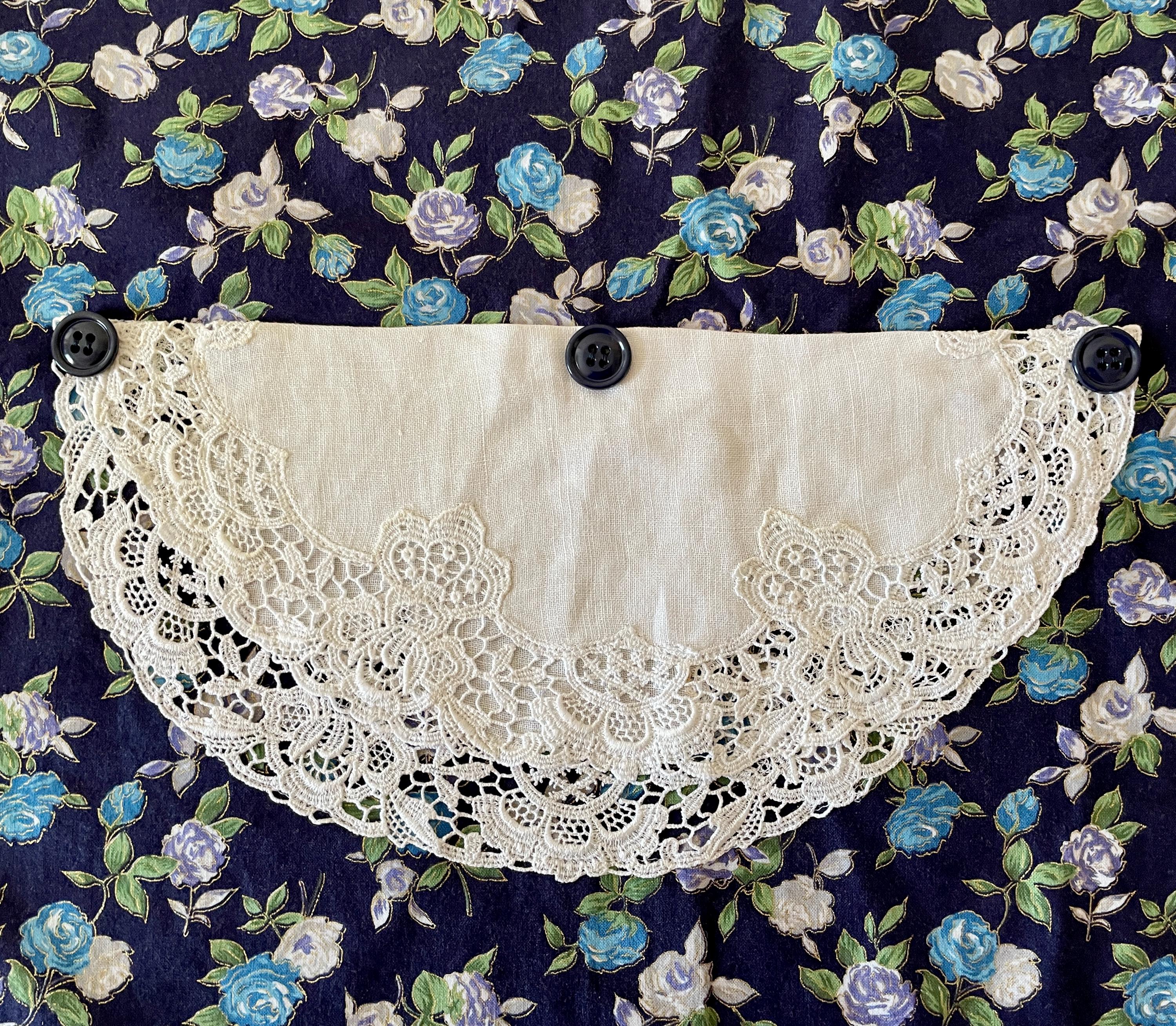 The apron pocket is created from a vintage white doily with lace edging. Navy buttons highlight the pocket top. A wide white lace floral trim goes across both the bodice and the skirt. Navy buttons are on the bodice lace. The apron is trimmed in navy and ties at the waist. The single neck tie can be knotted where desired to adjust the apron length.