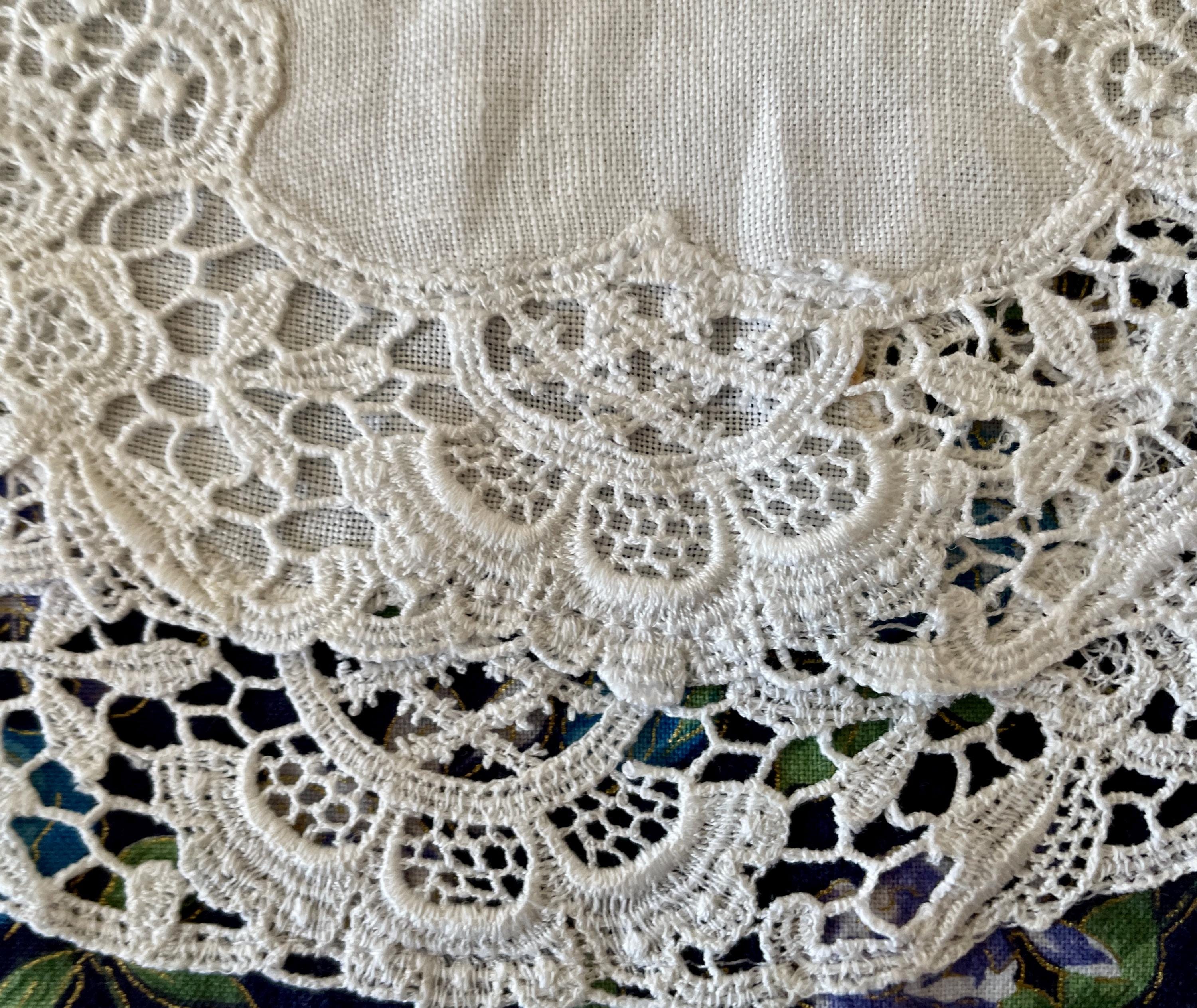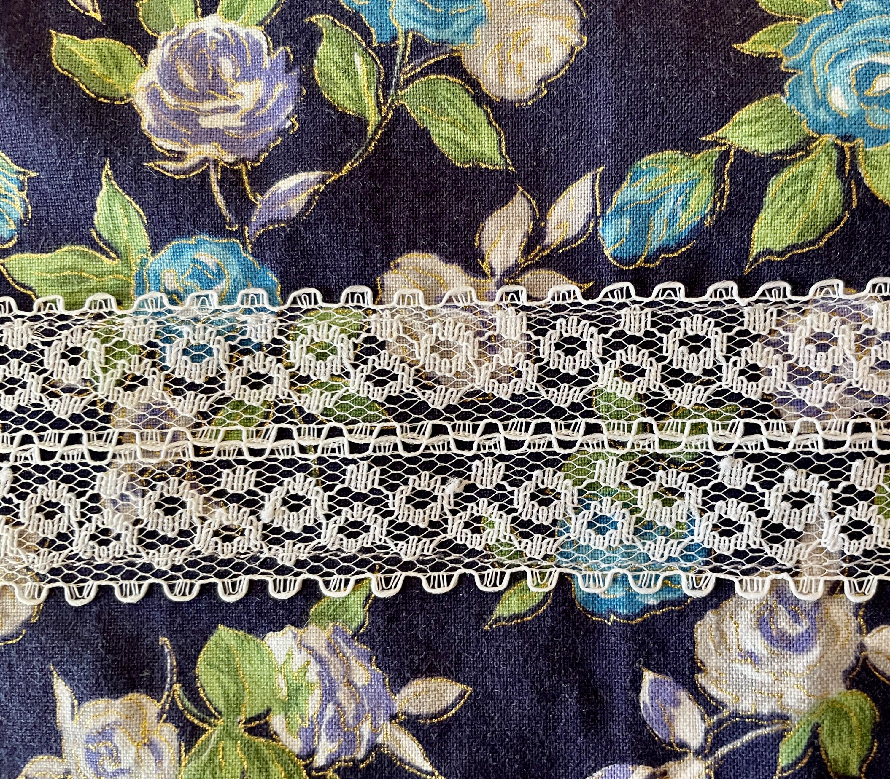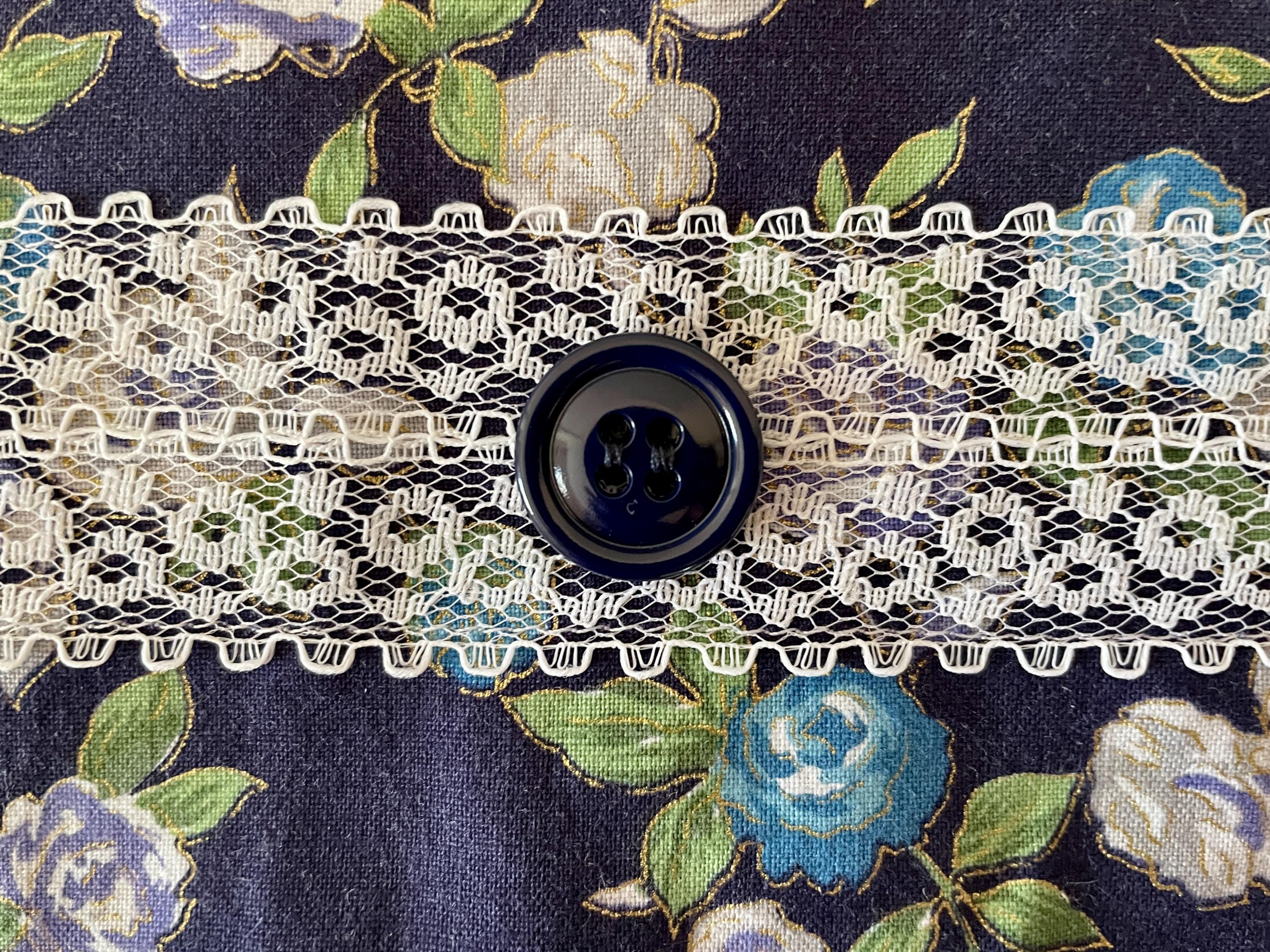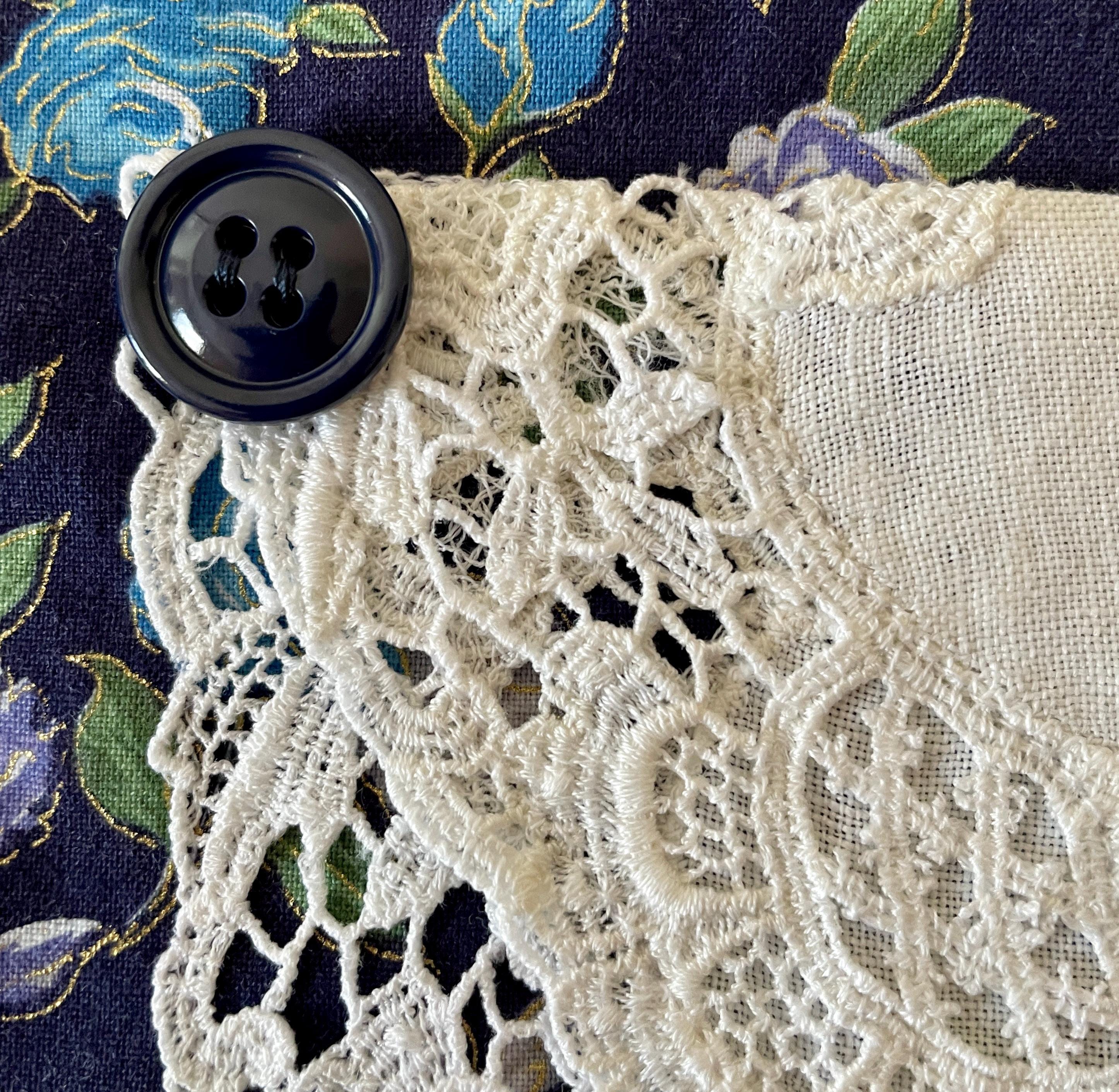 The apron pocket is created from a vintage white doily with lace edging. Navy buttons highlight the pocket top. A wide white lace floral trim goes across both the bodice and the skirt. Navy buttons are on the bodice lace. The apron is trimmed in navy and ties at the waist. The single neck tie can be knotted where desired to adjust the apron length.