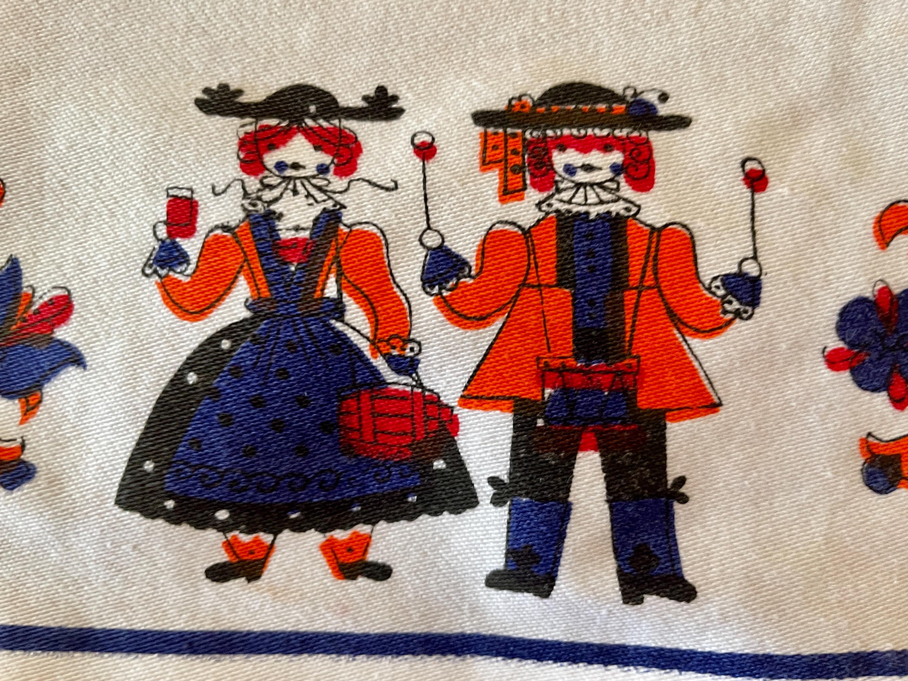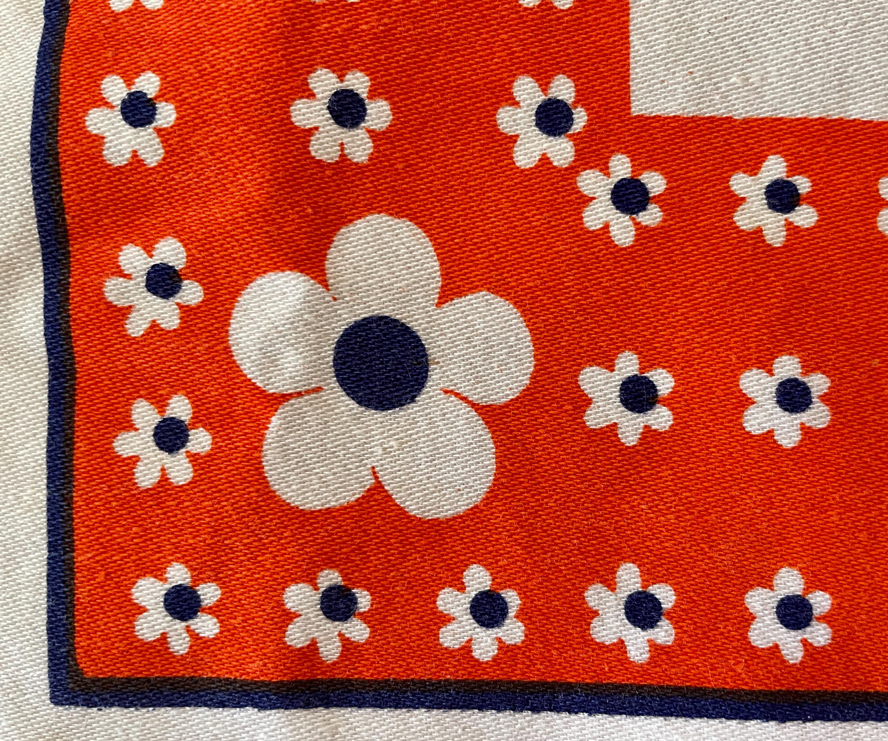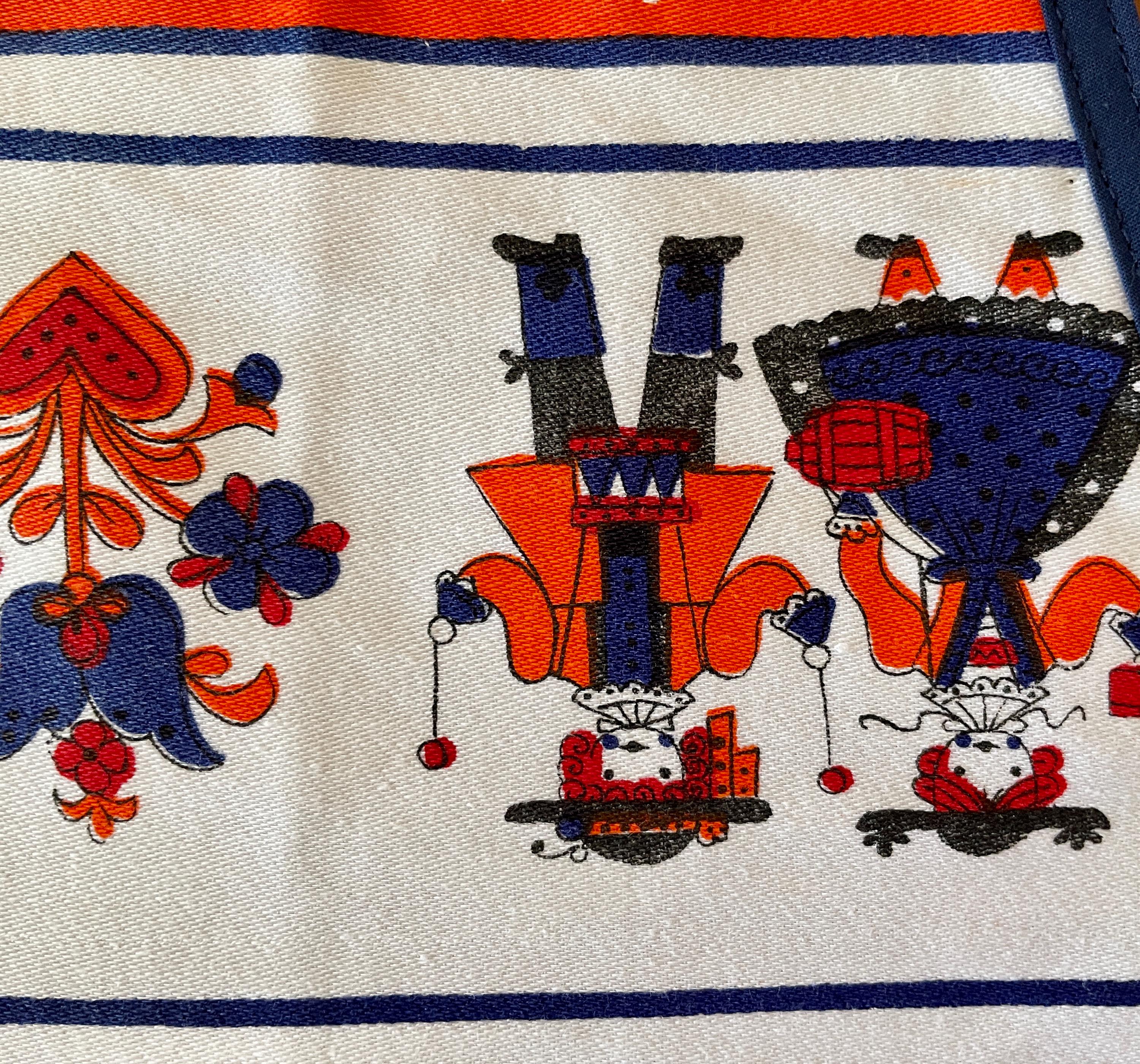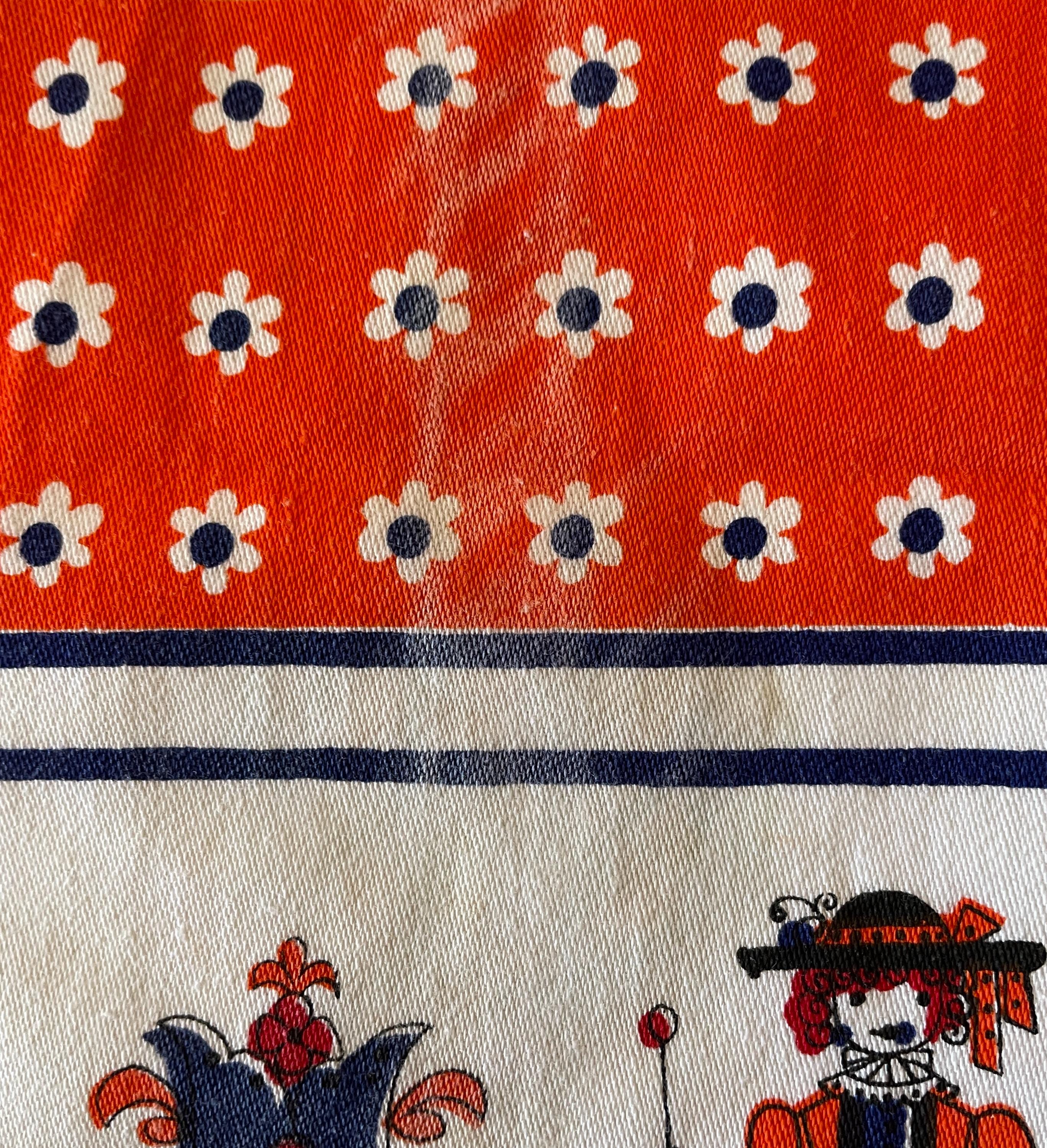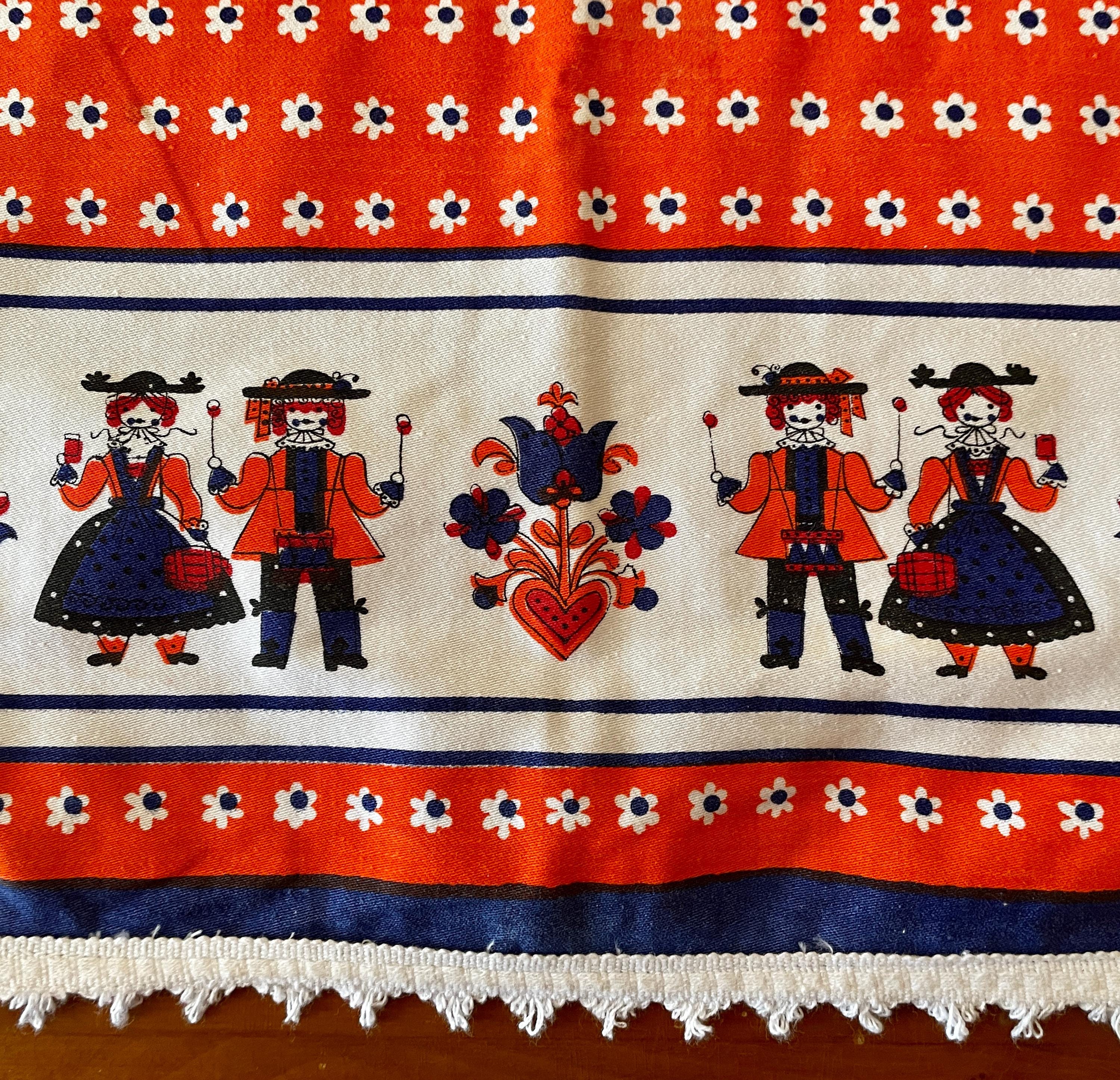 Orange and royal blue combine in this upcycled vintage tablecloth that features a Dutch design.