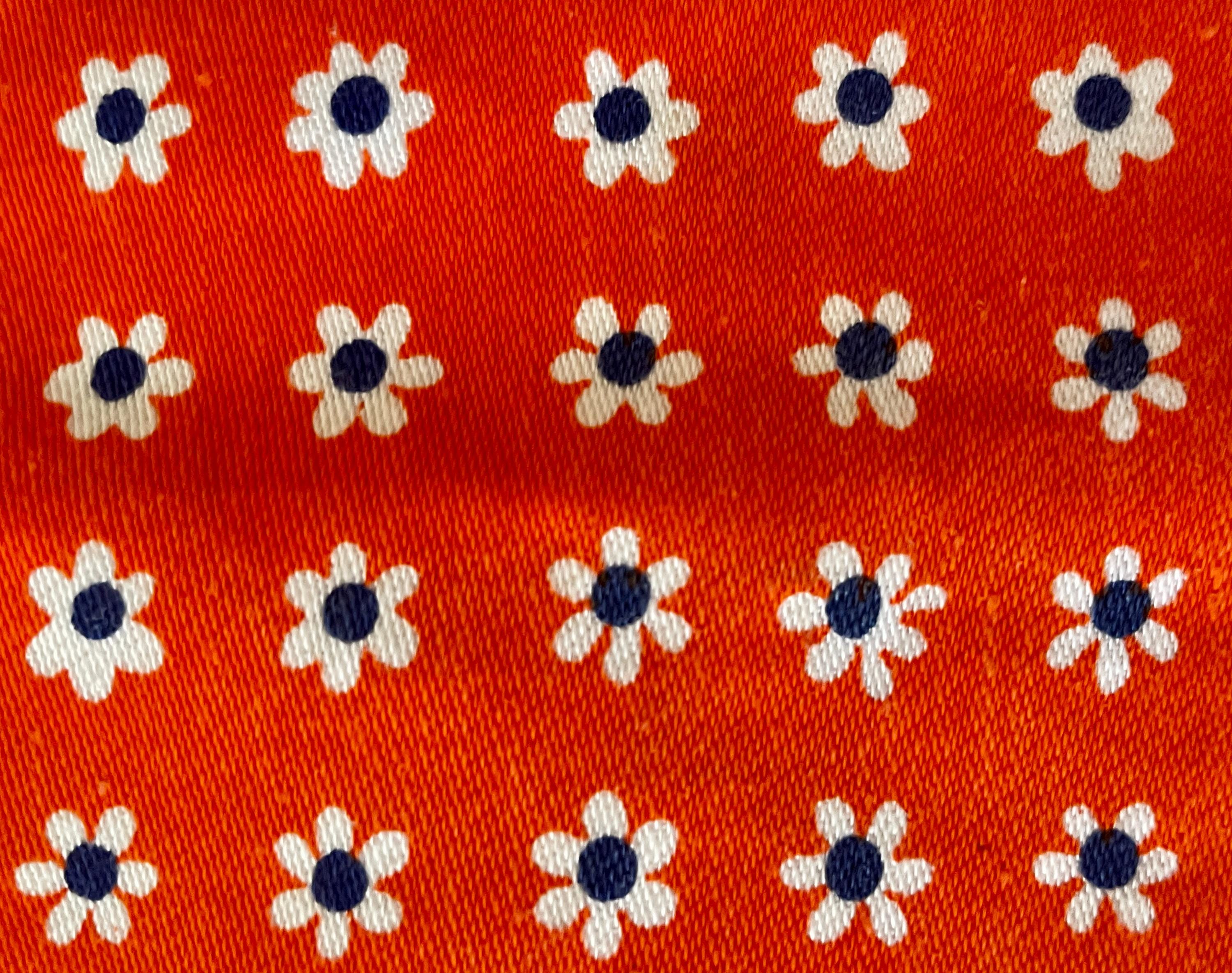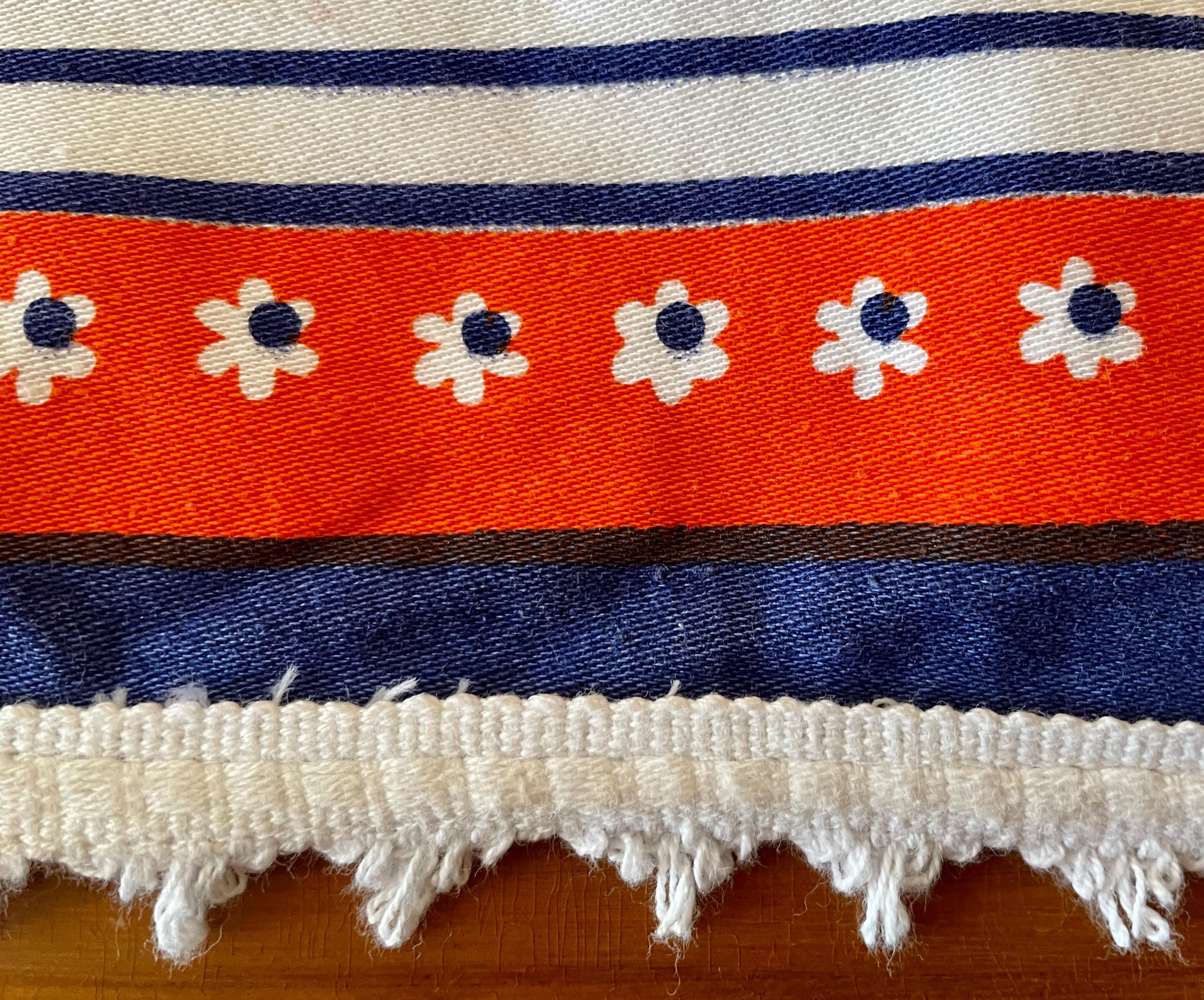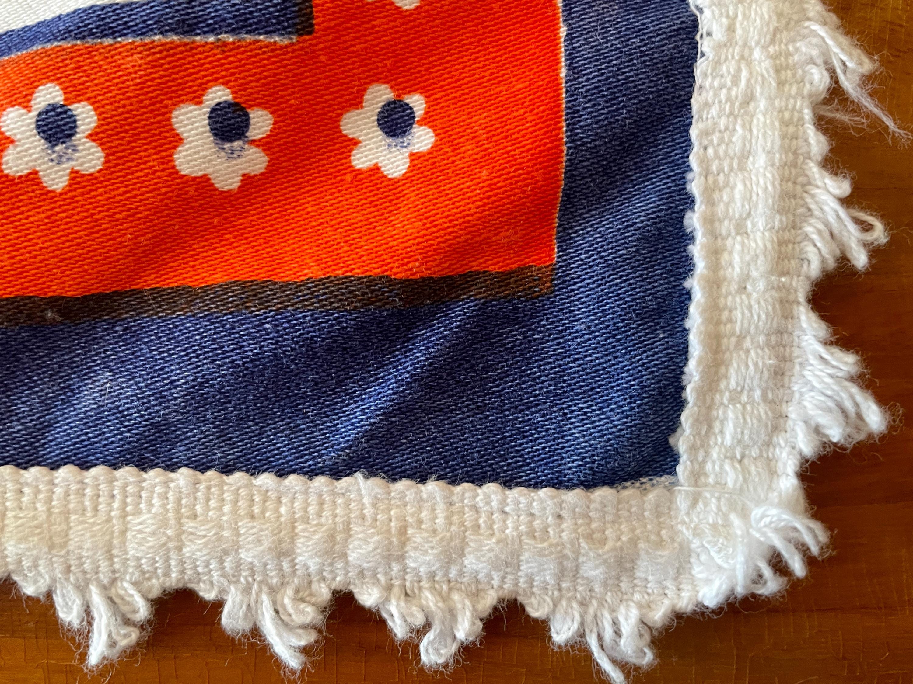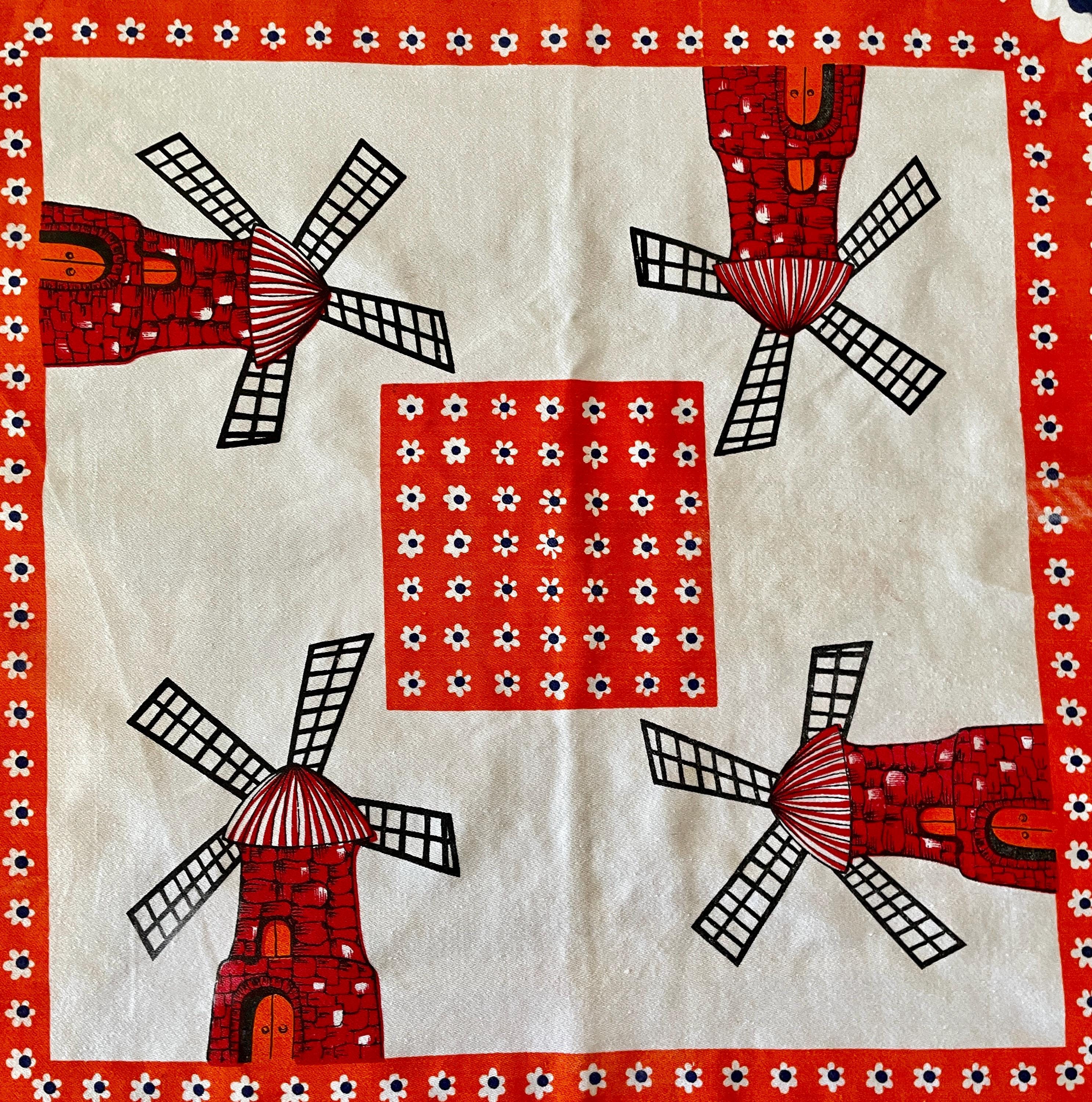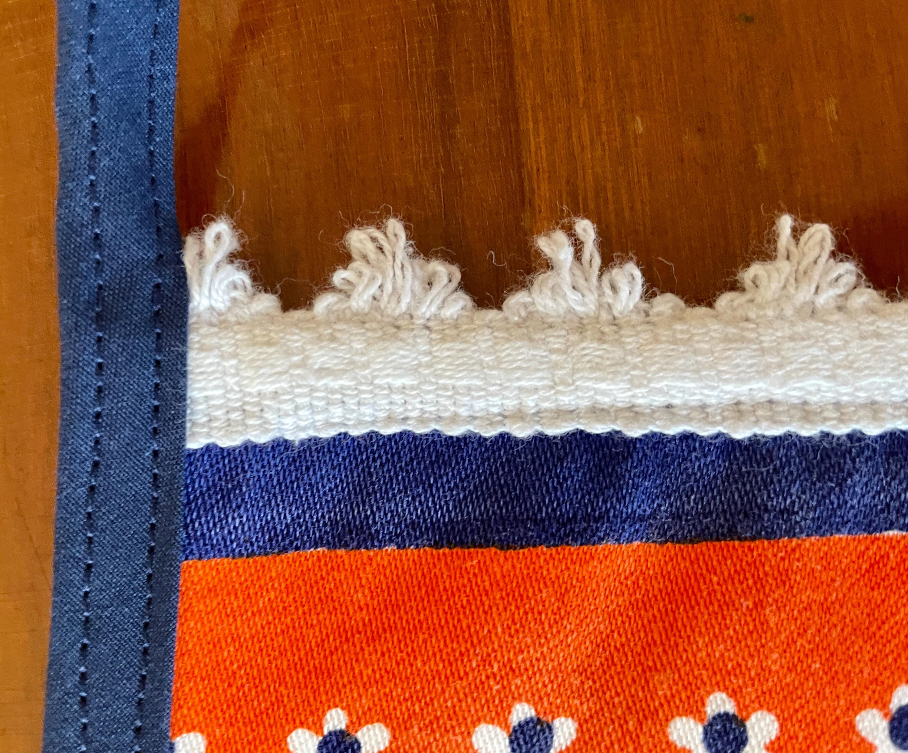 Orange and royal blue combine in this upcycled vintage tablecloth that features a Dutch design.
