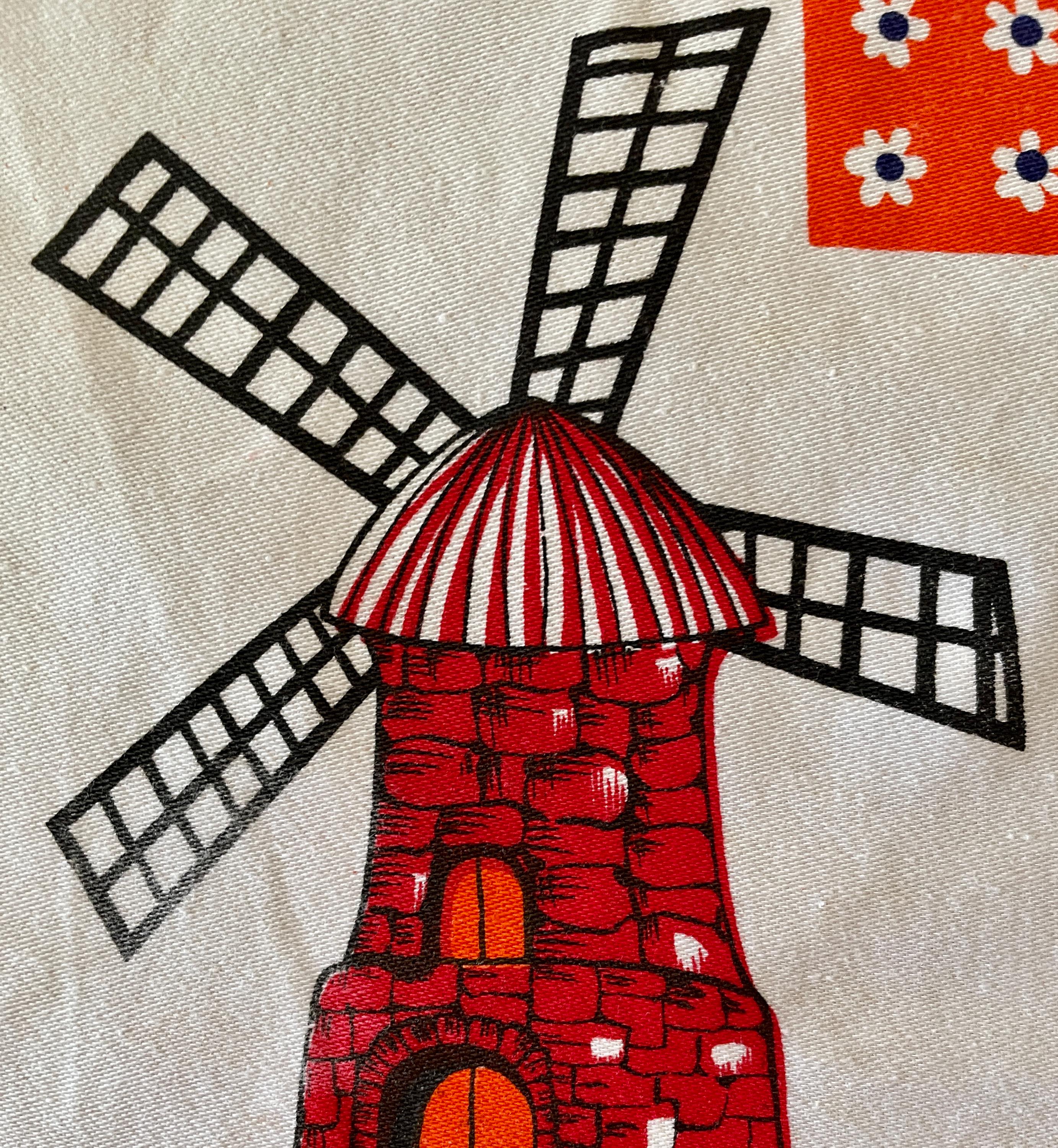 The center has a large orange square with white flowers. It is surrounded by white with orange and blue windmills on each side corner. The orange with white flowers is next, then boys and girls dressed in traditional Dutch costumes. The orange and white flower design appears again, and finally a stripe of royal blue.