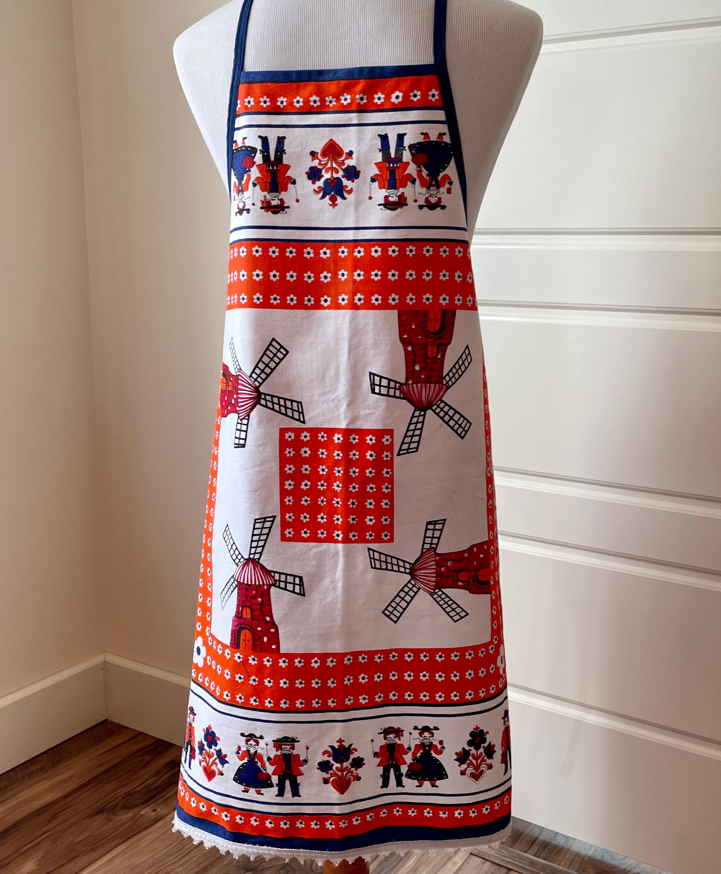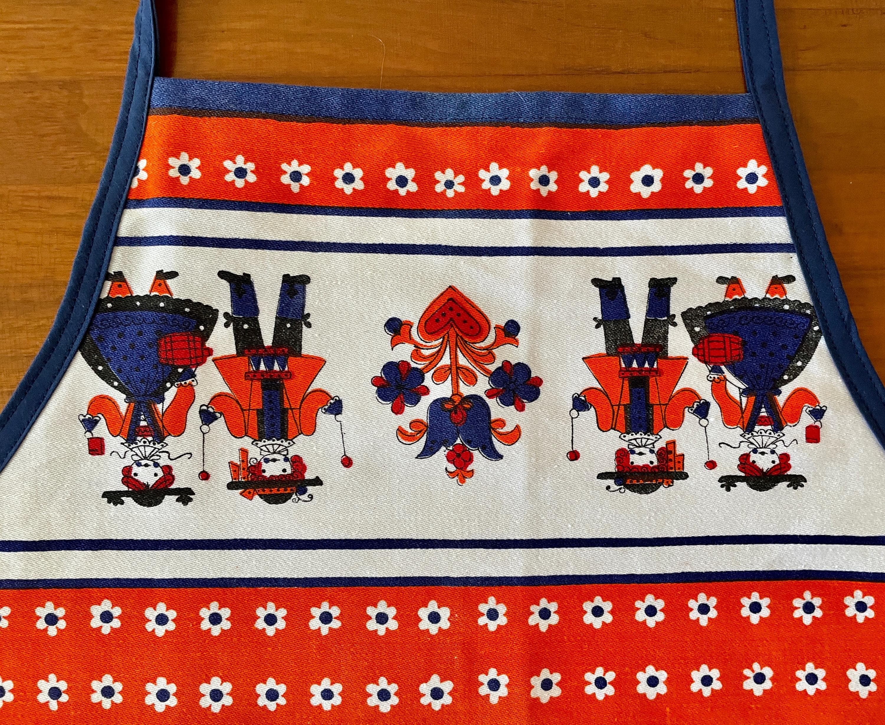 The apron edging features the original tablecloth edging. The trim is in royal blue, and ties at the waist. The single neck tie can be knotted where desired to adjust the apron length. A few of the photos show there are some faded areas in the design, but keep in mind the tablecloth is vintage.