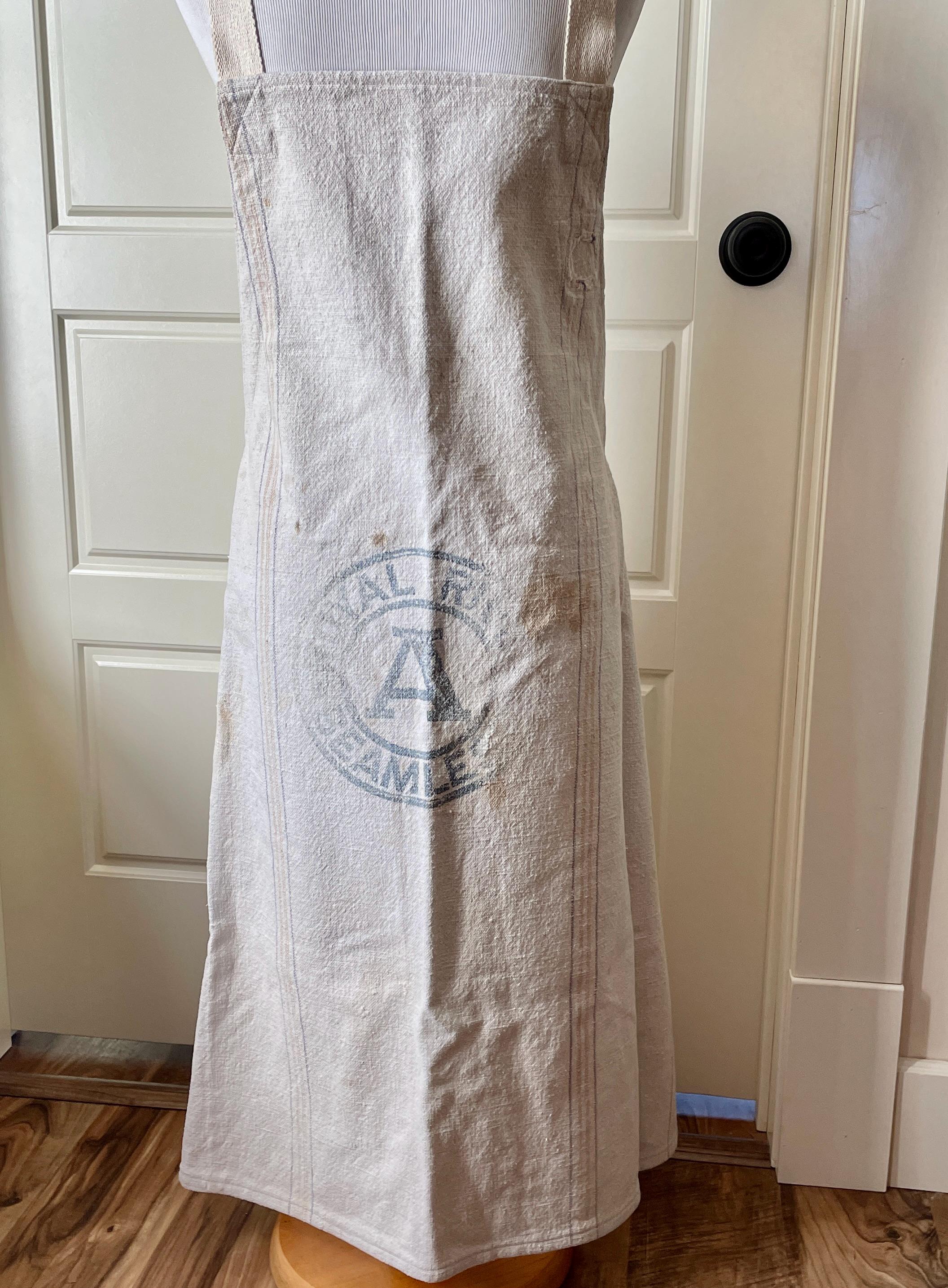 * Please keep in mind this apron was created from an authentic vintage cloth sack. Photos show the design and print darker than in actuality. While the apron is described as accurately as possible, due to the vintage quality there may be age marks not noted specifically. Also, finding some or many seeds or feed pieces caught in the fabric is quite common. The bags have been washed at least once and many seed/feed pieces have already been removed, but some may remain.