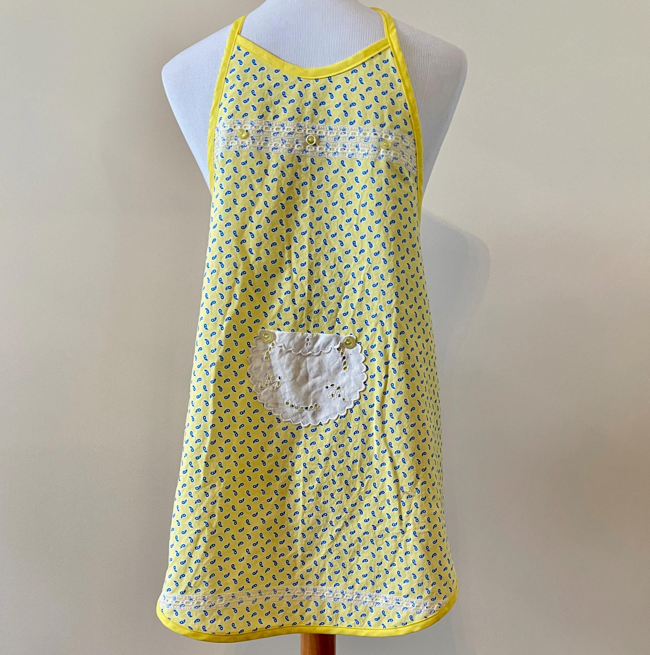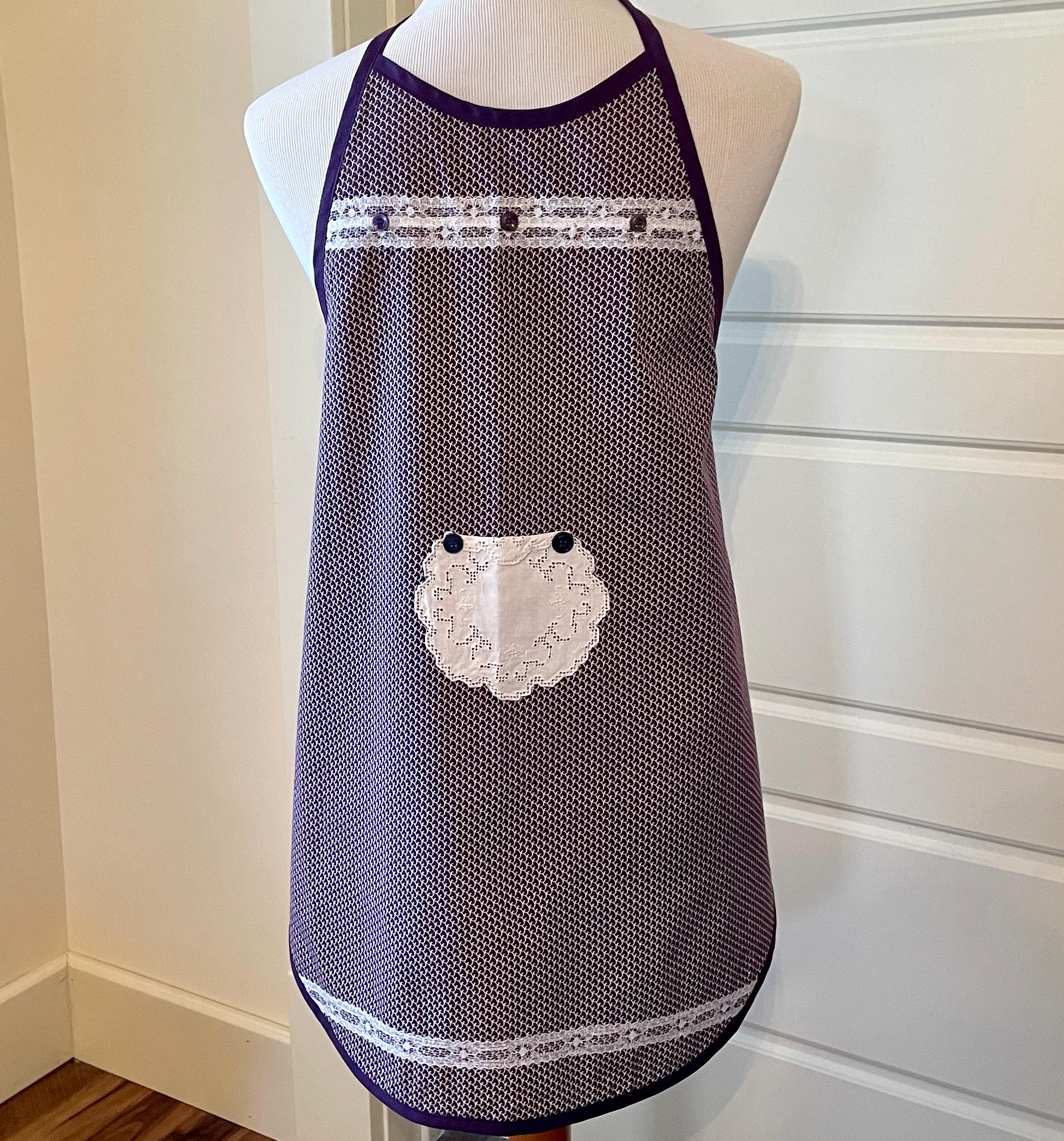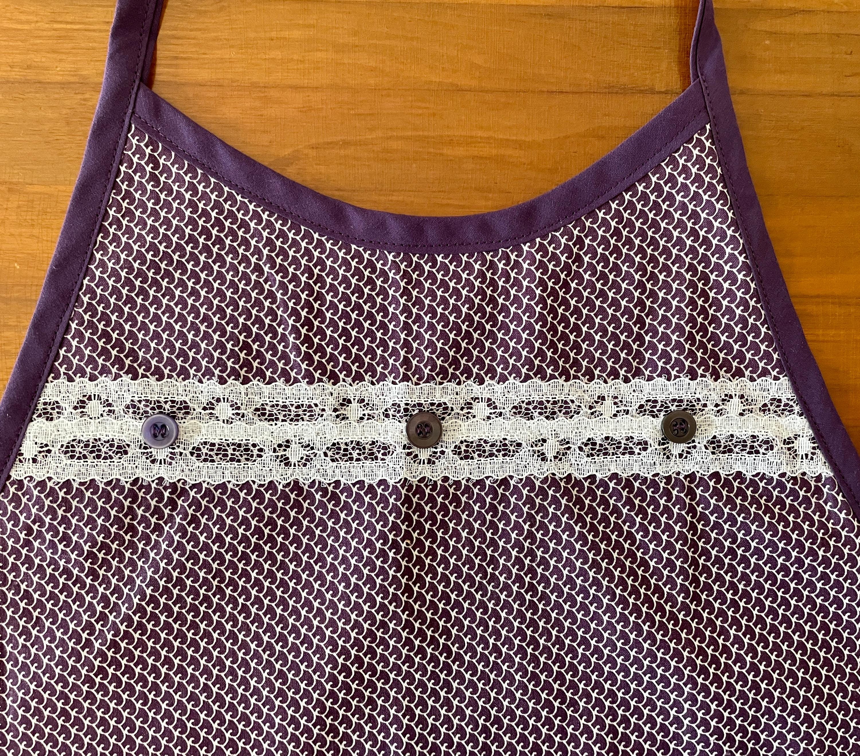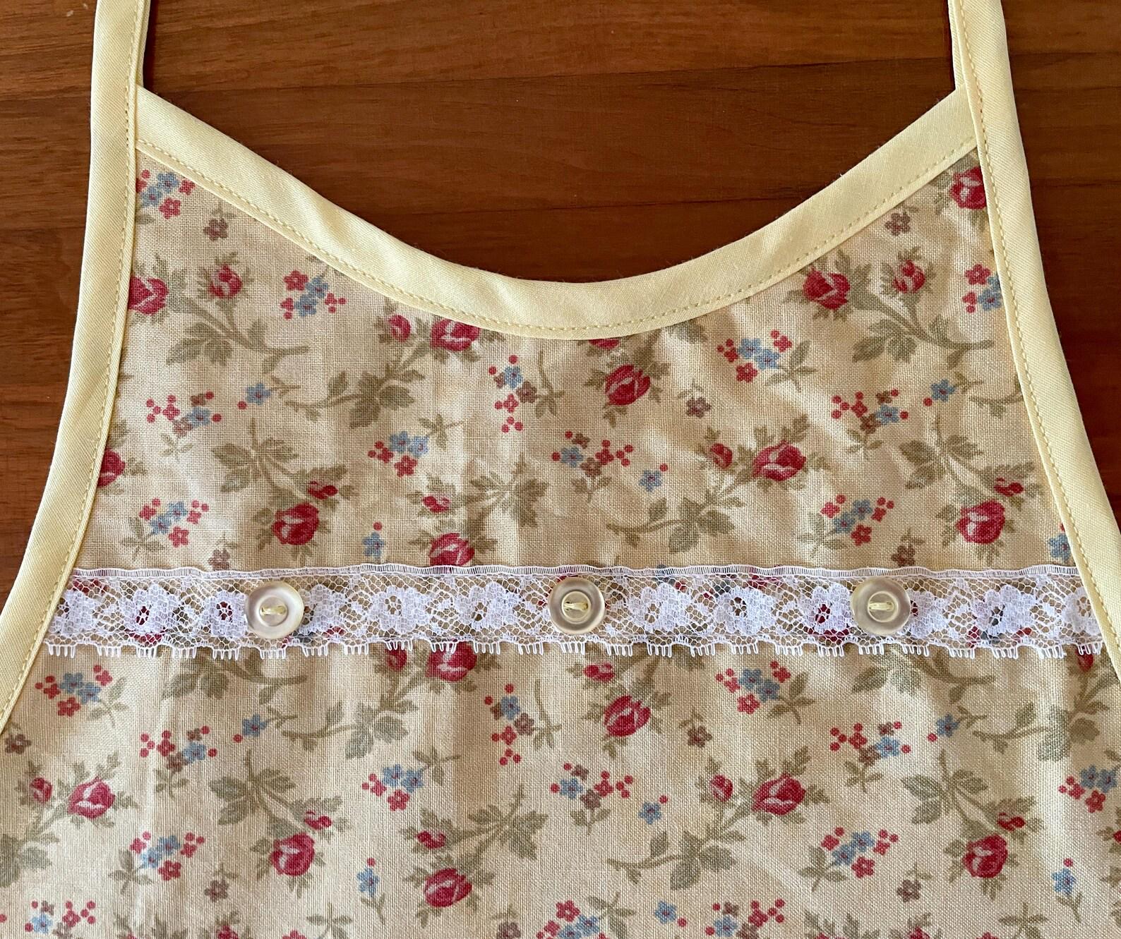 The aprons feature pockets made from vintage white cotton doilies. White lace goes across both the apron skirts and the bodices. Buttons are on the bodice laces and at the pocket corners. The aprons are trimmed in colors similar to the vintage fabric and tie at both the waist and neckline.
