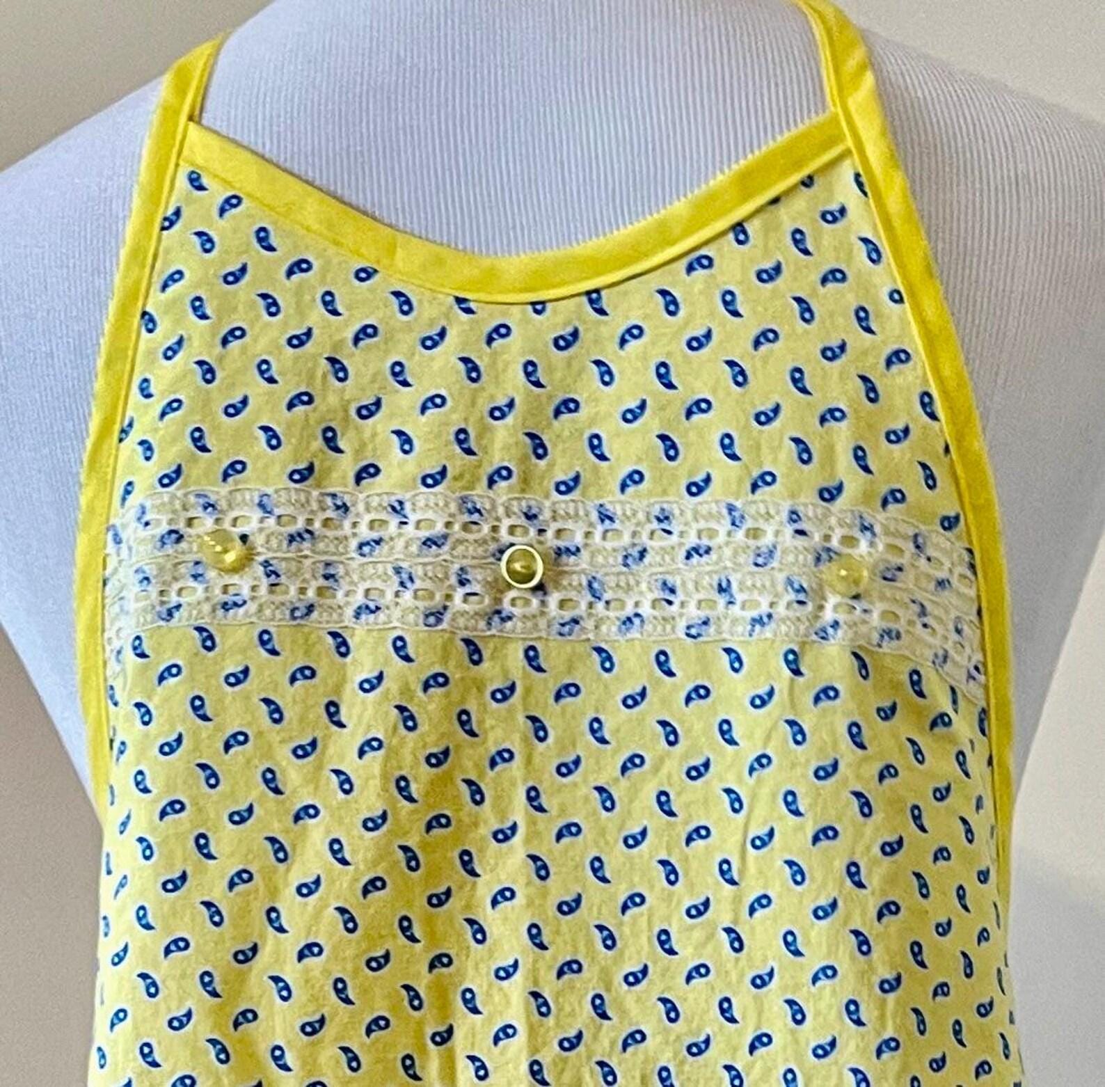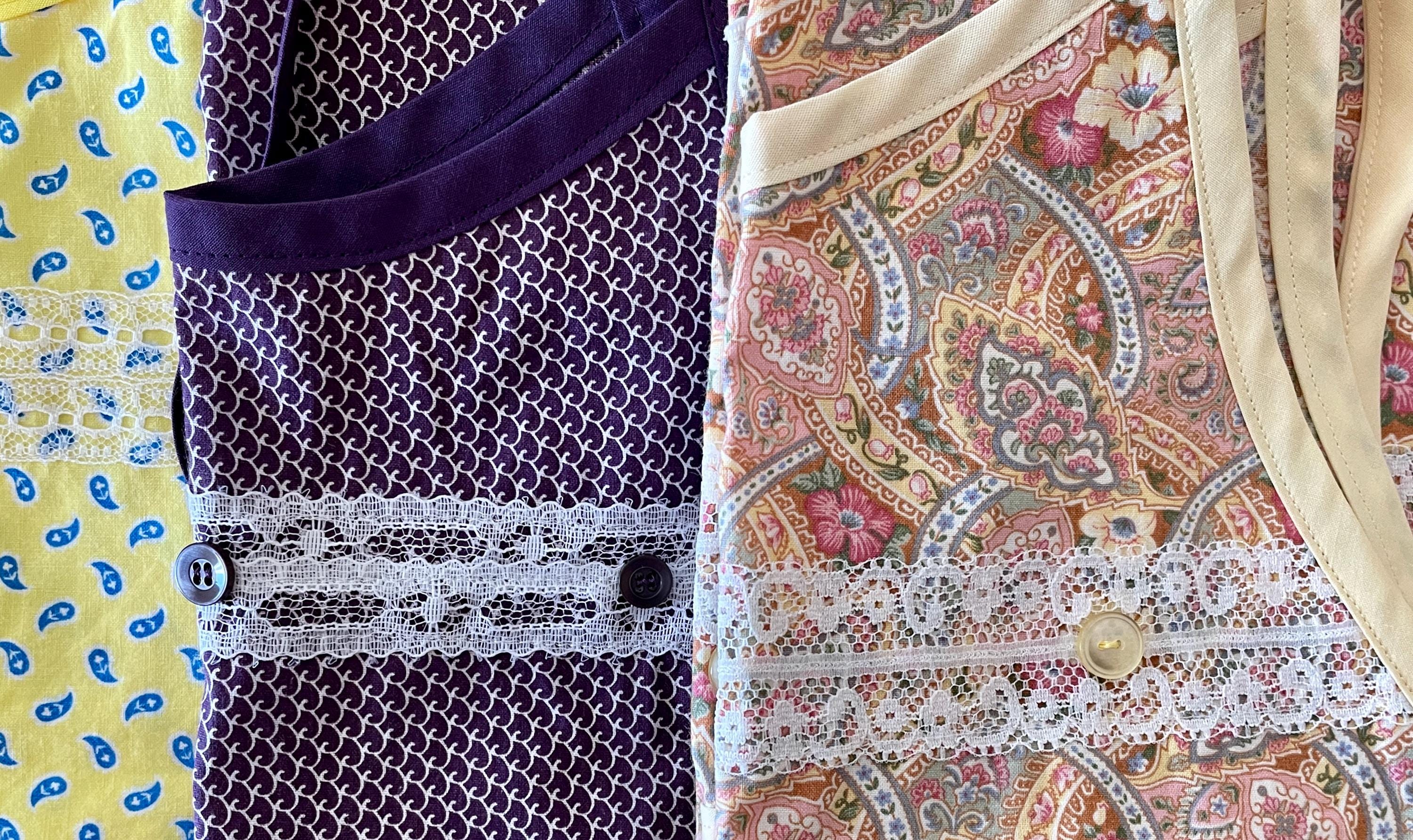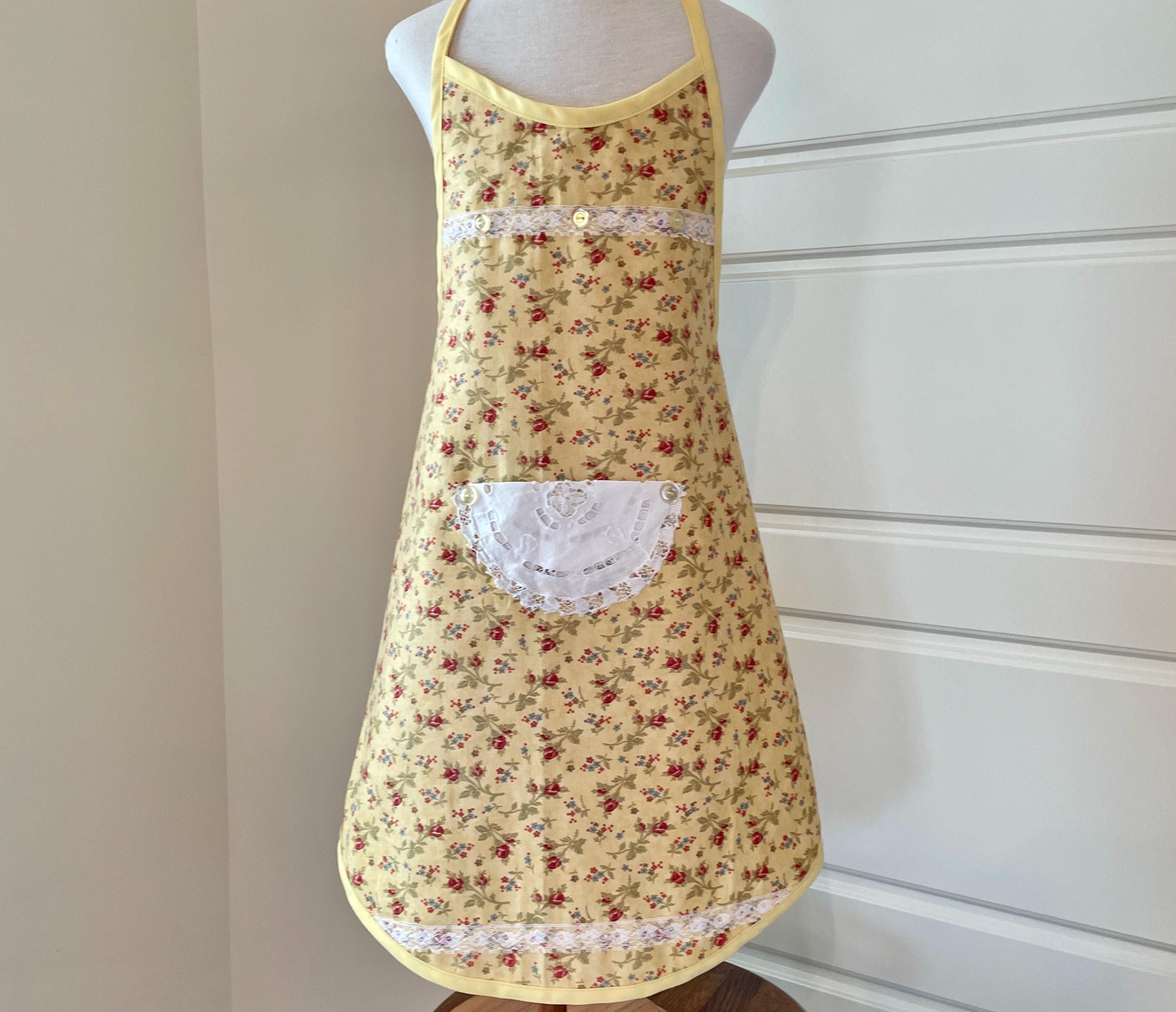 The aprons feature pockets made from vintage white cotton doilies. White lace goes across both the apron skirts and the bodices. Buttons are on the bodice laces and at the pocket corners. The aprons are trimmed in colors similar to the vintage fabric and tie at both the waist and neckline.