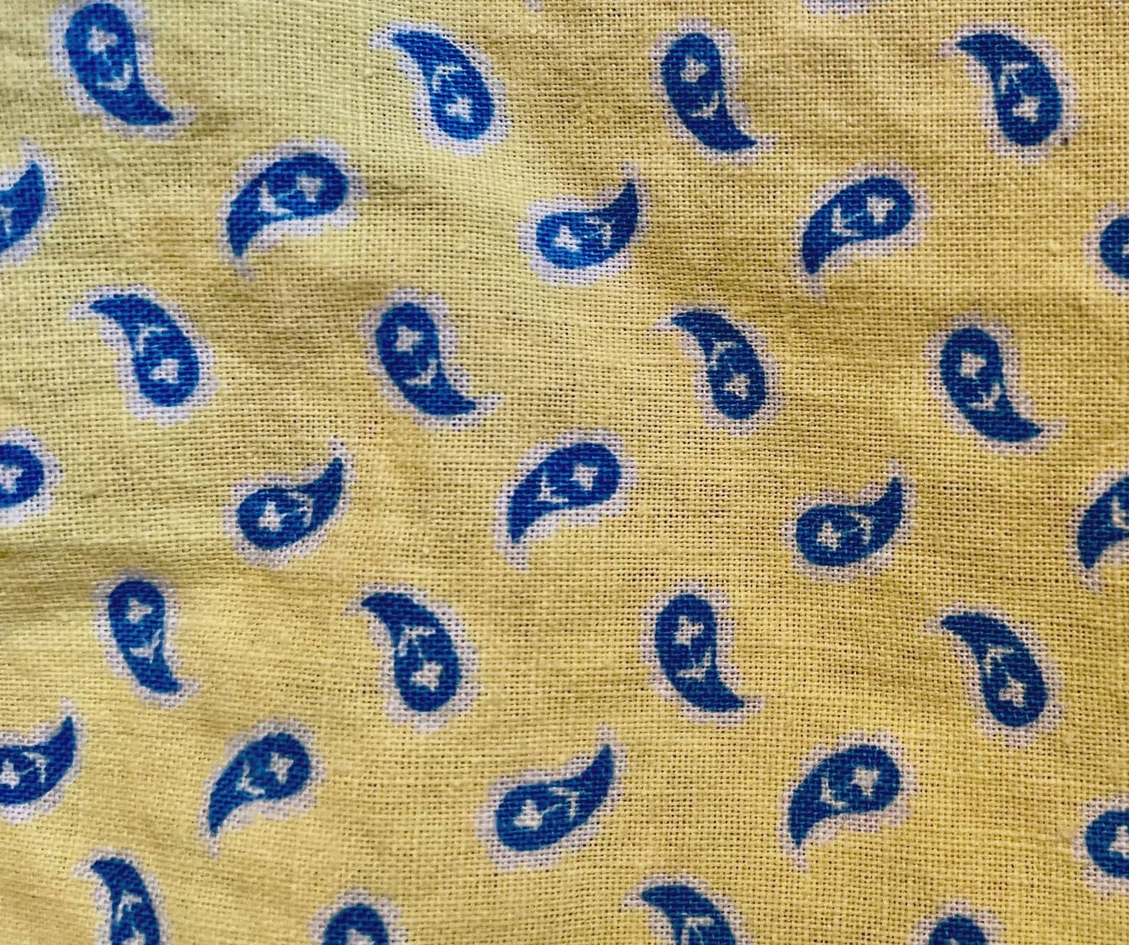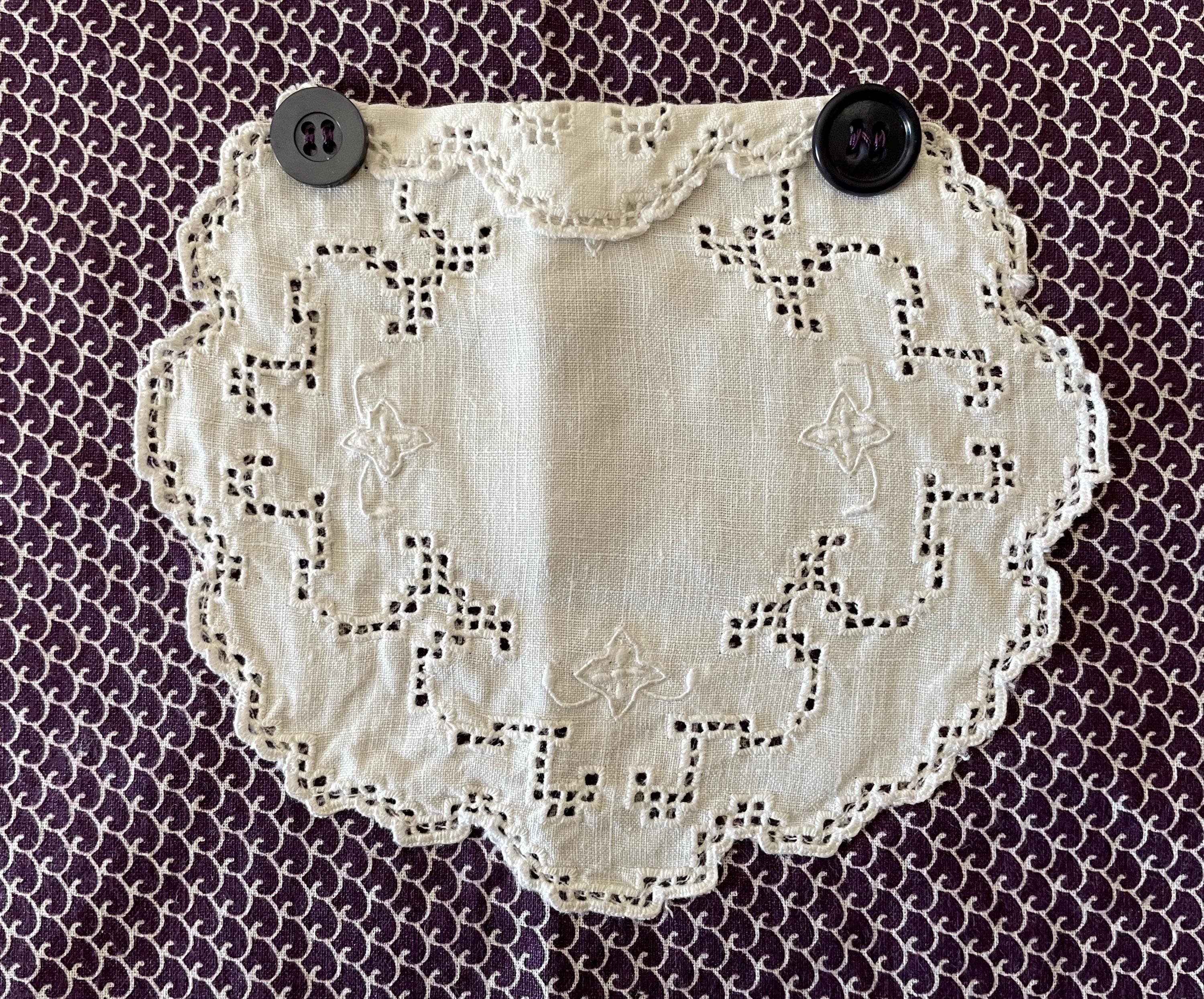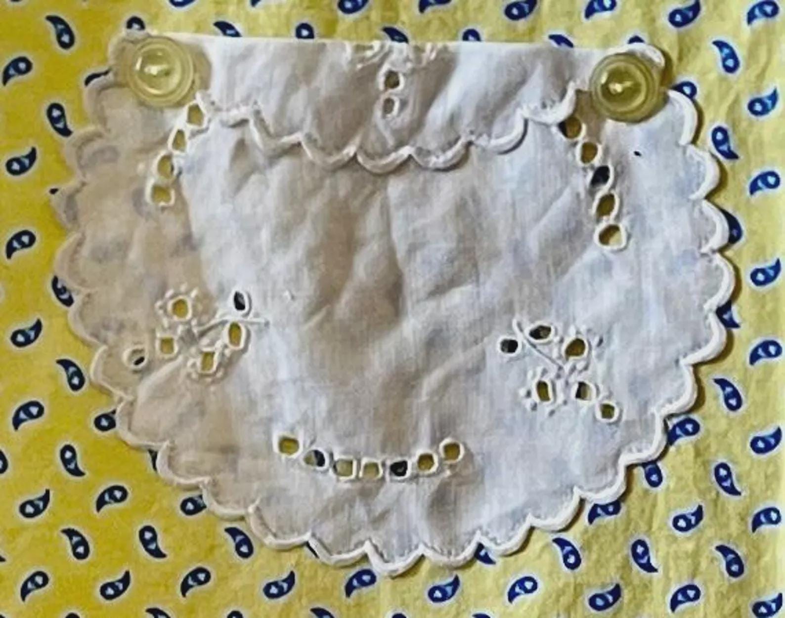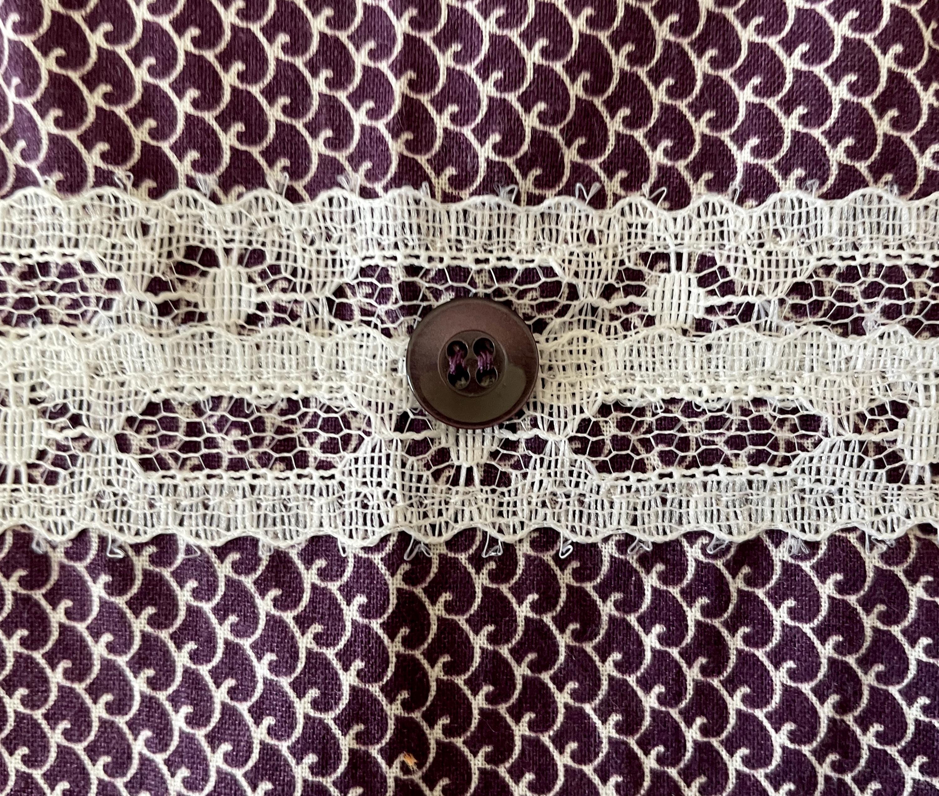 The aprons feature pockets made from vintage white cotton doilies. White lace goes across both the apron skirts and the bodices. Buttons are on the bodice laces and at the pocket corners. The aprons are trimmed in colors similar to the vintage fabric and tie at both the waist and neckline.
