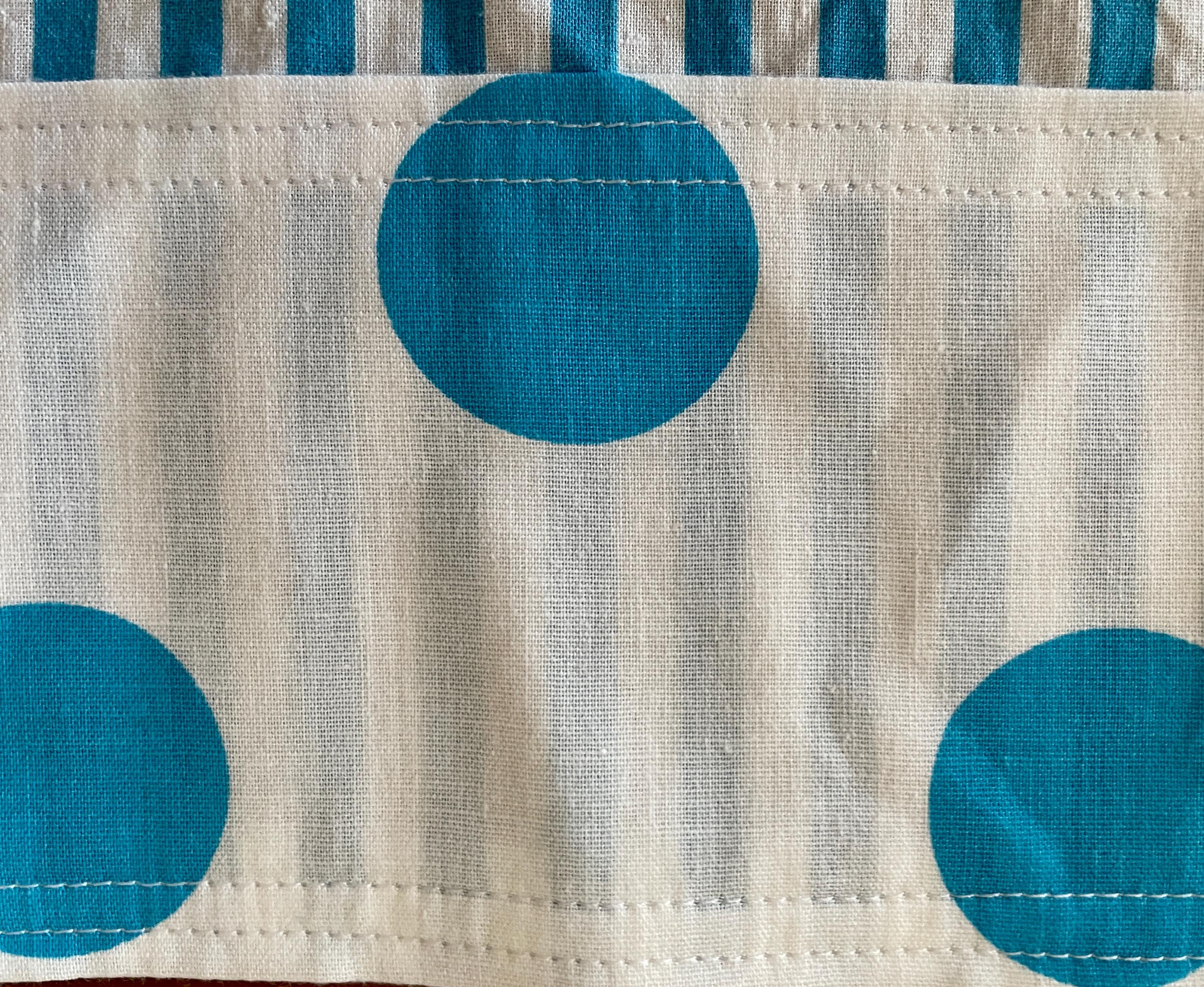 This mid-century inspired full apron was created from vintage fabrics in both turquoise polka dots and stripes.