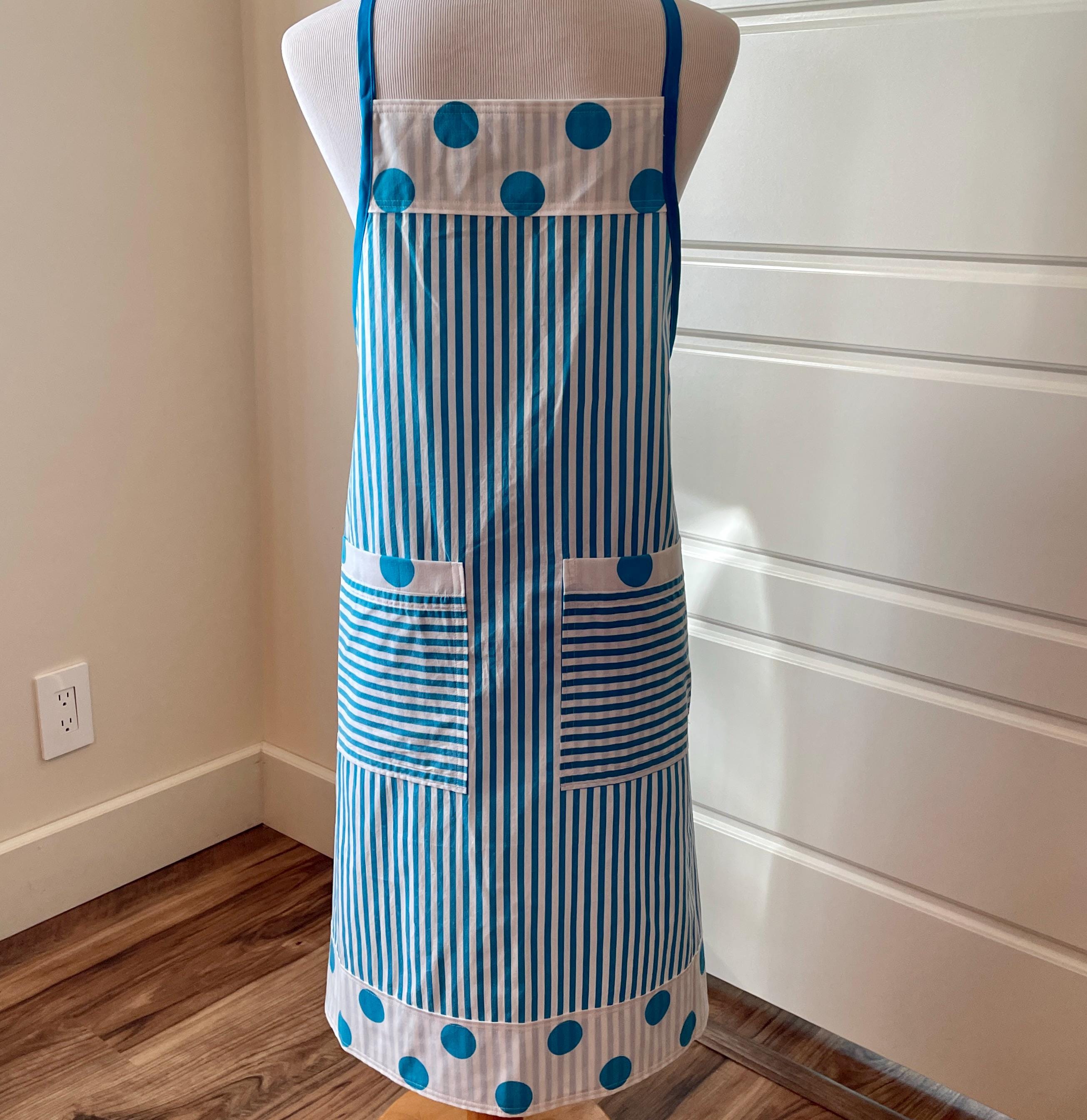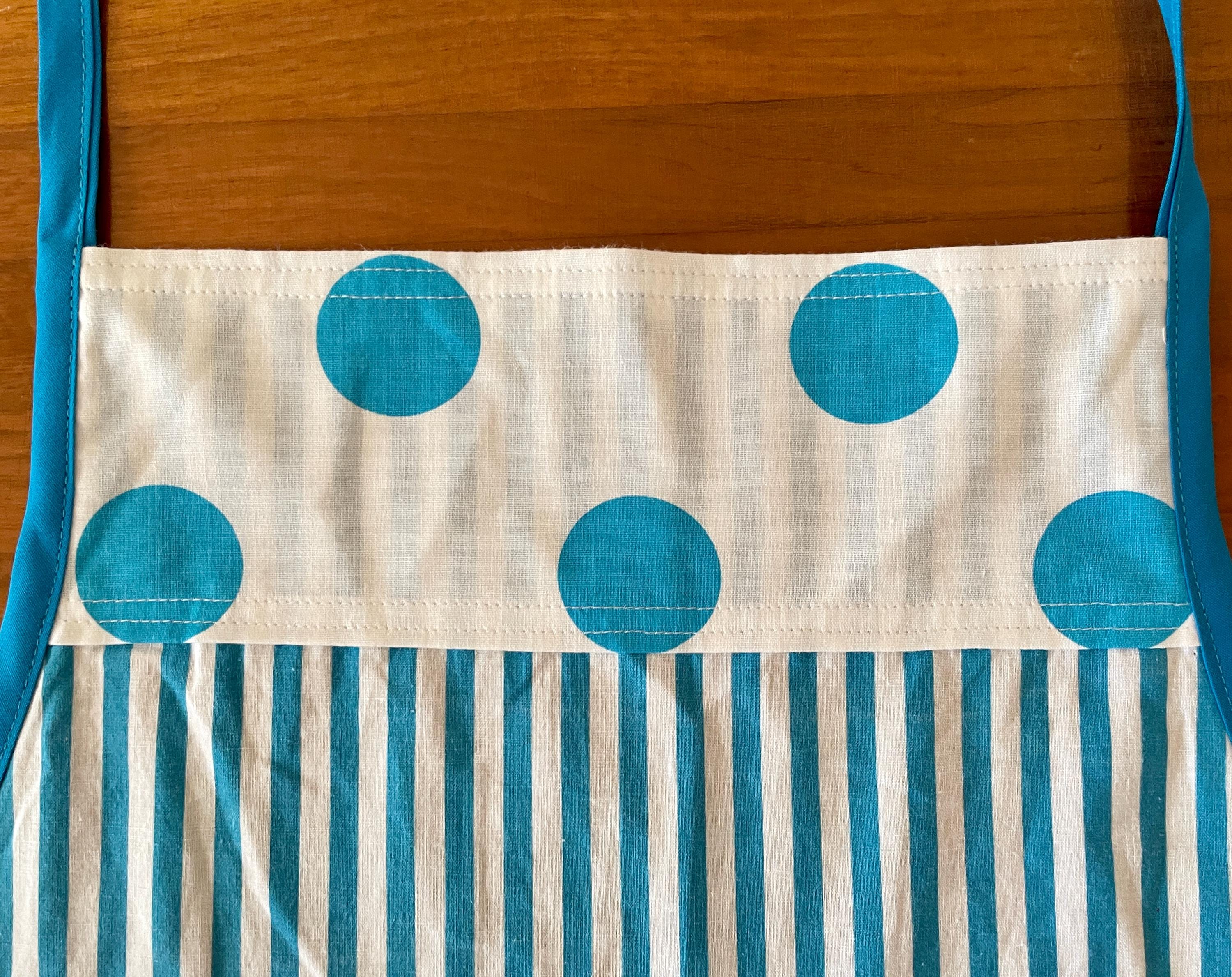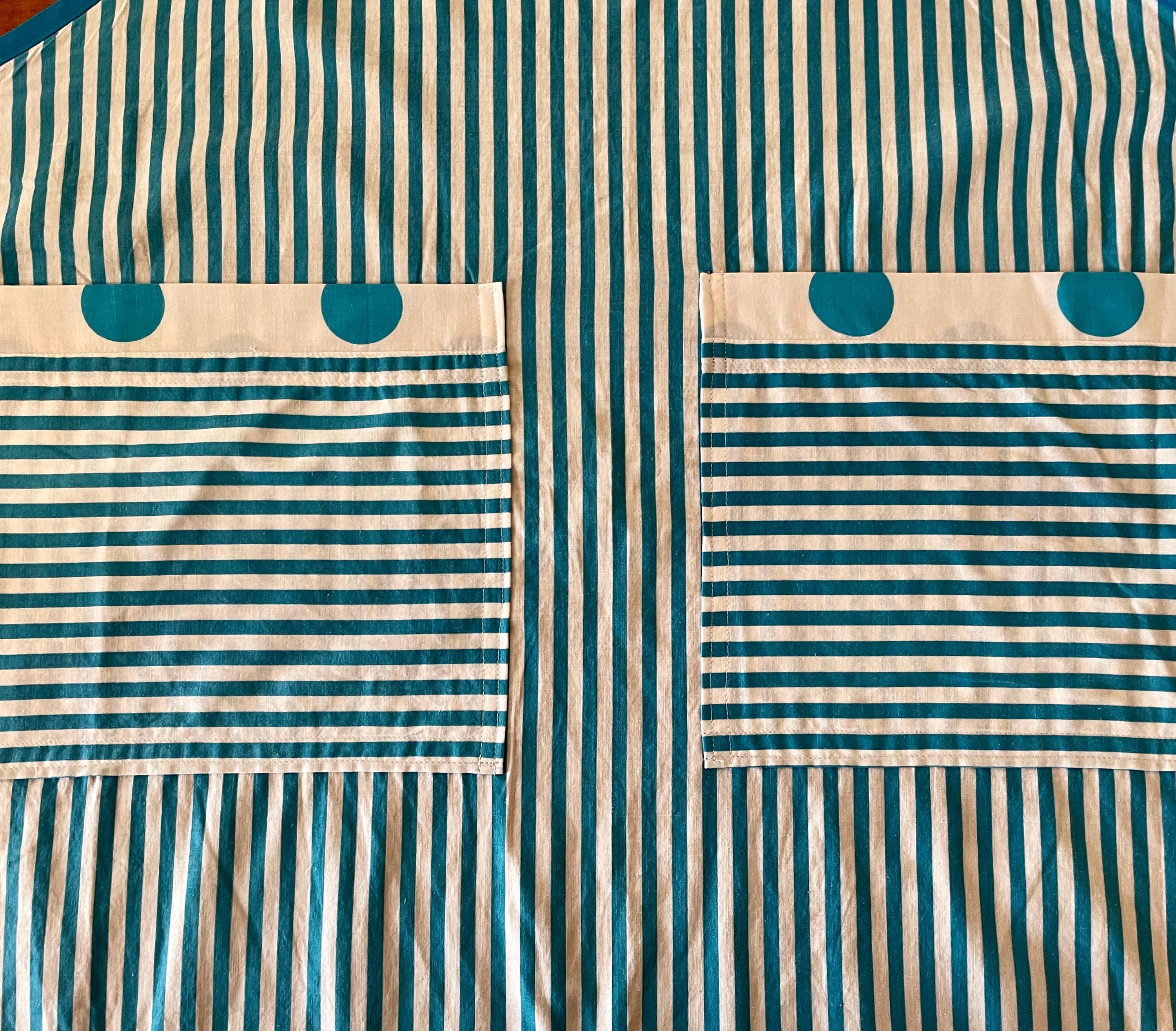 The print features vertical turquoise and white stripes contrasted at both the bodice top and hemline with a turquoise and white dotted print. The two large pockets are created with the striped fabric placed horizontally and topped with the white dotted print. The apron is trimmed in turquoise and ties at the waist. The single neck tie can be knotted where desired to adjust the apron length.