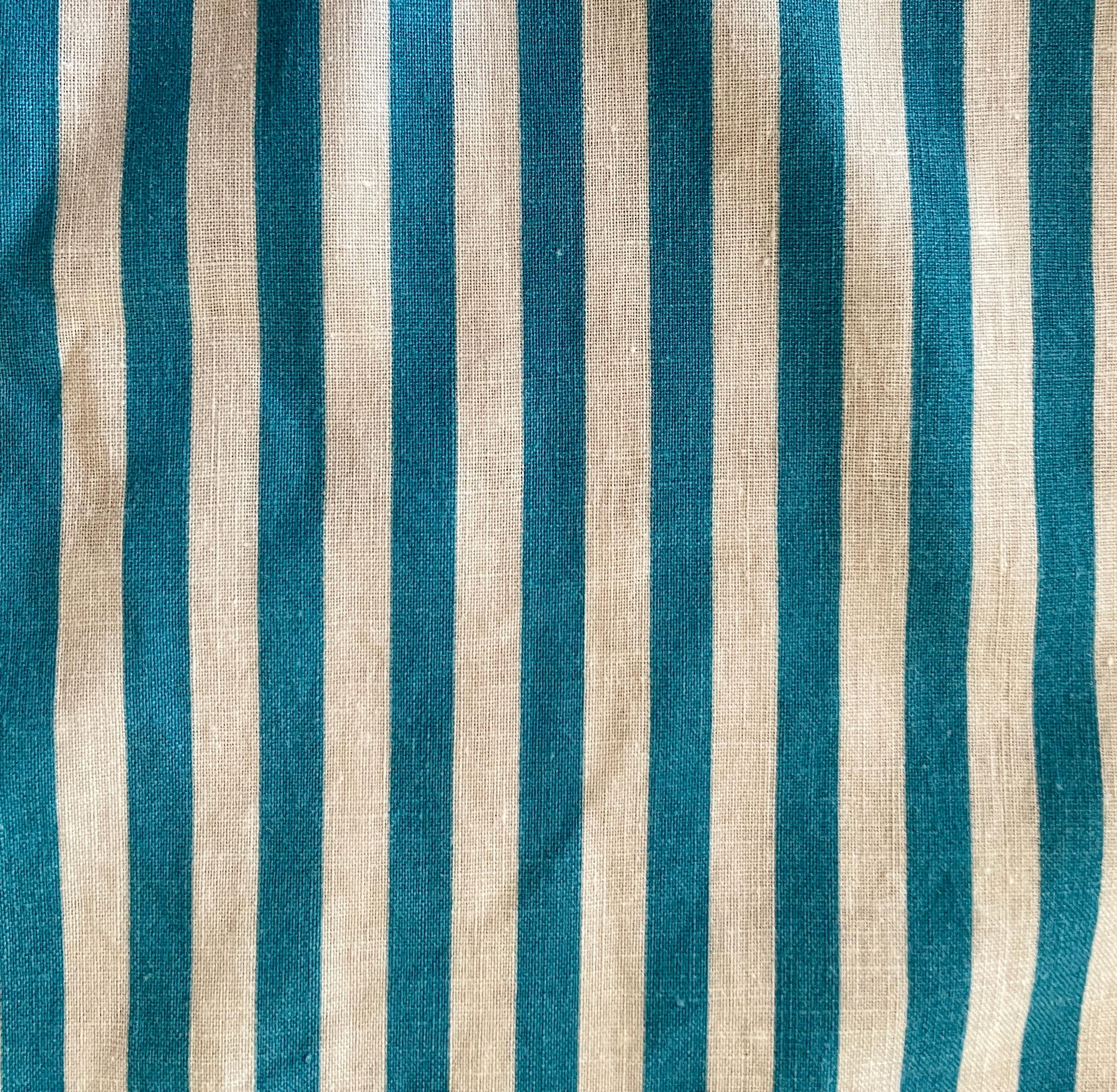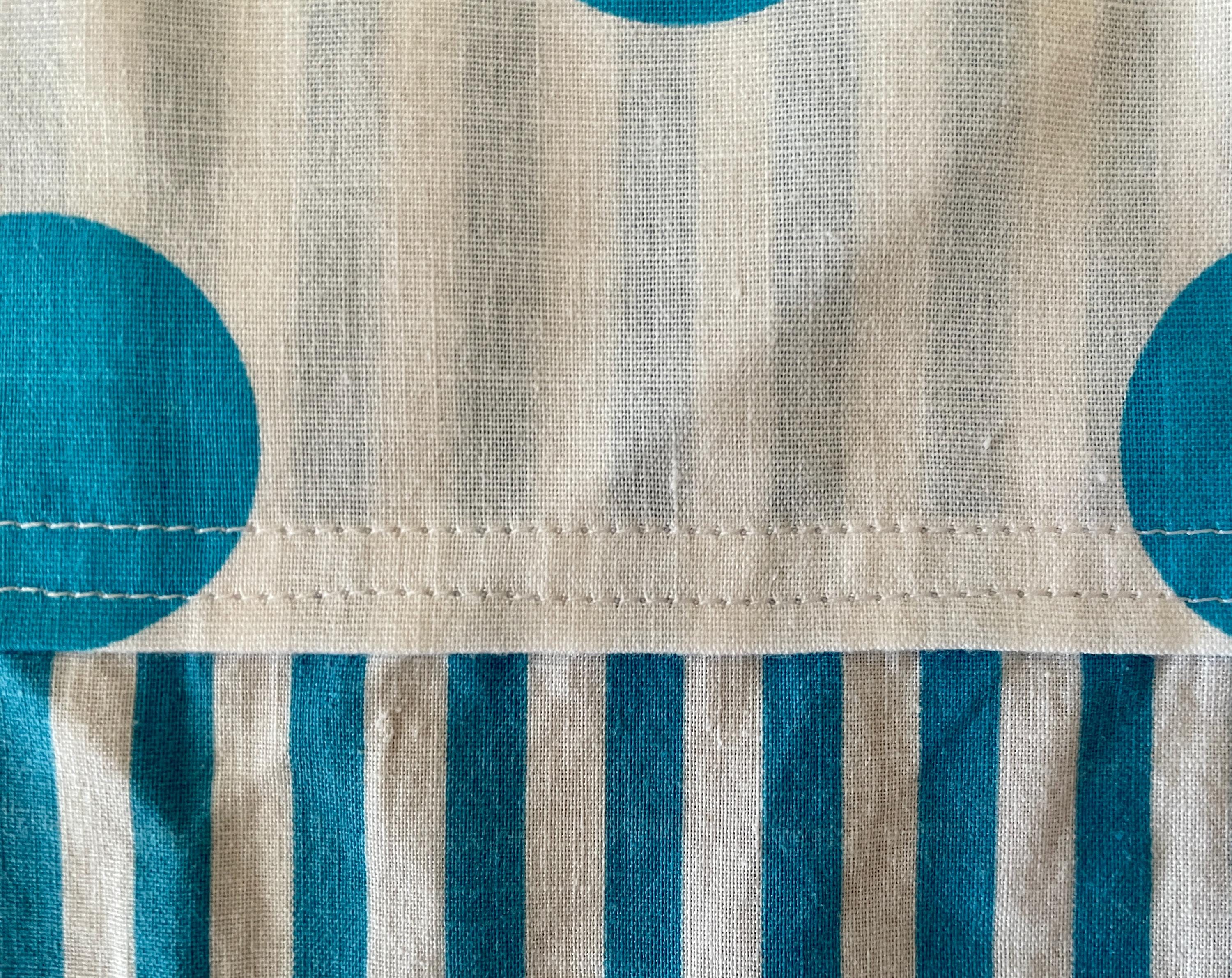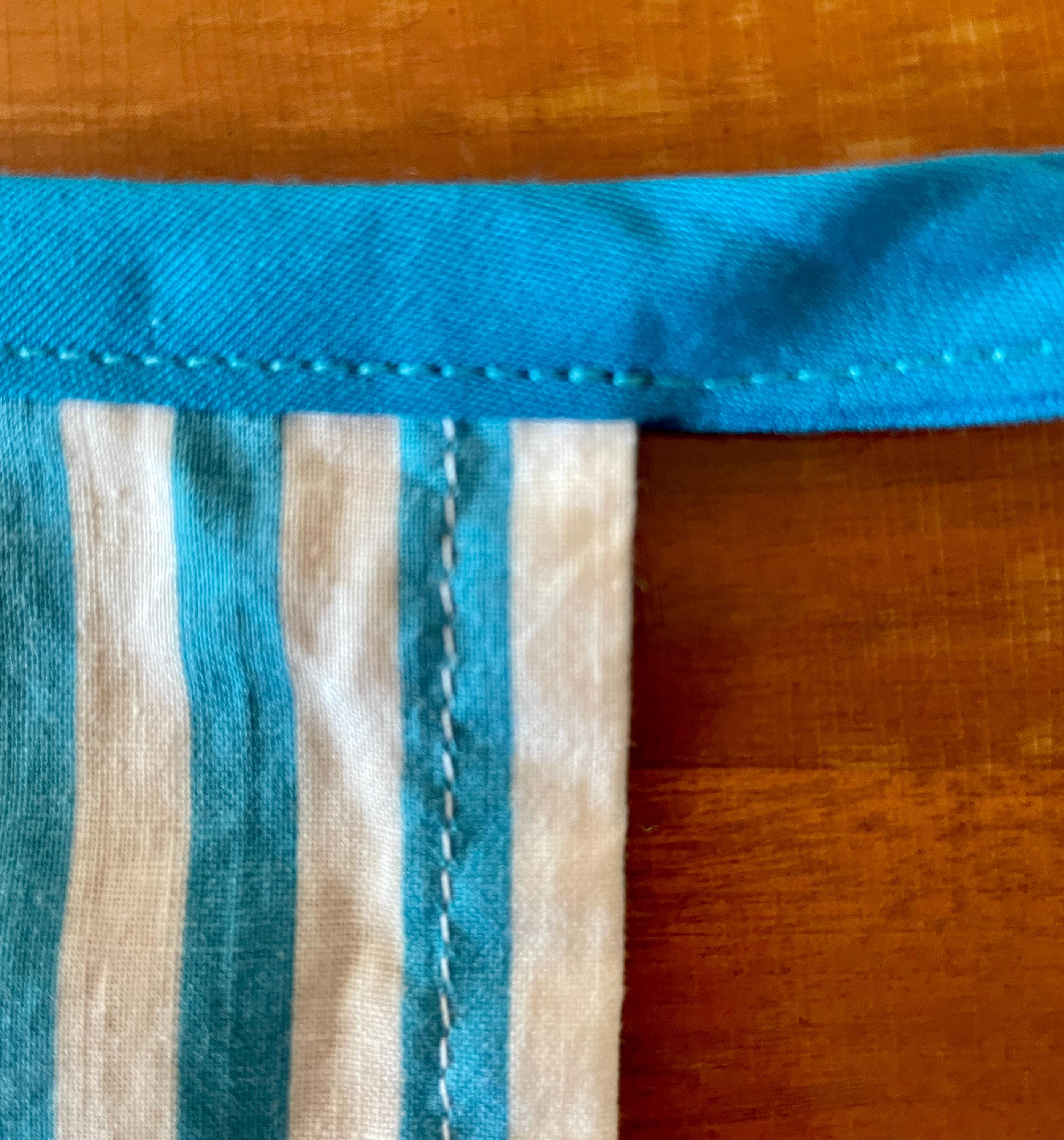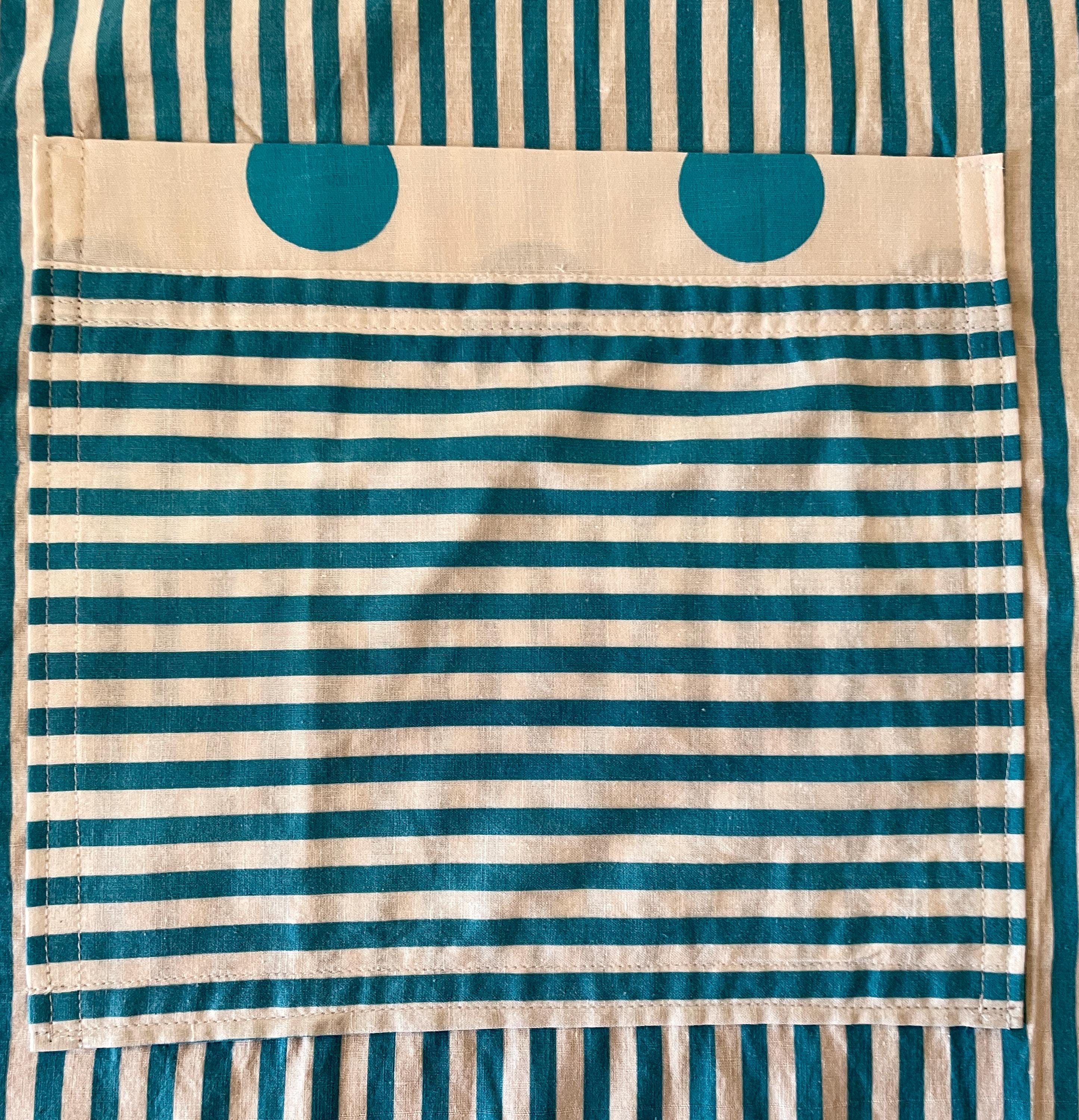 The print features vertical turquoise and white stripes contrasted at both the bodice top and hemline with a turquoise and white dotted print. The two large pockets are created with the striped fabric placed horizontally and topped with the white dotted print. The apron is trimmed in turquoise and ties at the waist. The single neck tie can be knotted where desired to adjust the apron length.