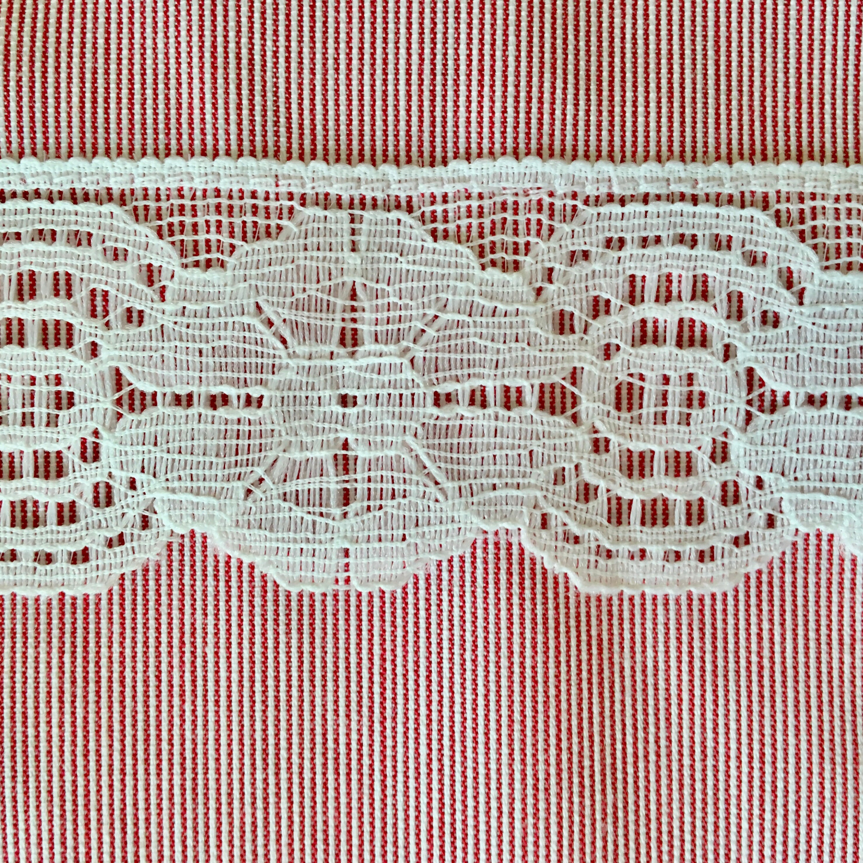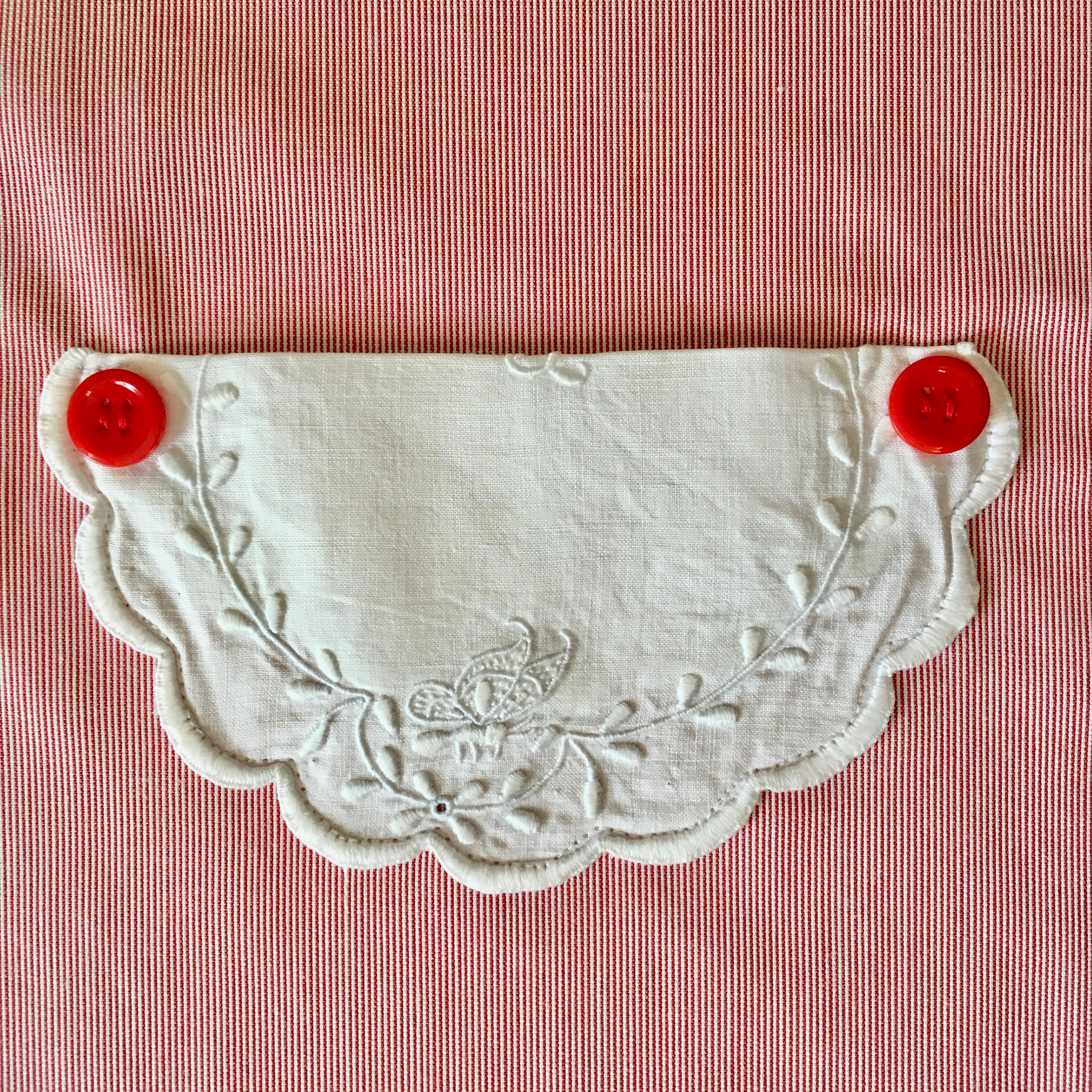 Thin red and white stripes combine in this cute little apron that would be perfect for the Christmas baking season, but practical enough that it works all year 'round. The roundness of the skirt and neckline cut are repeated in both the vintage lace that goes across the bodice and skirt hem, and the pocket. The lace has a floral and circle pattern. The vintage doily used for the pocket features scalloped edging and an embroidered floral pattern. The apron is trimmed in red. The neckline is adjustable.