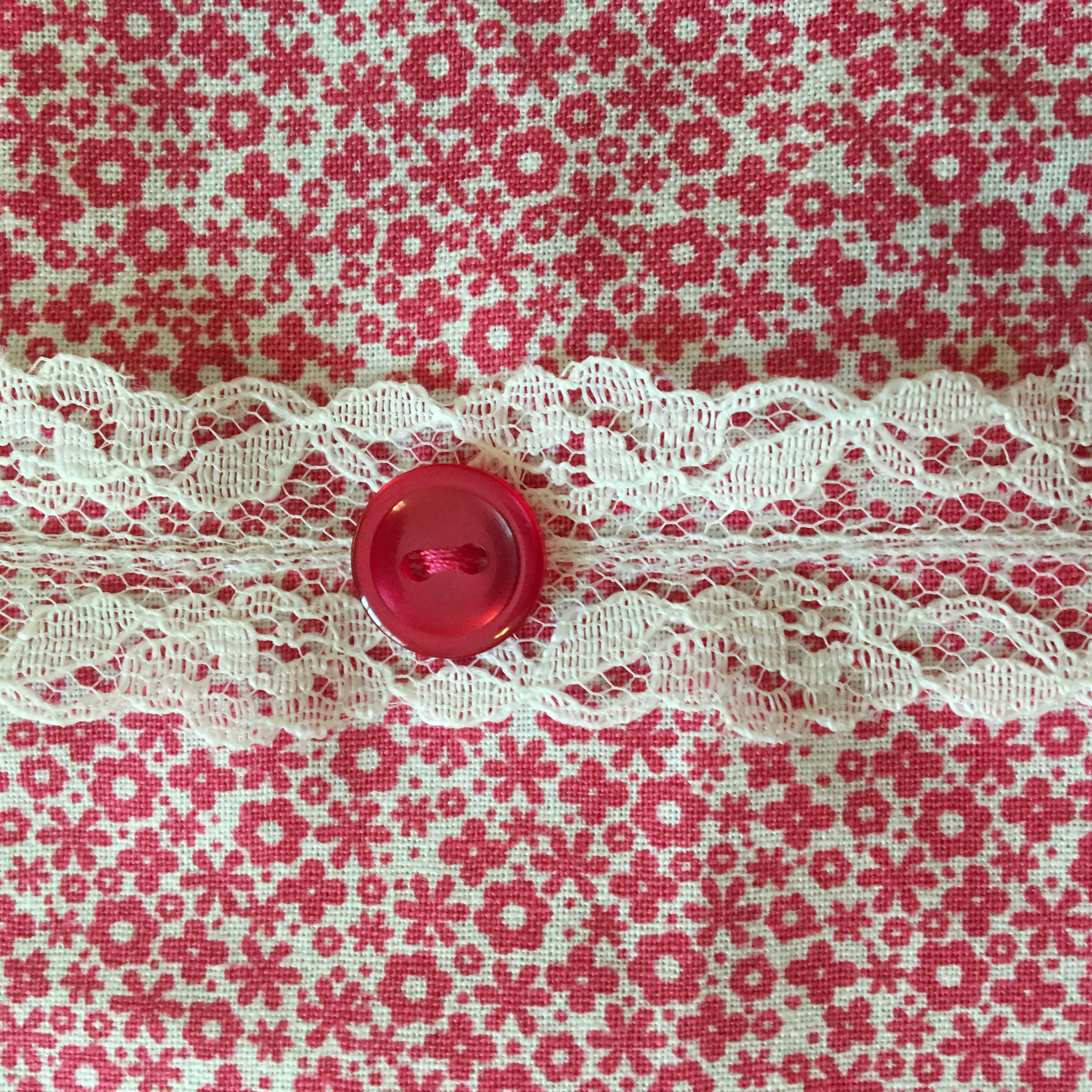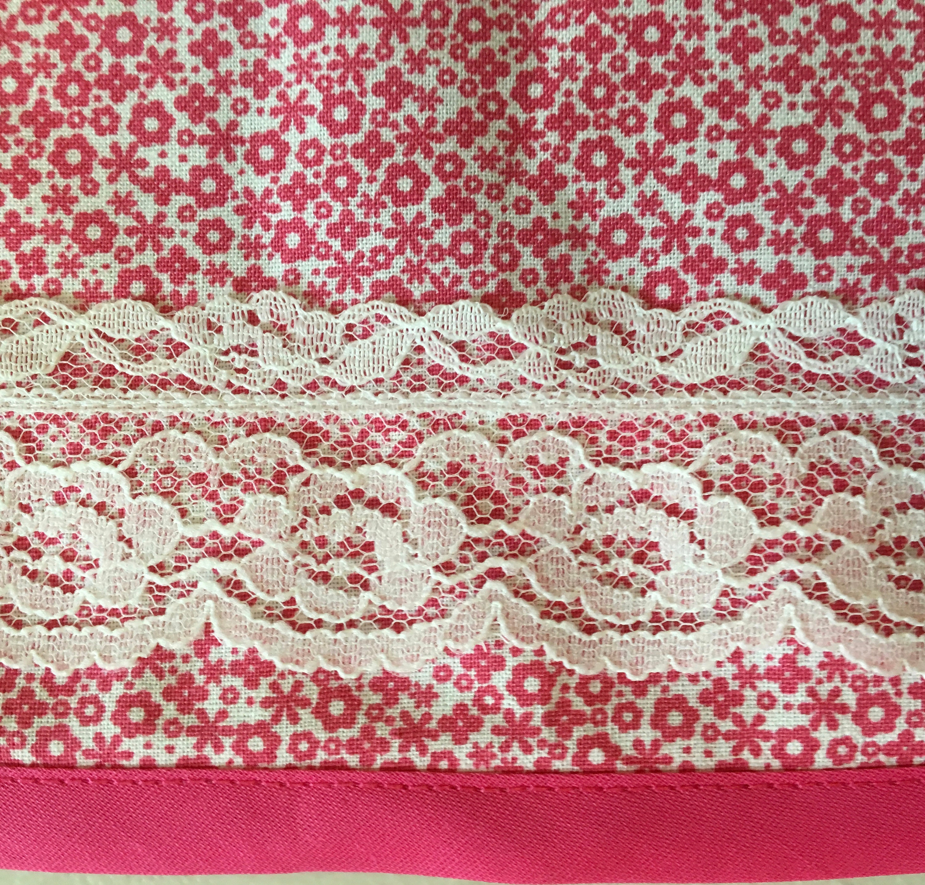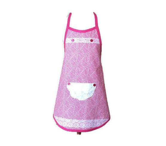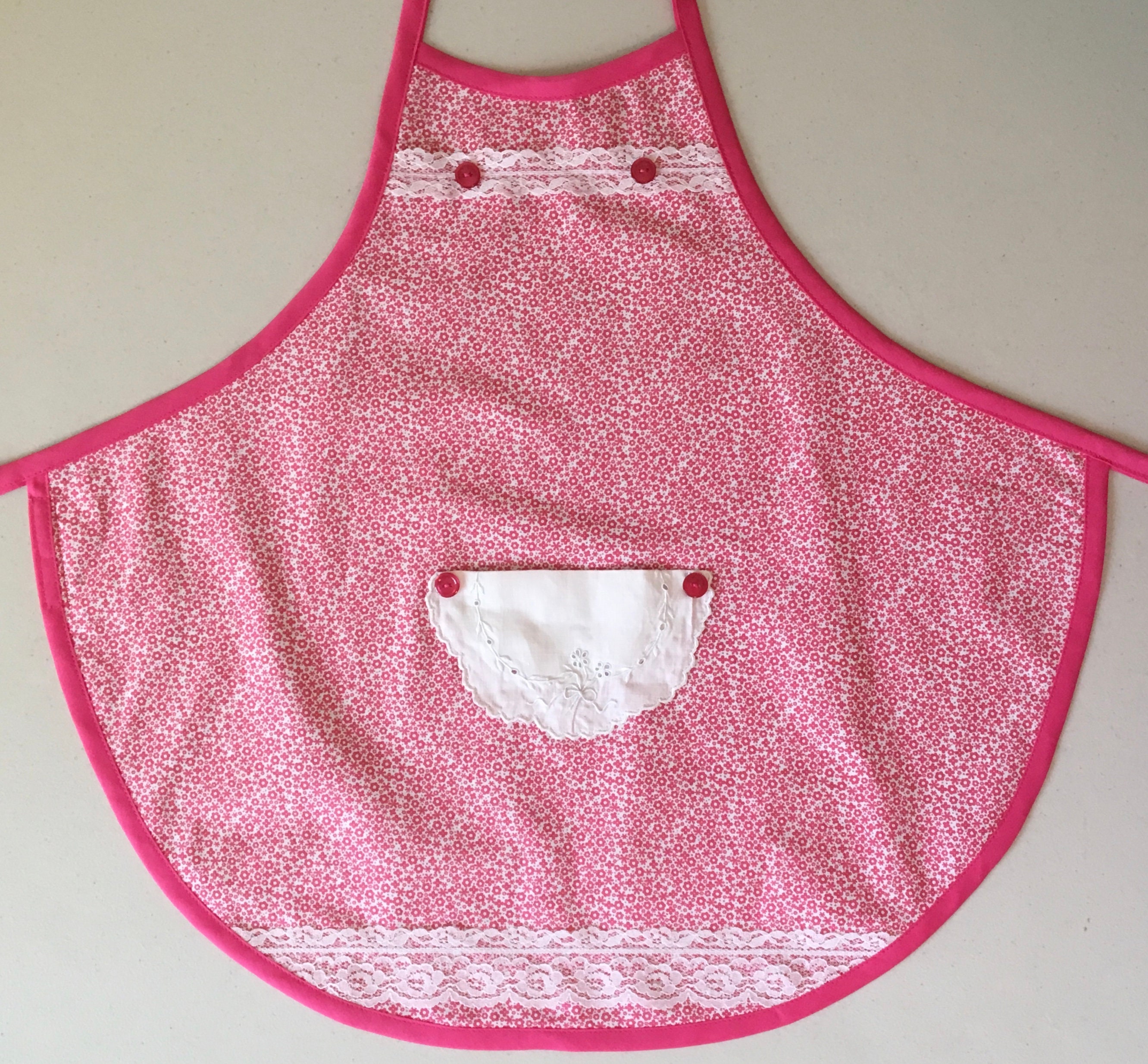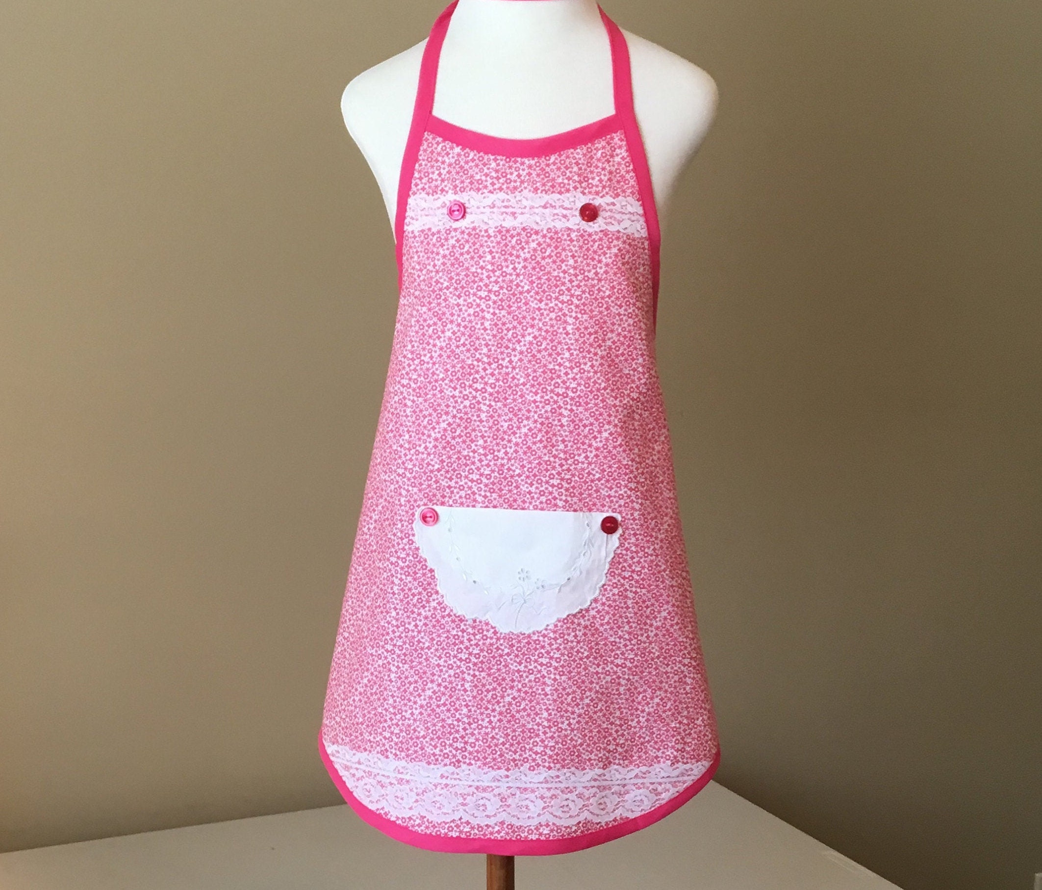 Tiny dark pink flowers are plentiful on the white background fabric of this little girl's apron. The different-shaped flowers are highlighted with a vintage white cotton doily used for the pocket. Narrow vintage white floral lace is placed in opposite directions across the bodice. The same narrow lace plus a matching wider lace are sewn together in the same way across the skirt. Dark pink buttons highlight the pocket and bodice lace. The apron is trimmed in dark pink.