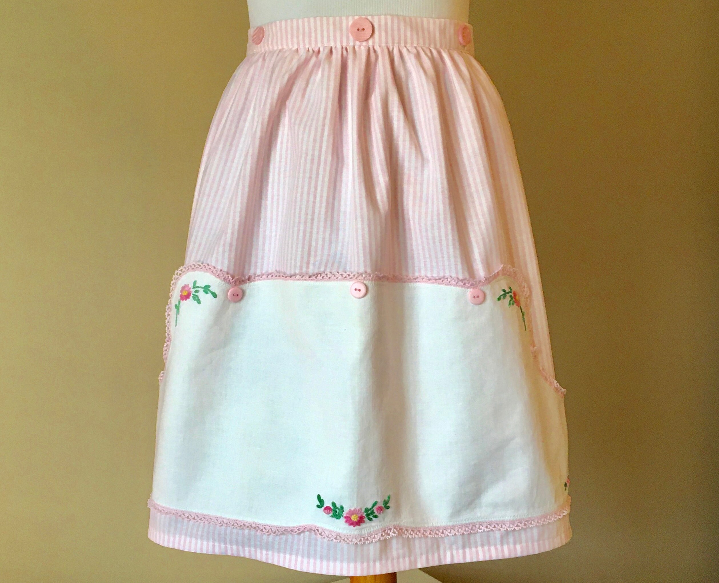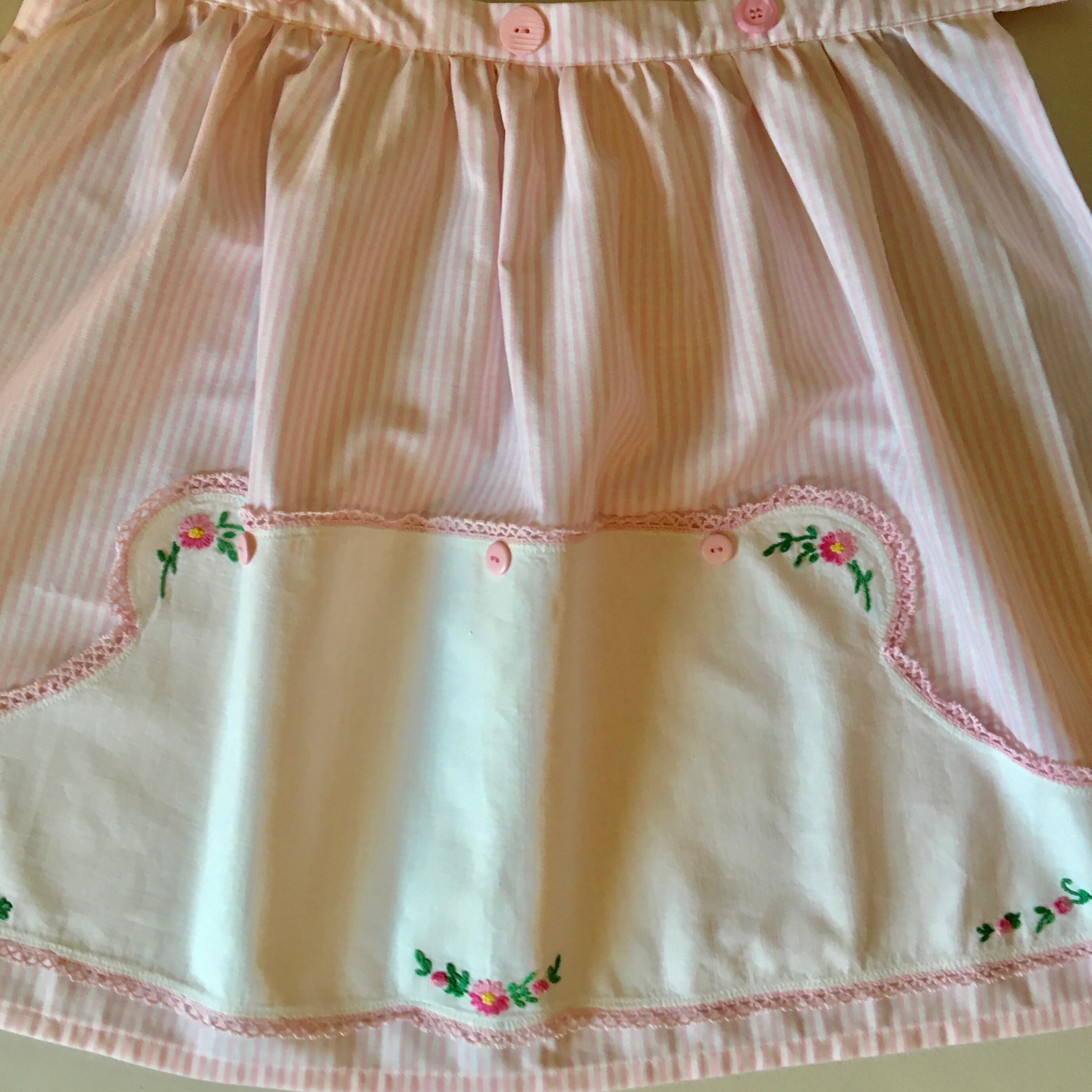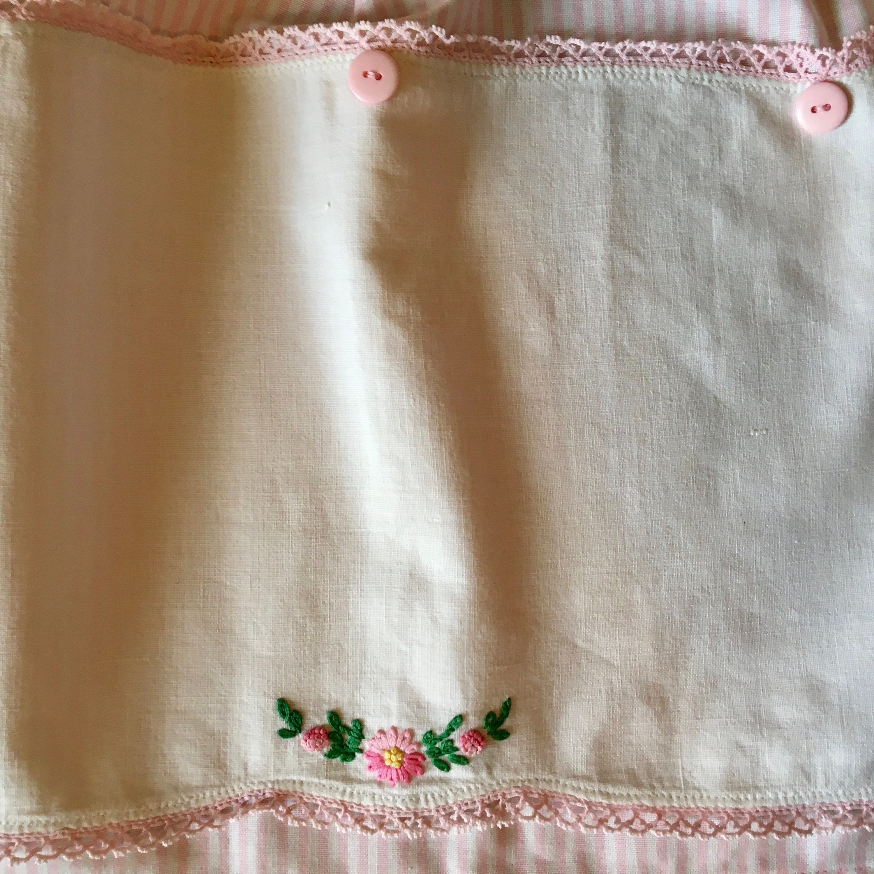 A very unusual dresser scarf (doily) was used for the pocket on this half apron. Pink and white striped fabric was chosen for the apron, waist and ties. The unusually shaped doily is wide in the middle then curves to narrower proportions on each end. The doily was sewn to the apron, with places left to put your hands to make a pocket. The doily features baskets of flowers on each end. Additional flowers are embroidered in the middle bottom and at the top. The flowers are in pink with green stems and leaves. Vintage pink buttons highlight the doily, which is edged with pink lace.
