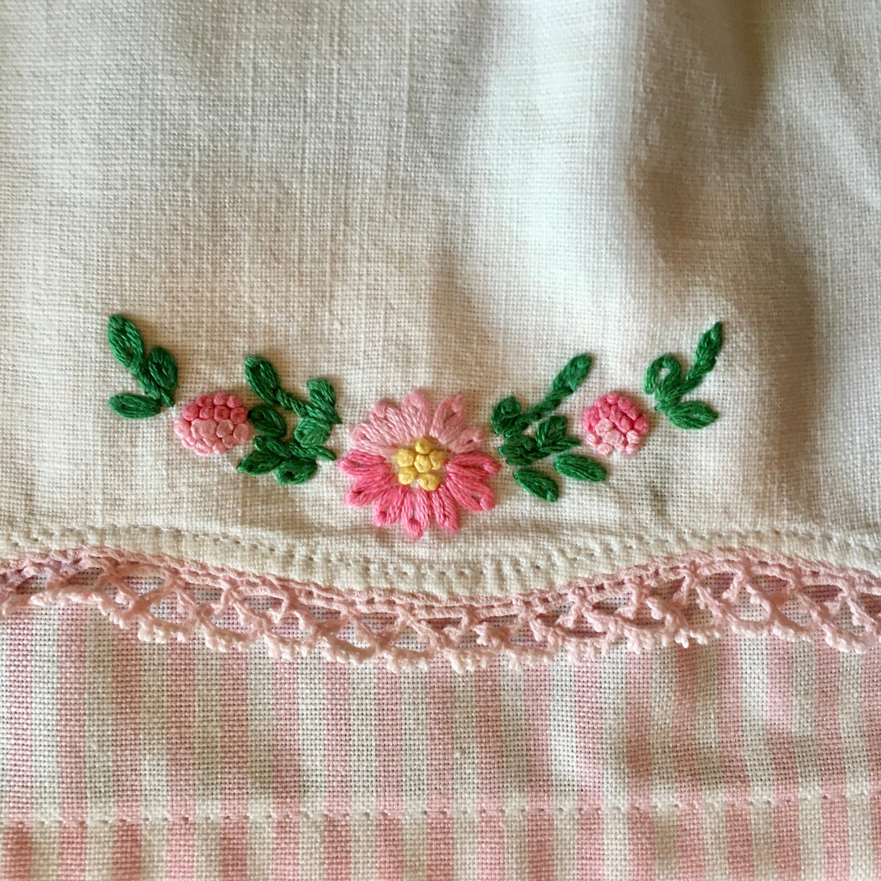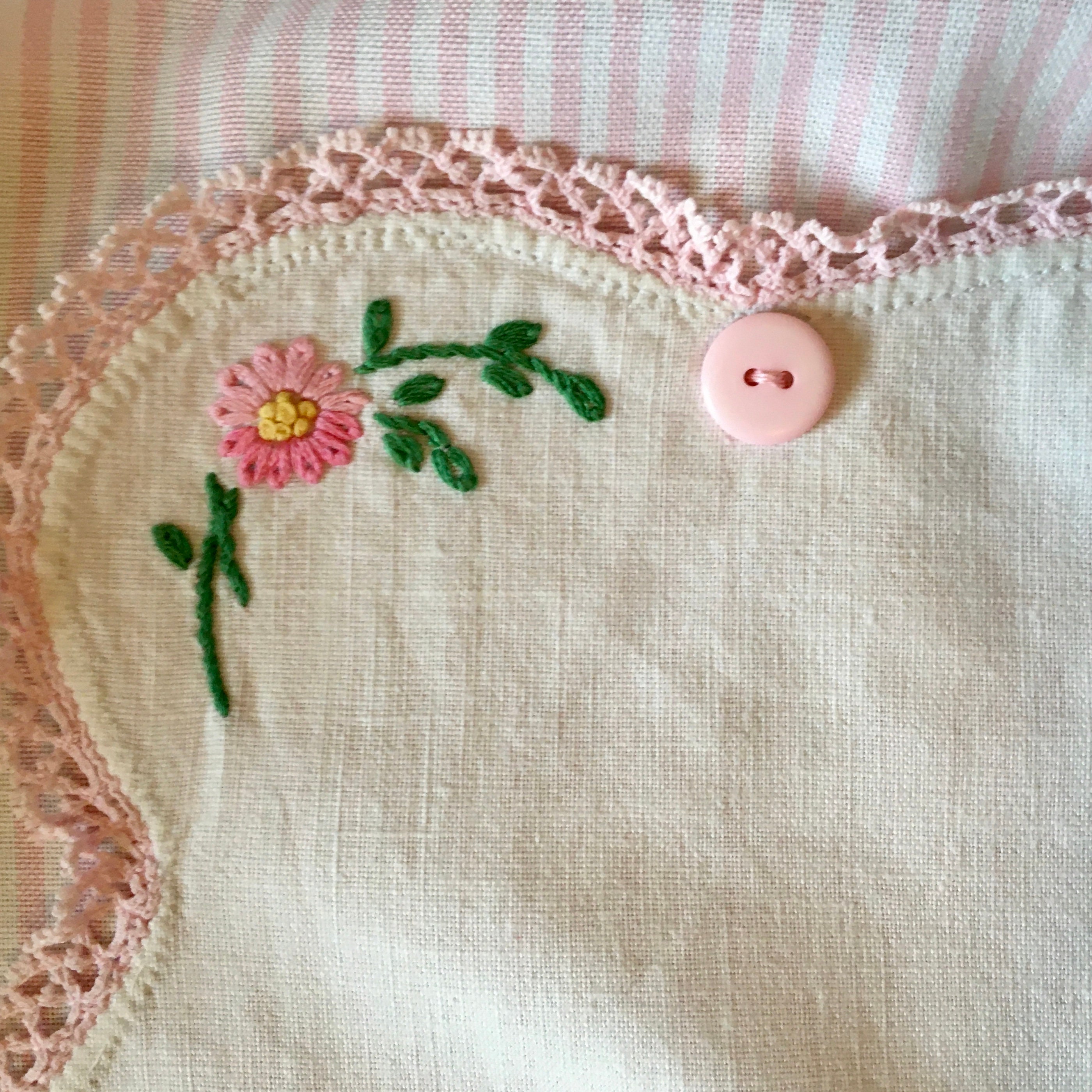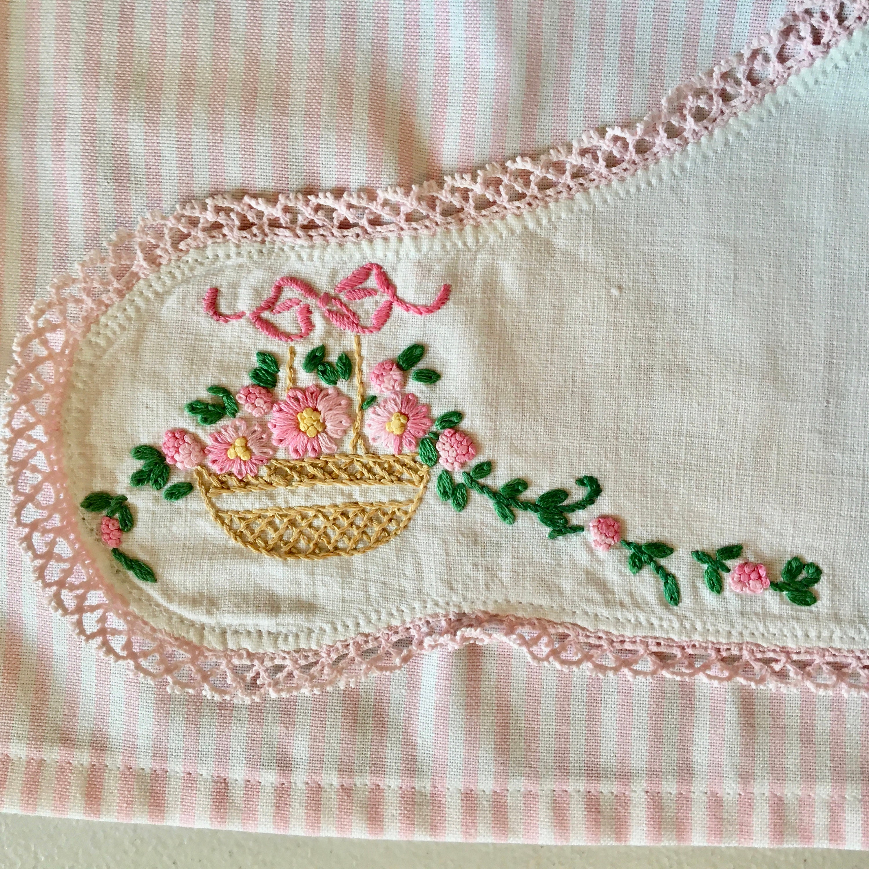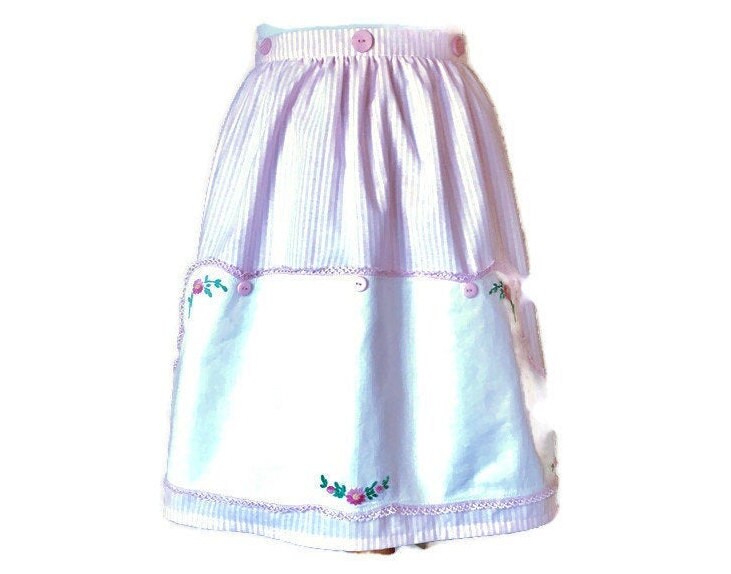 A very unusual dresser scarf (doily) was used for the pocket on this half apron. Pink and white striped fabric was chosen for the apron, waist and ties. The unusually shaped doily is wide in the middle then curves to narrower proportions on each end. The doily was sewn to the apron, with places left to put your hands to make a pocket. The doily features baskets of flowers on each end. Additional flowers are embroidered in the middle bottom and at the top. The flowers are in pink with green stems and leaves. Vintage pink buttons highlight the doily, which is edged with pink lace.