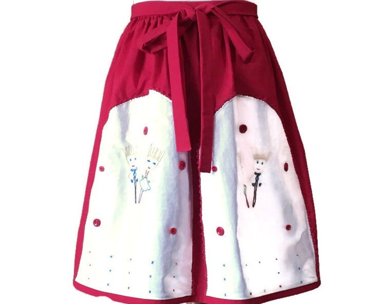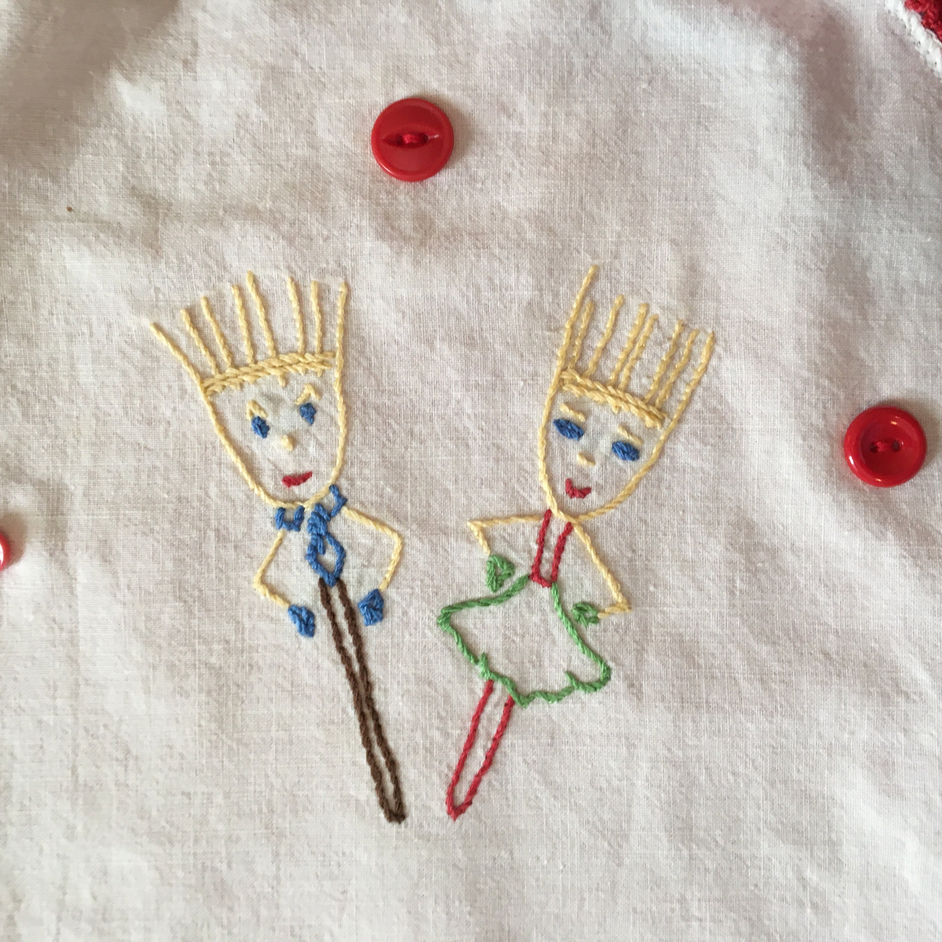 What fun! These vintage embroidered brooms are an unusual choice for embroidery work that makes it a privilege to use this dresser scarf to create a half apron.